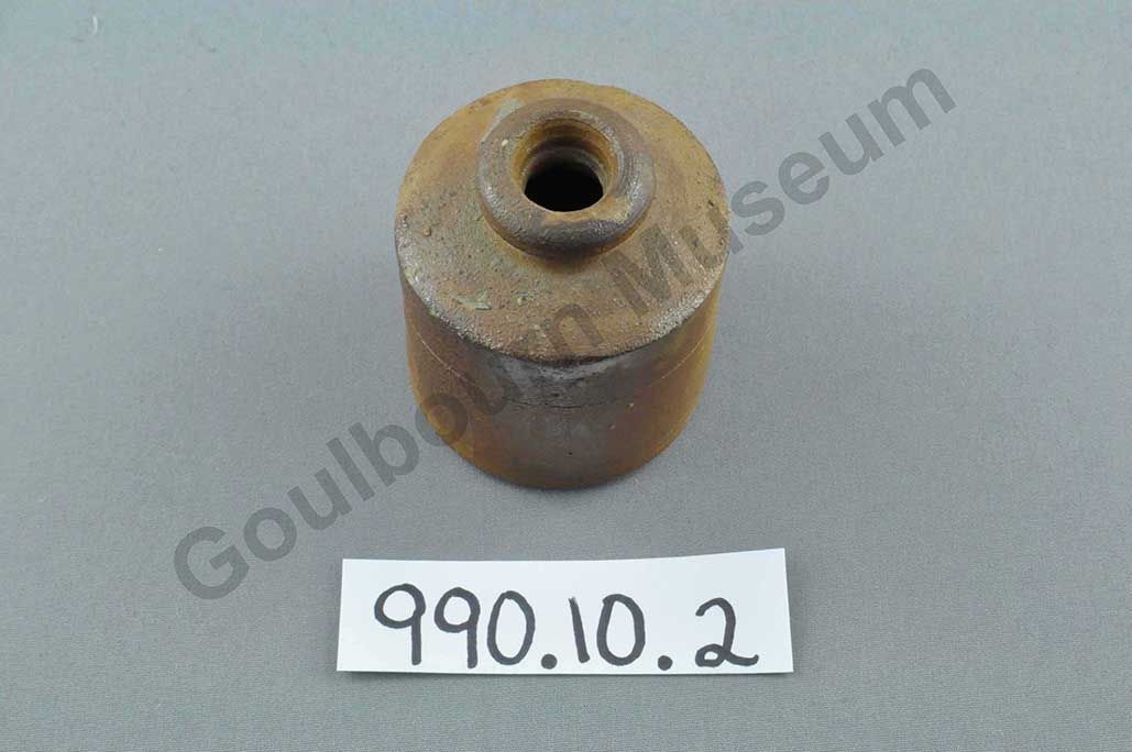 Crockery ink well. Washed up in the garden. Cylindrical pottery ink well with narrow mouth, rolled rim. Glazed.