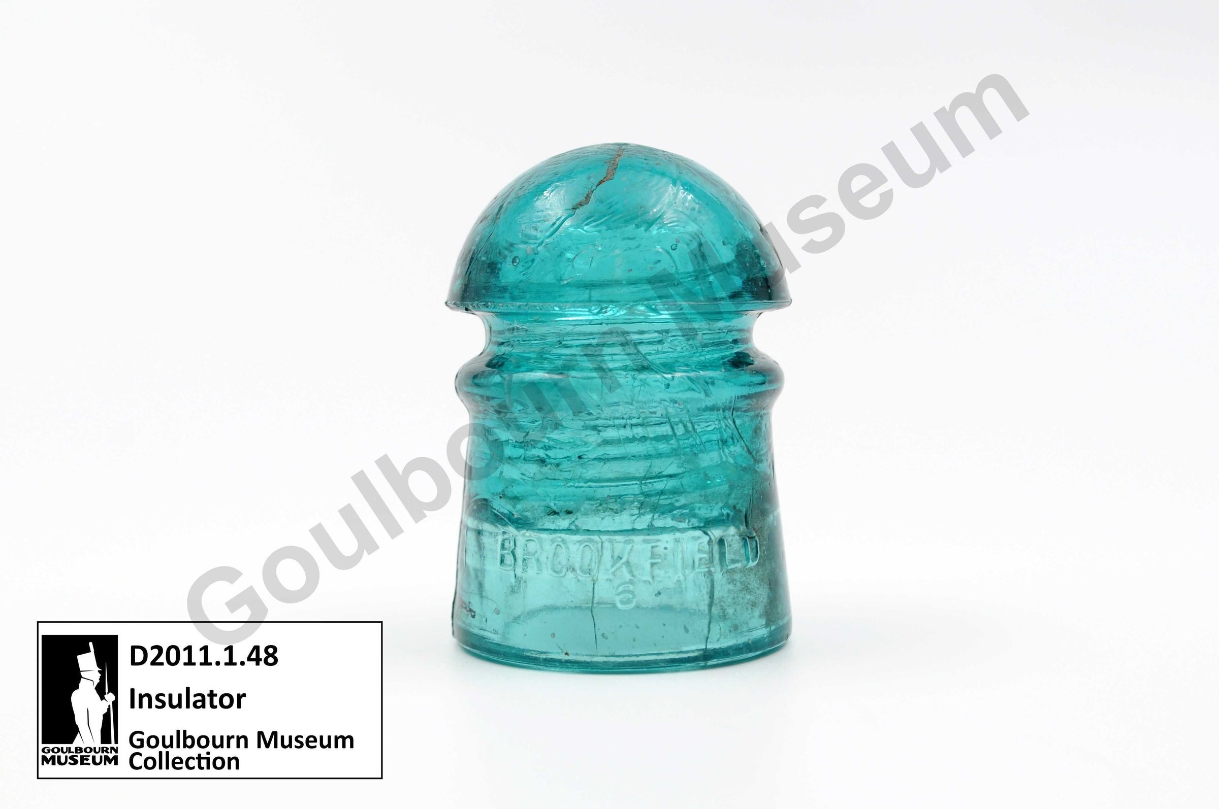 Blue electrical insulator; "Brookfield 6 No.9" is written in raised lettering, near the base. Manufactured by Brookfield Glass Co., a manufacturer of glass products that began producing insulators in the 1870s, when demand for the product increased as a result of the rapid production of telegraph lines.Context