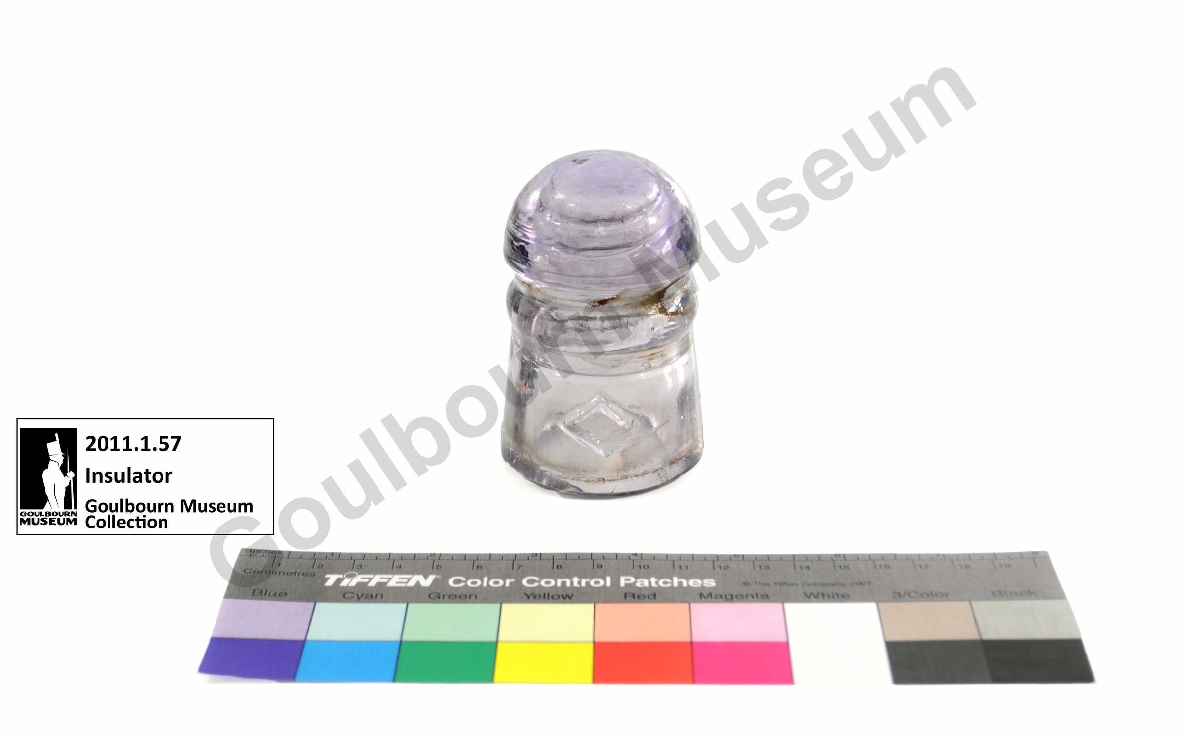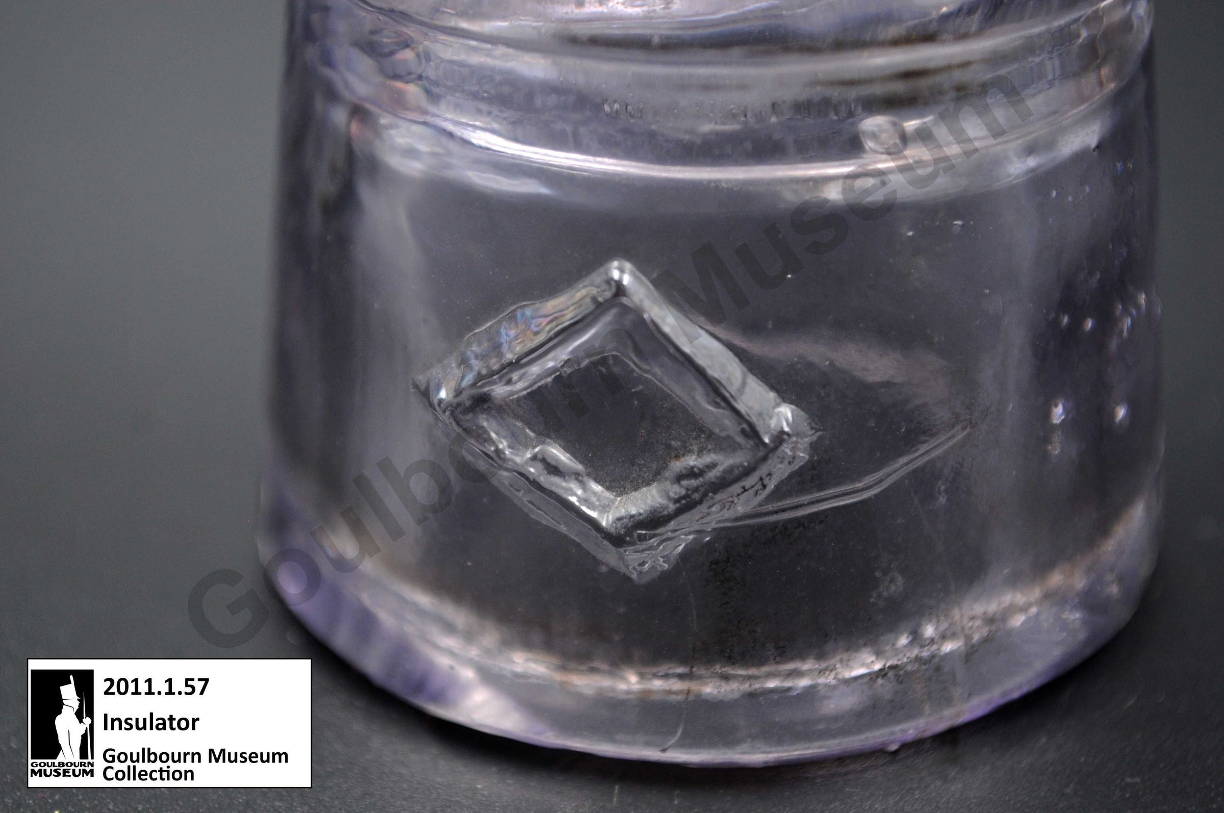This is a clear glass purple electrical insulator that has diamond-shaped makers mark close to the bottom. This maker's mark and its jagged shape indicate it was made by Diamond Glass Company before the company become the Dominion Glass Company. the mould number is CD 102.Context