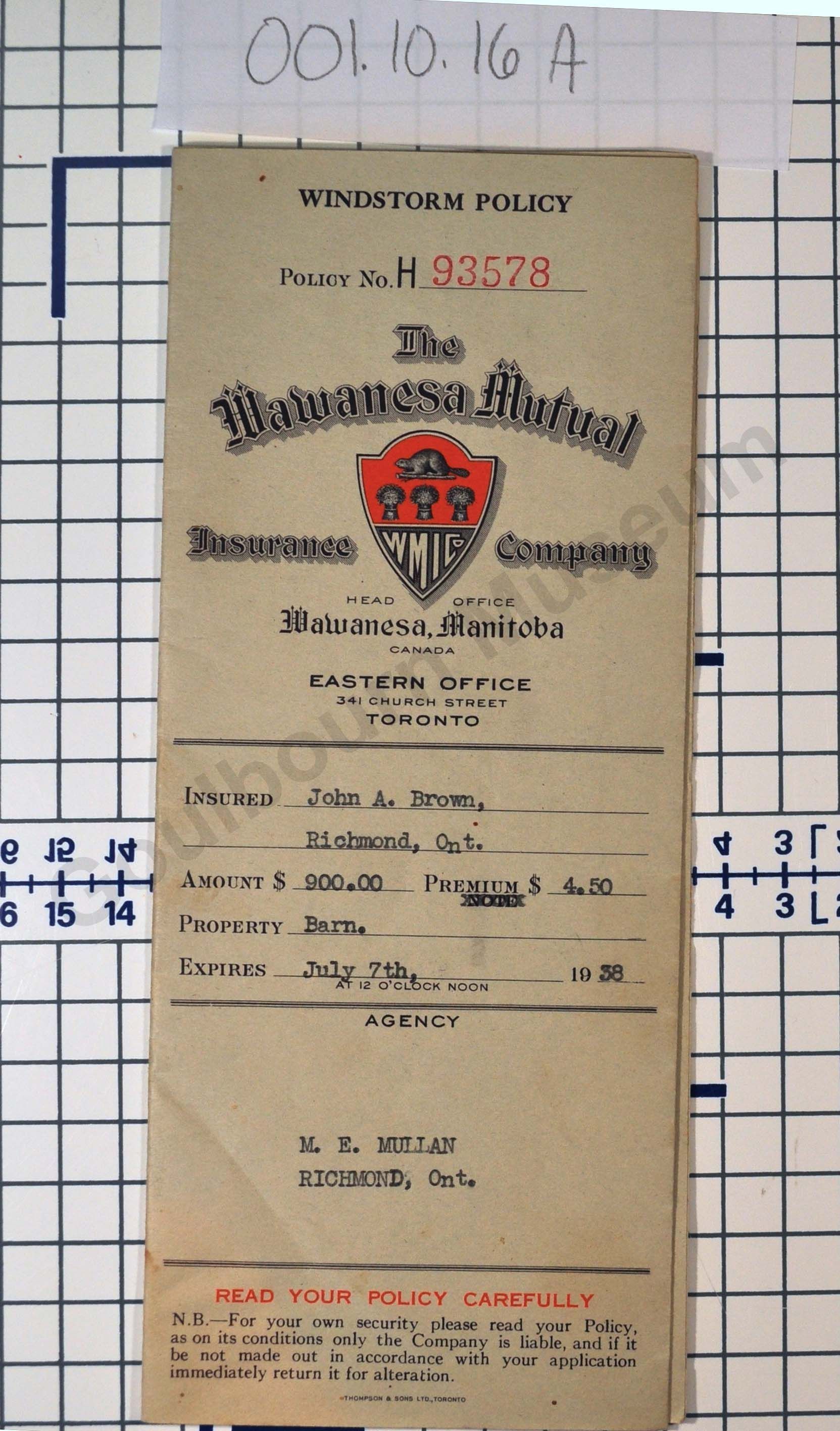 Insurance policy printed on a piece of rectangular paper. Titled "Windstorm Policy, Policy No. H.93578." Text below the title reads: "Mawanesa Mutual Insurance Company, Head Office Mawanesa, Manitoba, Canada. Eastern Office 341 Church Street, Toronto." The logo for Mawanesa Insurance appears in the centre of the text; the logo consists of a shield with a beaver at the top, and the initials "WMICo" below. The policy is registered to John. A. Brown of Richmond, Ontario, for the amount of $900.00 and a premium of $4.50. The policy is for the insurance of a barn, and is dated July 7th, at 12 o'clock noon, 1938. M.E. Mullan is listed as the issuing agent.Collection