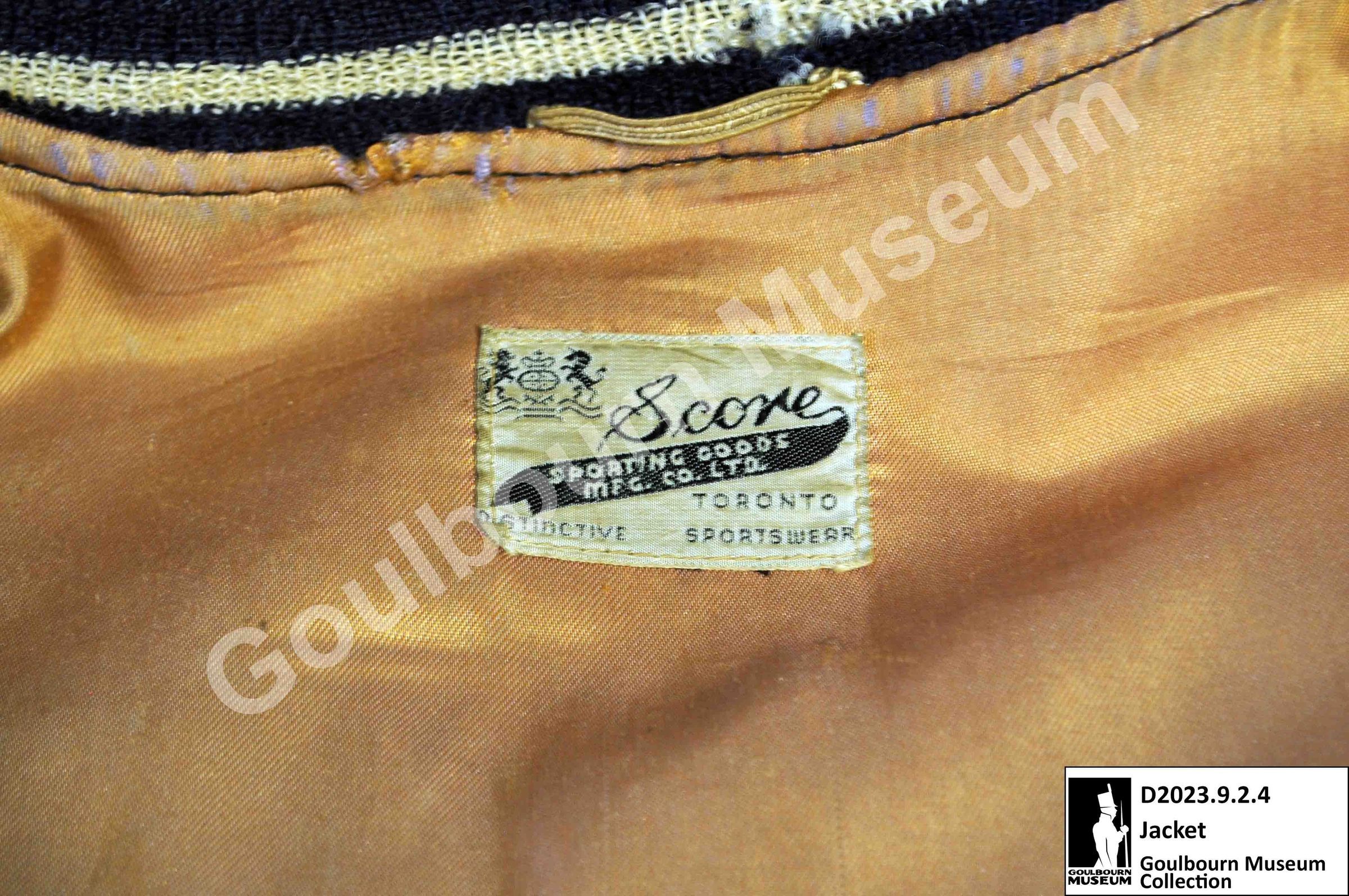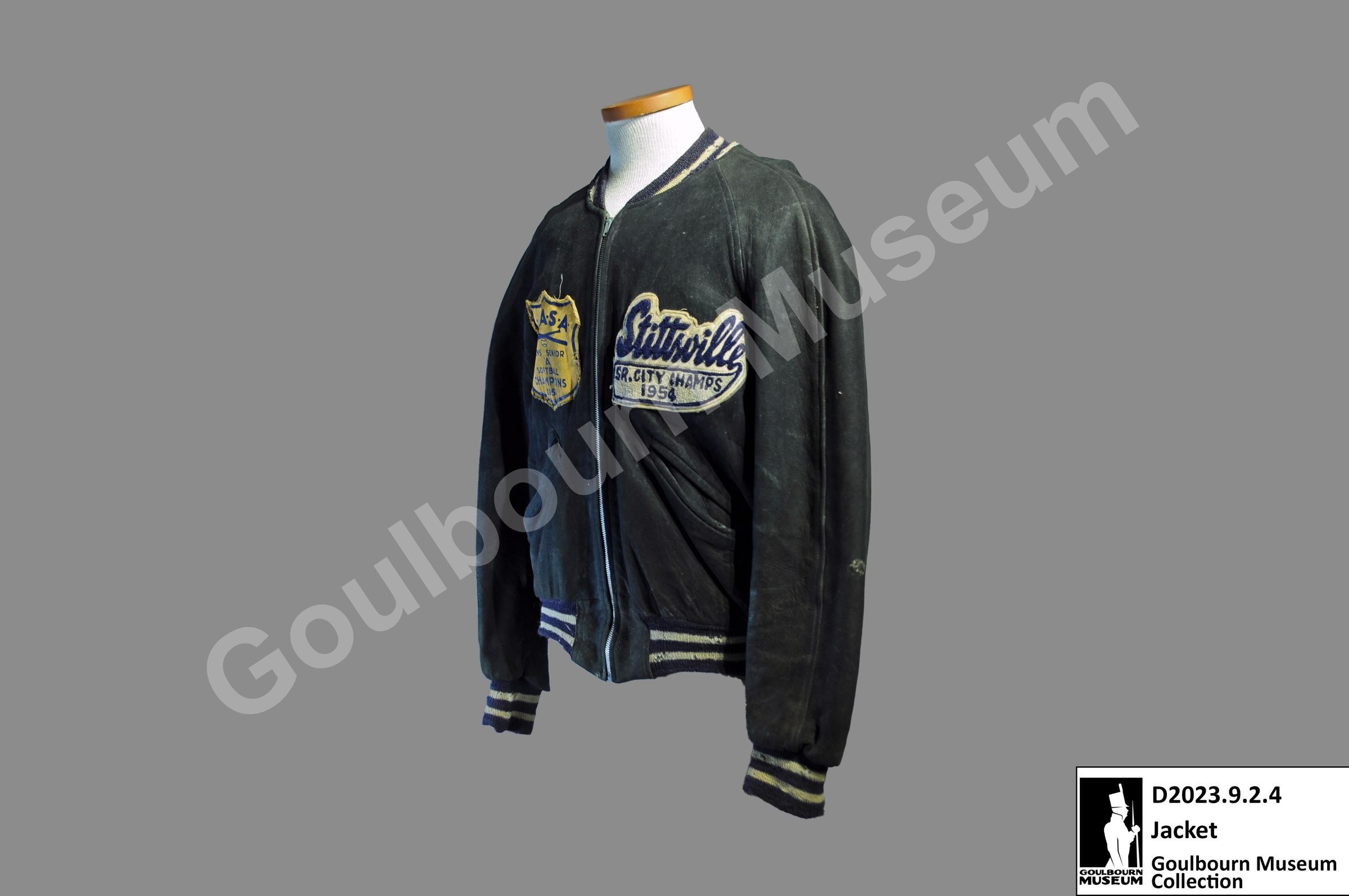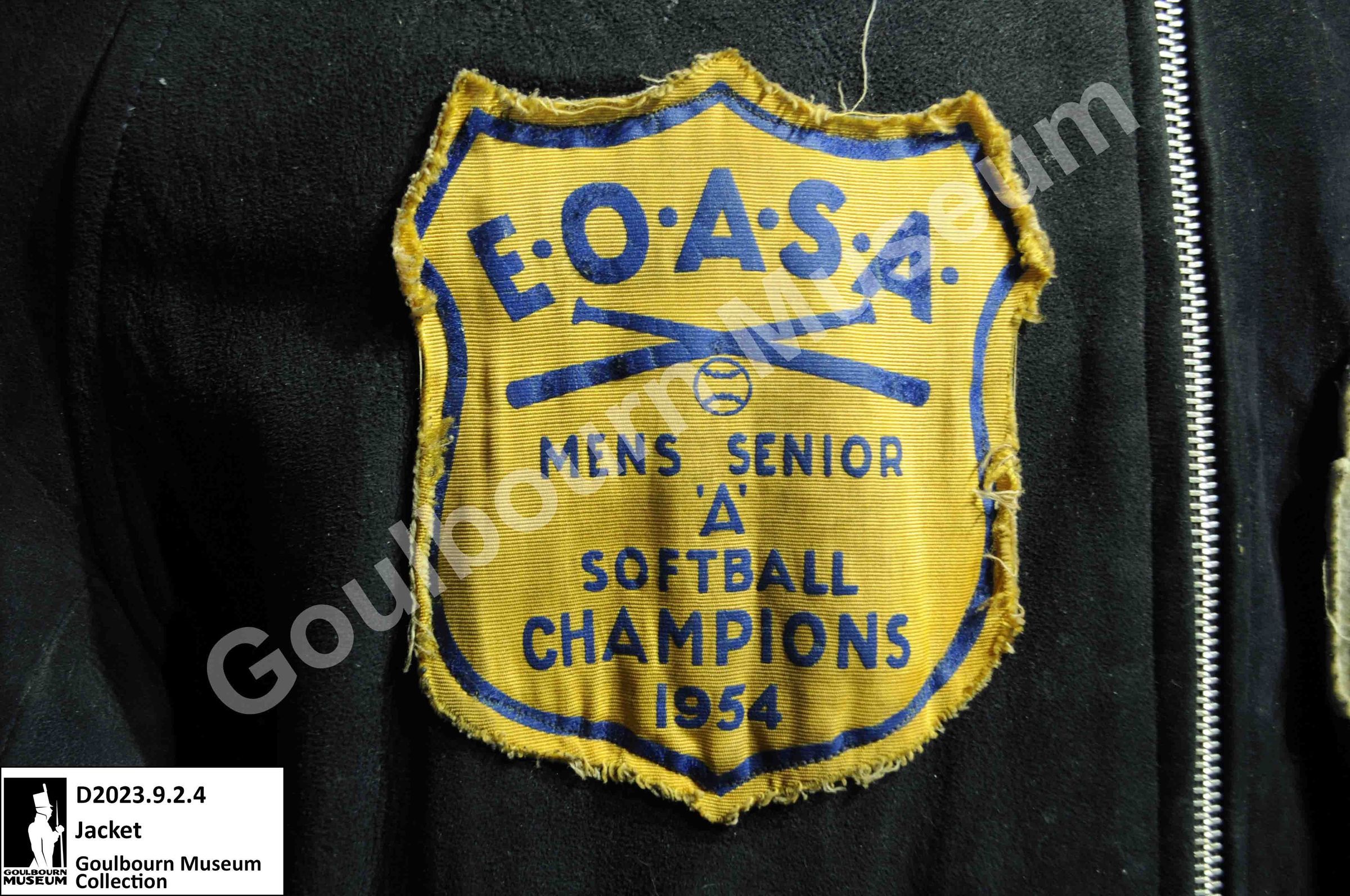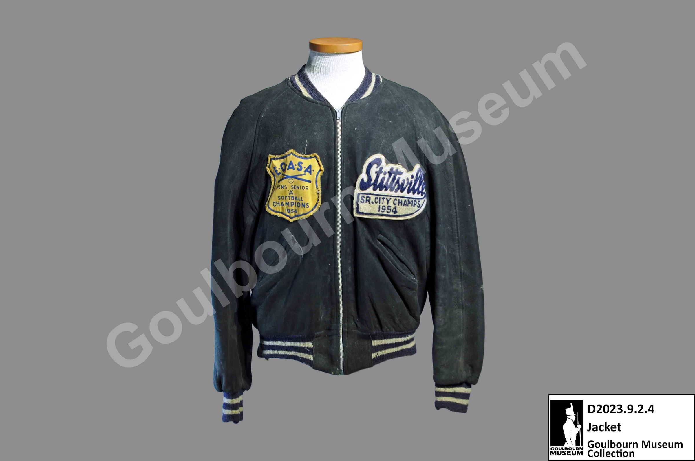 Jacket which belonged to Garnet "Red" Bradley. The black coloured suede jacket has white horizontal stripe accents at the collar and cuffs. The front of the jacket displays two patches, on the proper right a yellow coloured fabric patch has dark blue printed text that reads, "E.O.A.S.A. Mens Senior "[triangle shape]" Softball Champions 1954." On the proper left the white fabric patch has dark blue writing that reads, "Stittsville Sr. City Champs 1954."Context