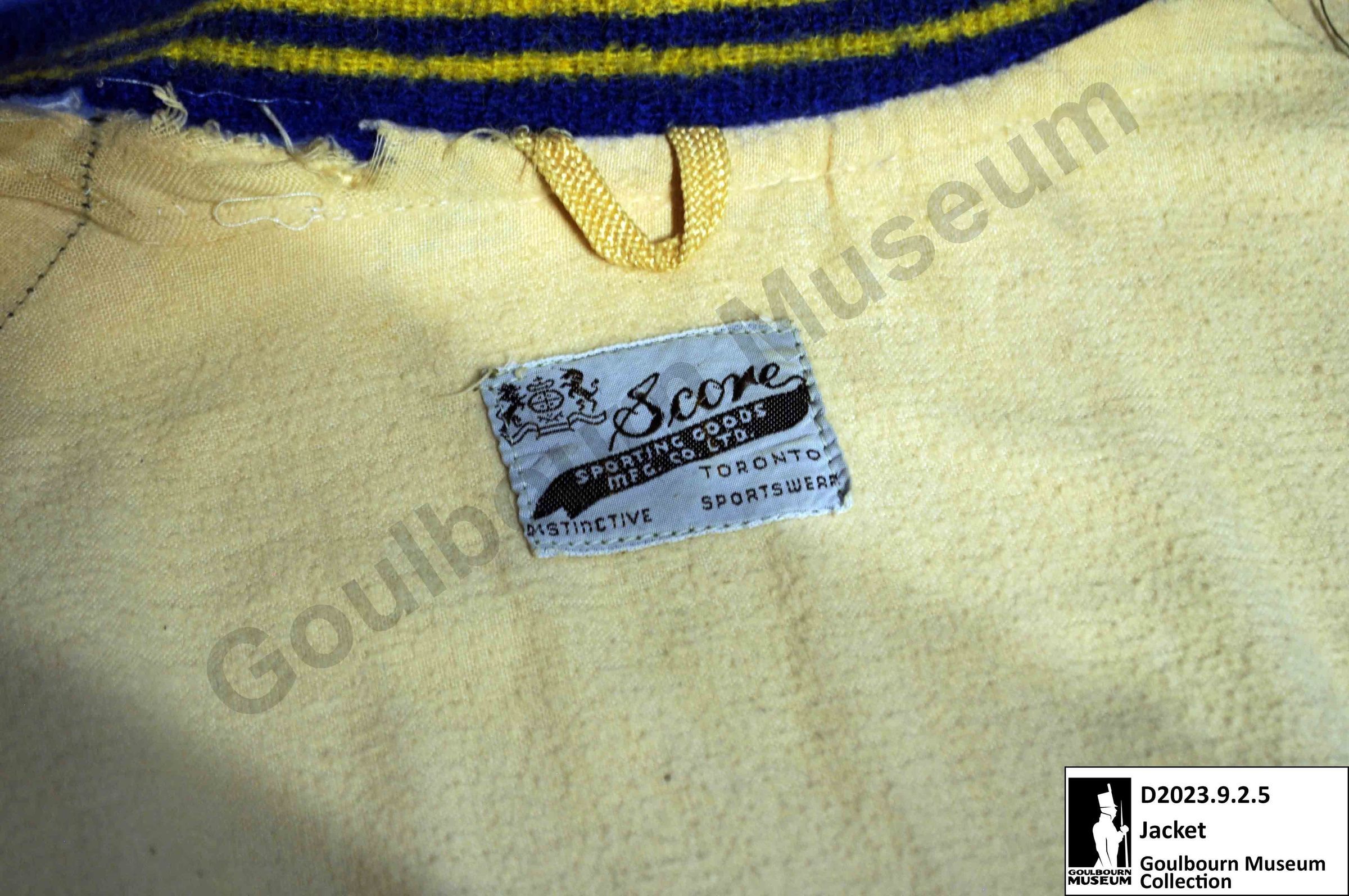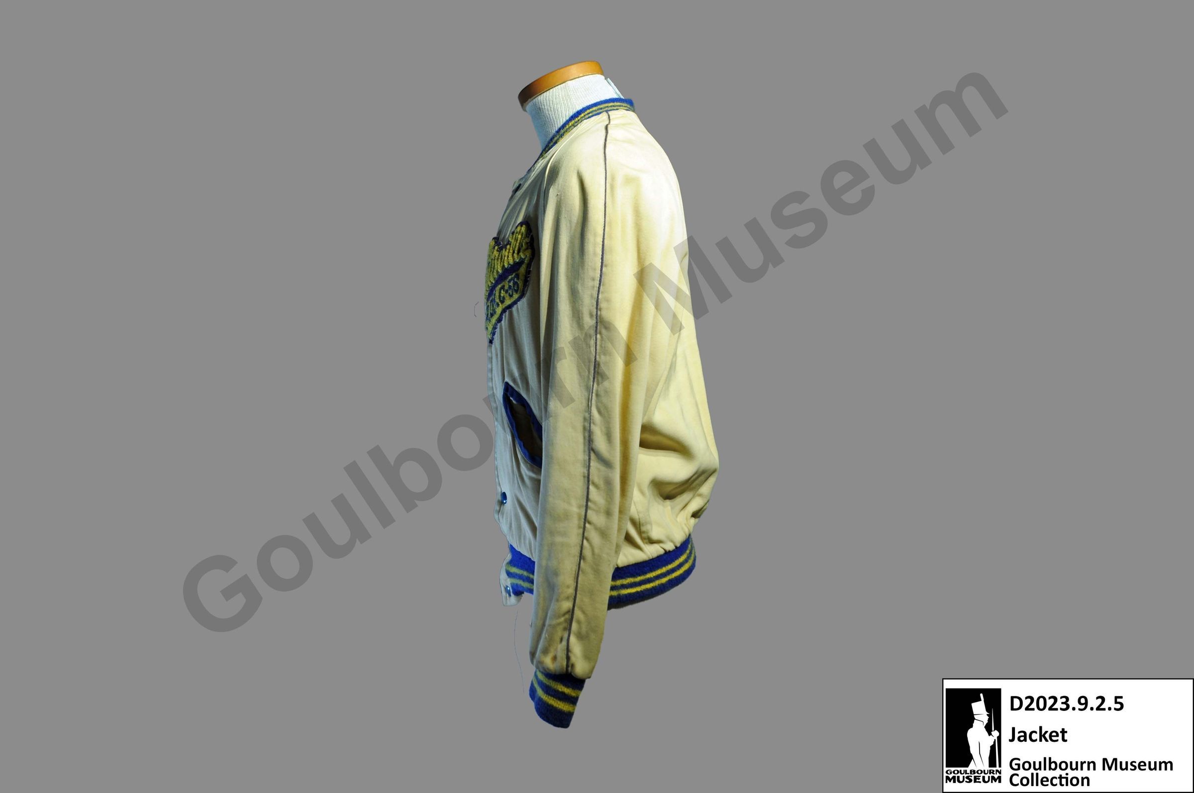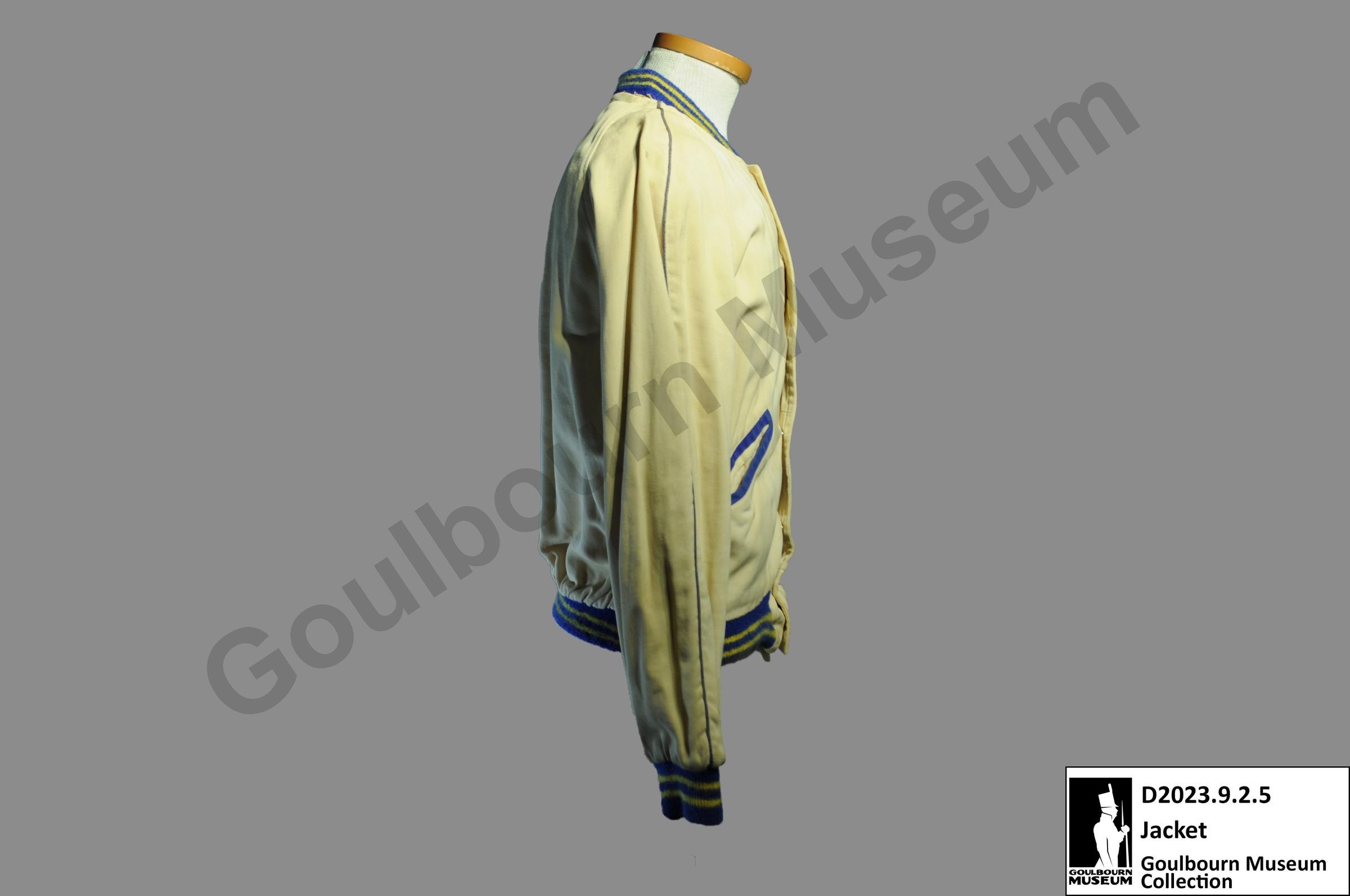 One letterman's jacket. The jacket is made from a cream-colored fabric with yellow and blue sleeve cuffs, collar, and bottom edge. The front of the jacket has 7 blue buttons, one breast patch, and two pockets. The opening of the pockets is lined with the same blue fabric as the sleeve cuffs, collar, and bottom edge.Context