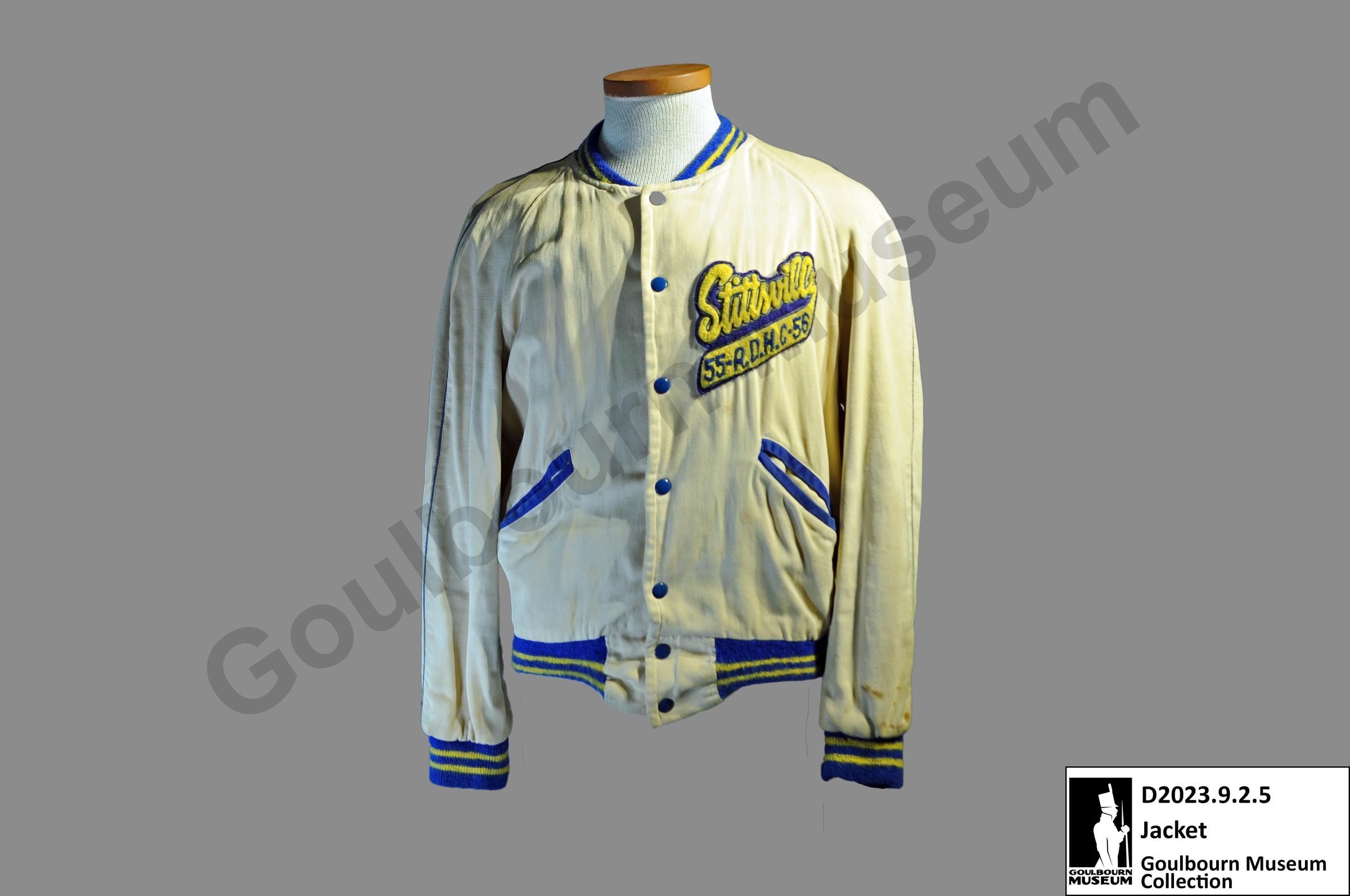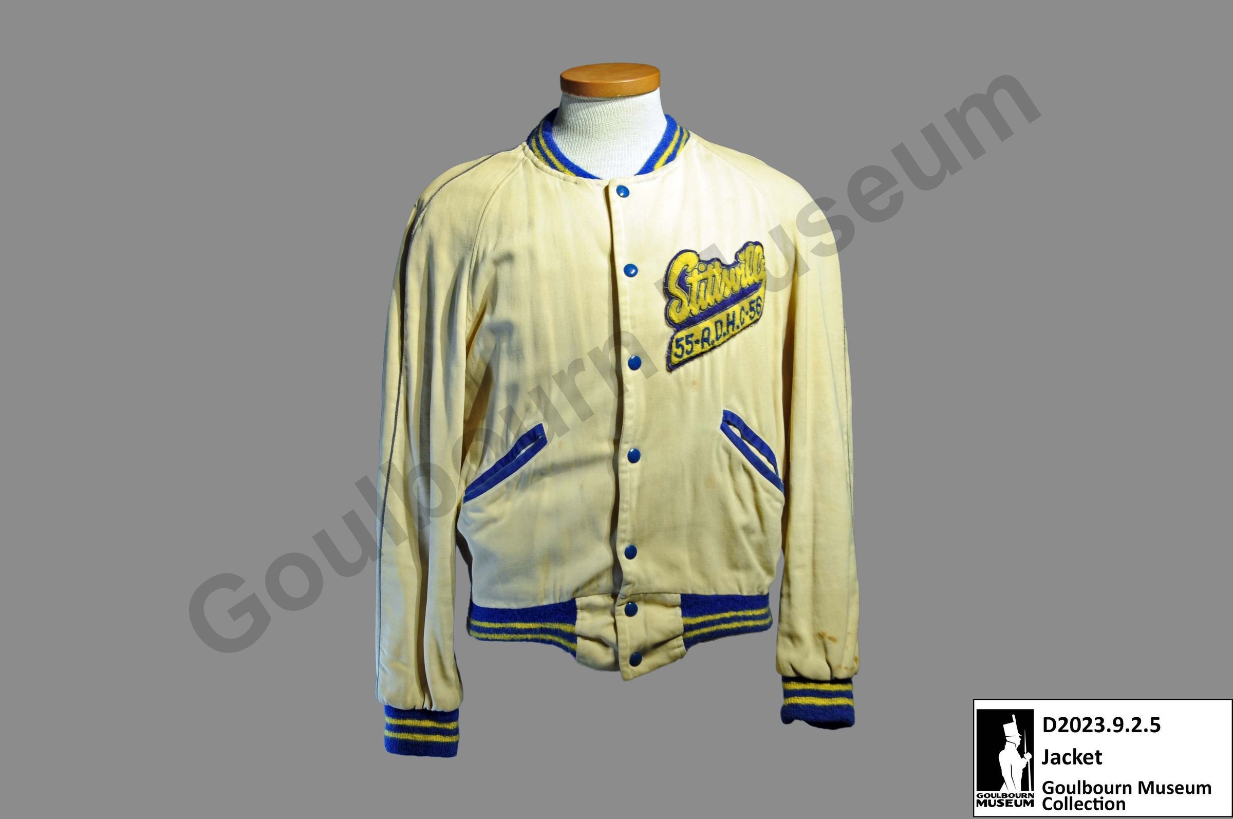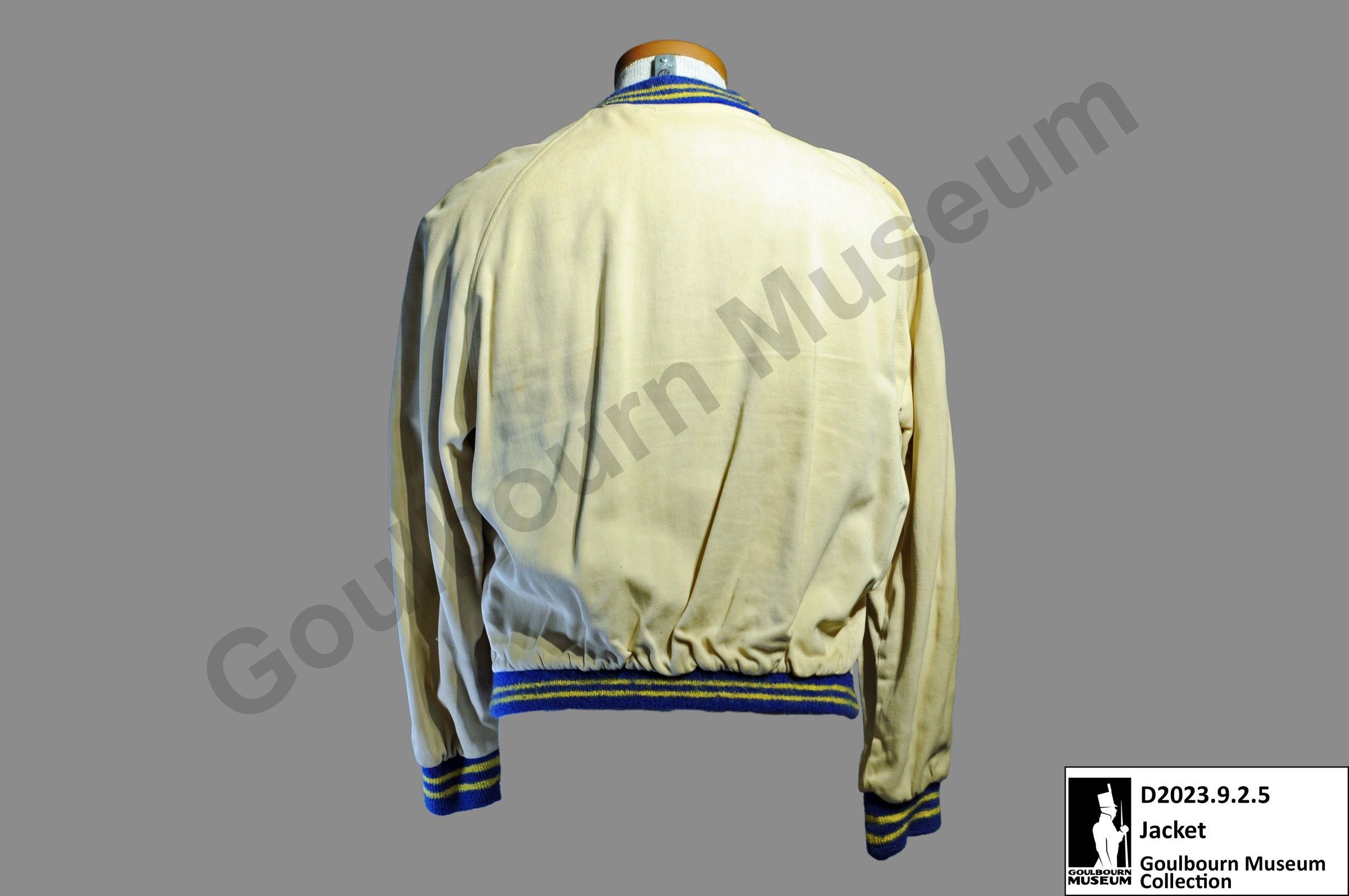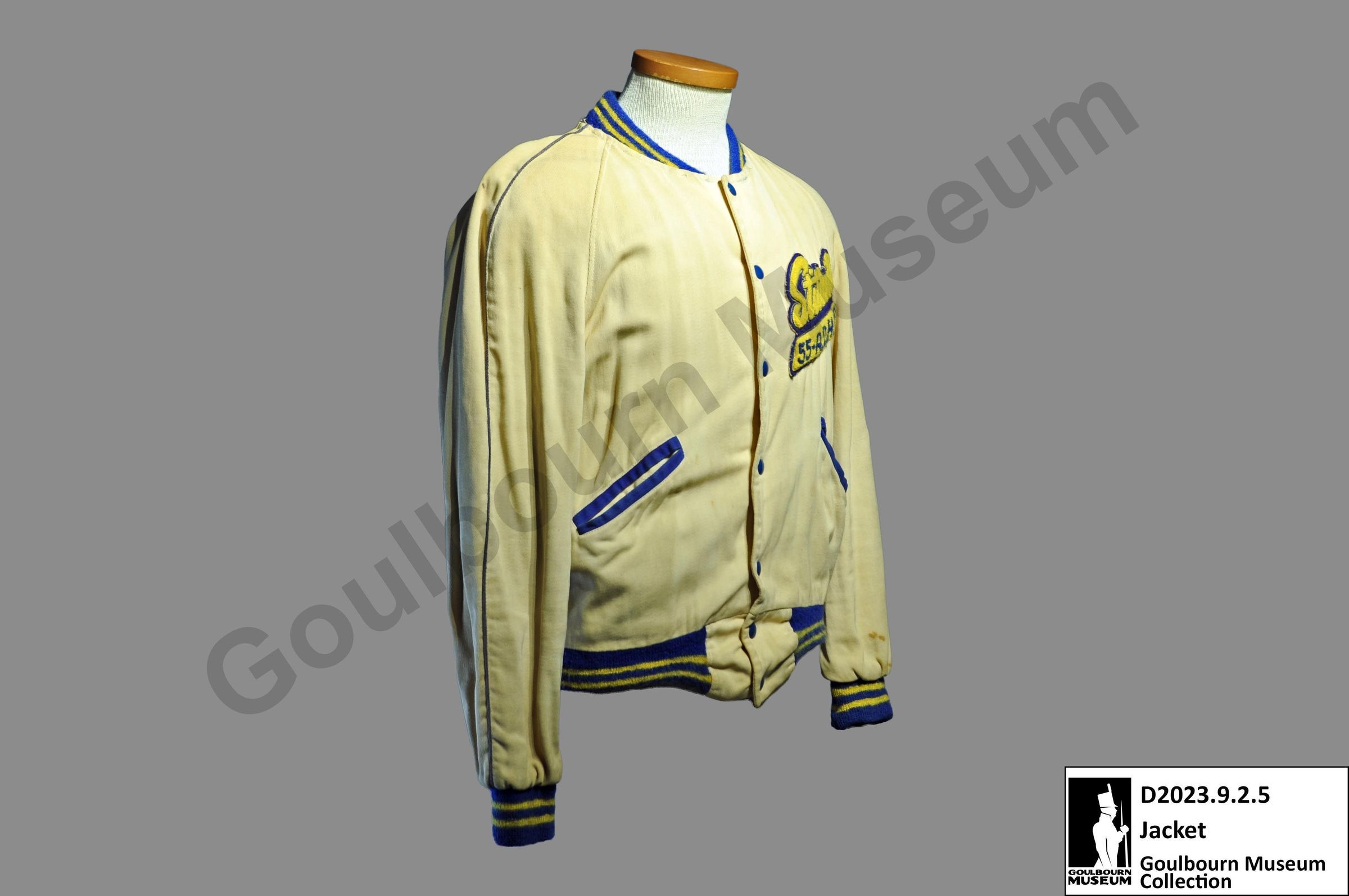 One letterman's jacket. The jacket is made from a cream-colored fabric with yellow and blue sleeve cuffs, collar, and bottom edge. The front of the jacket has 7 blue buttons, one breast patch, and two pockets. The opening of the pockets is lined with the same blue fabric as the sleeve cuffs, collar, and bottom edge.Context
