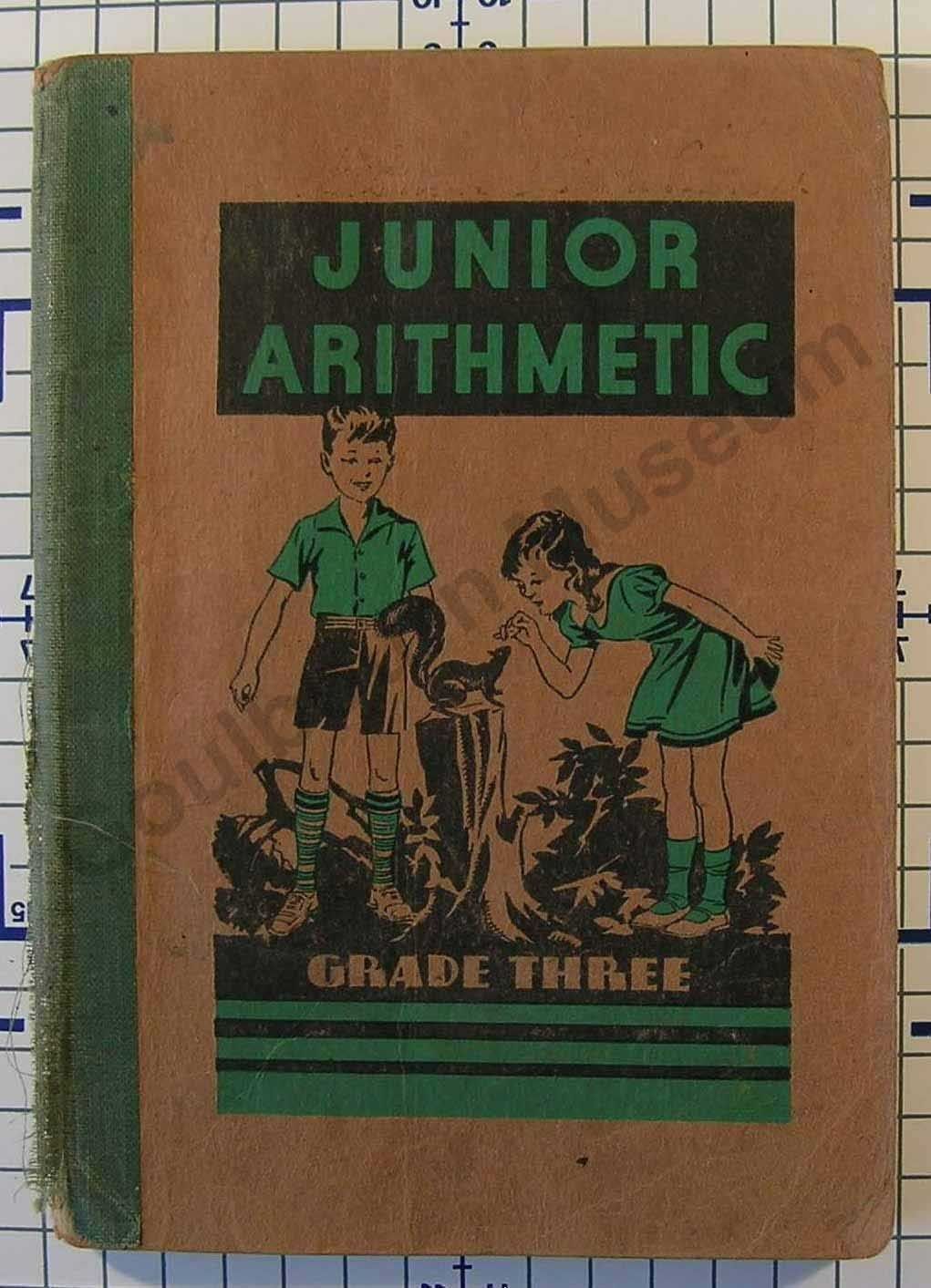 Light brown book with black and green text reading "Junior Arithmetic. Grade Three" with cover depicting a young boy and girl feeding a squirrel.