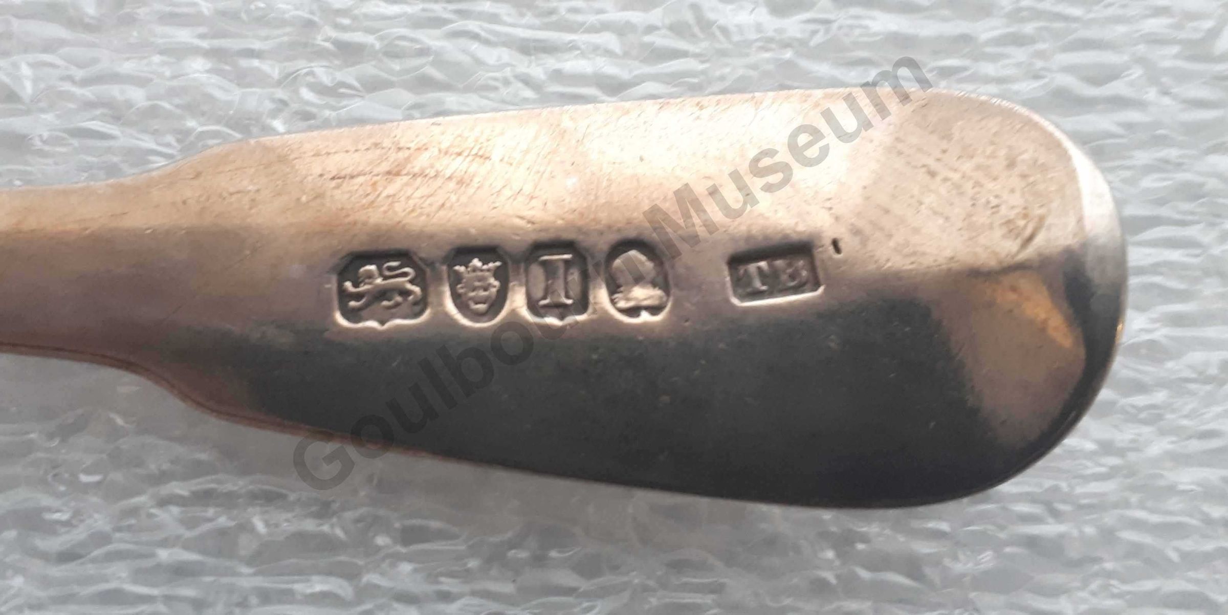 Lion Passant: British silver between 1598 and 1820 Crowned Lion Head: London Assay Office Capital I within a particular shape: Assayed in 1804 (assay marks change in May, therefore assayed between May 1804 and May 1805) Sovereign Head: "Duty Mark" used between 1784 and 1890 to certify duty payment TB within rectangle: Maker's mark for Thomas Wilkes Barker. This mark registered in 1805 (in 1804 he was still registered under Christopher and Thomas Wilkes Barker") this places the gravy spoon as passing through the London Assay Office between January to May of 1805.Context
