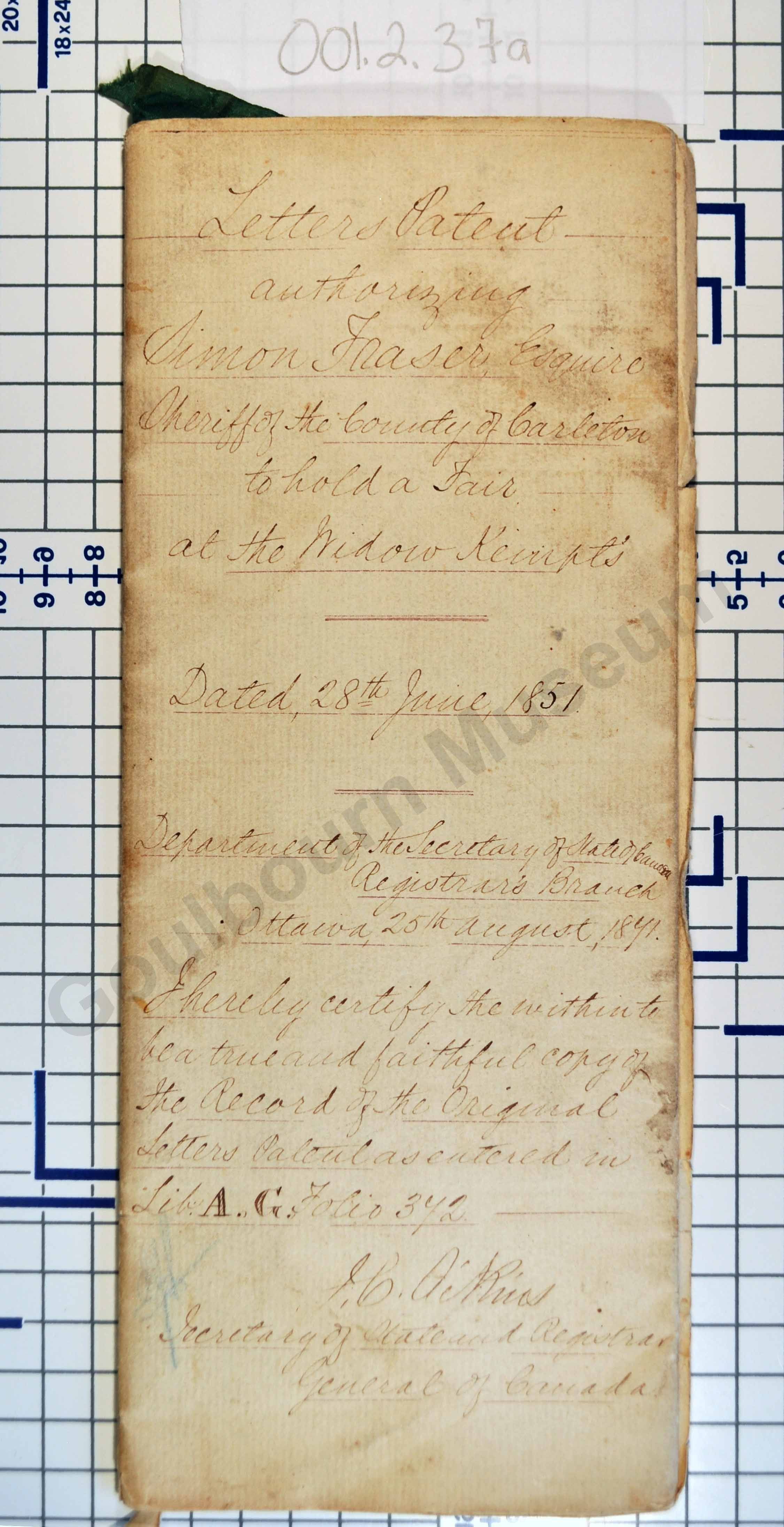 Letters Patent authorizing Simon Fraser Esquire Sheriff of the County of Carleton to hold a Fair at the Widow Kempt's