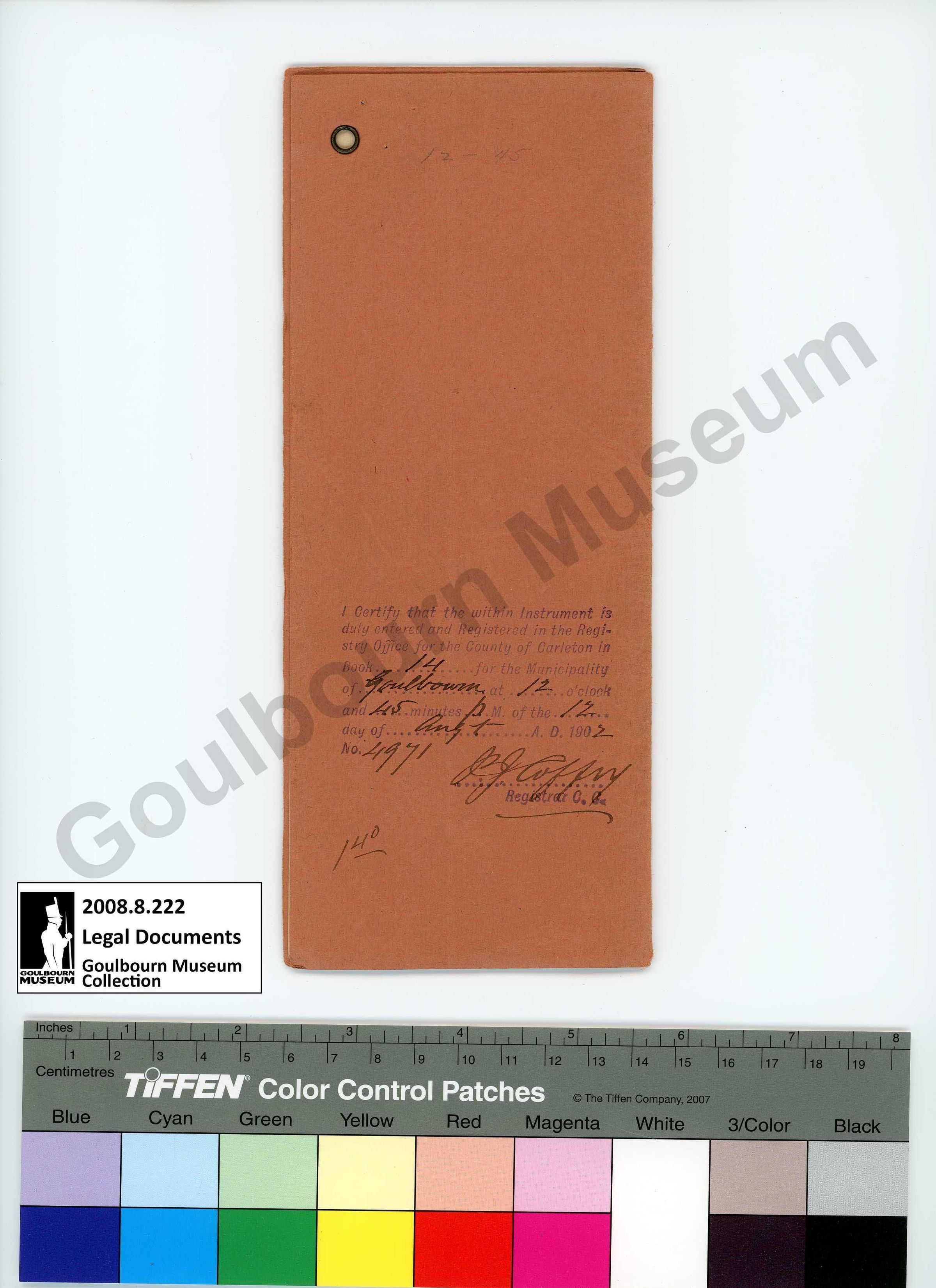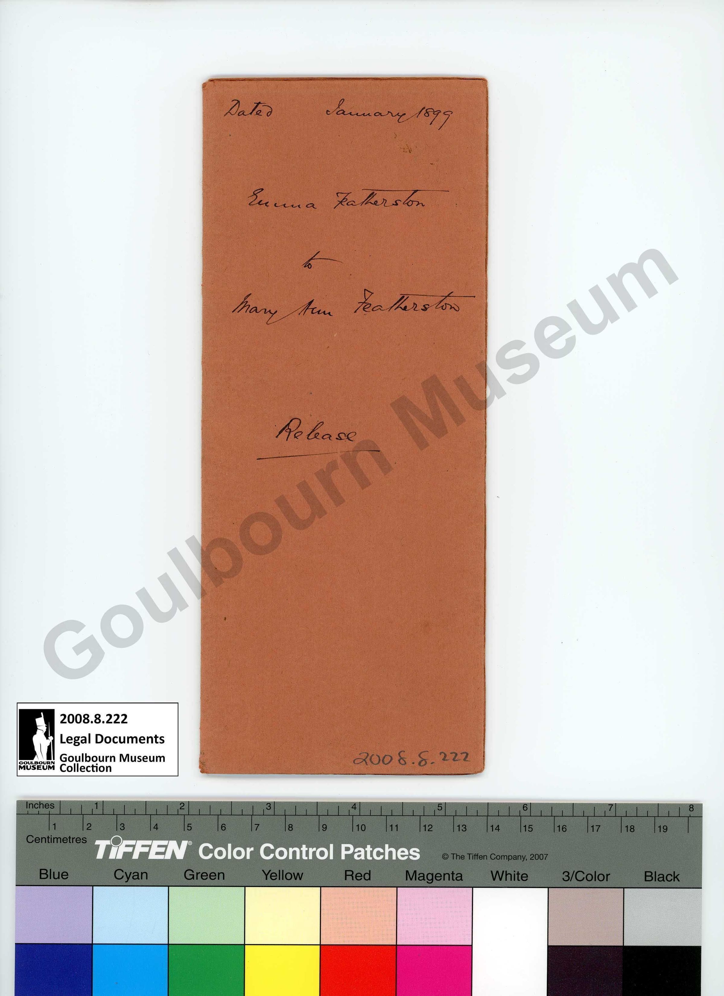 The artefact is an exchange of land between Emma and Mary Ann Featherston from 1899. The front cover reads "Dated January 1899. Emma Featherston to Mary Ann Featherston. Release." The reverse reads "I certify that the within instrument is duly entered and registered in the registry office for the county of Carleton in book 14 for the municipality of Goulbourn at 12 o'clock and 45 minutes P.M of the 12 day of August A.D. 1905 NO 4971 P.J. Coffey Registrar C.C."Collection