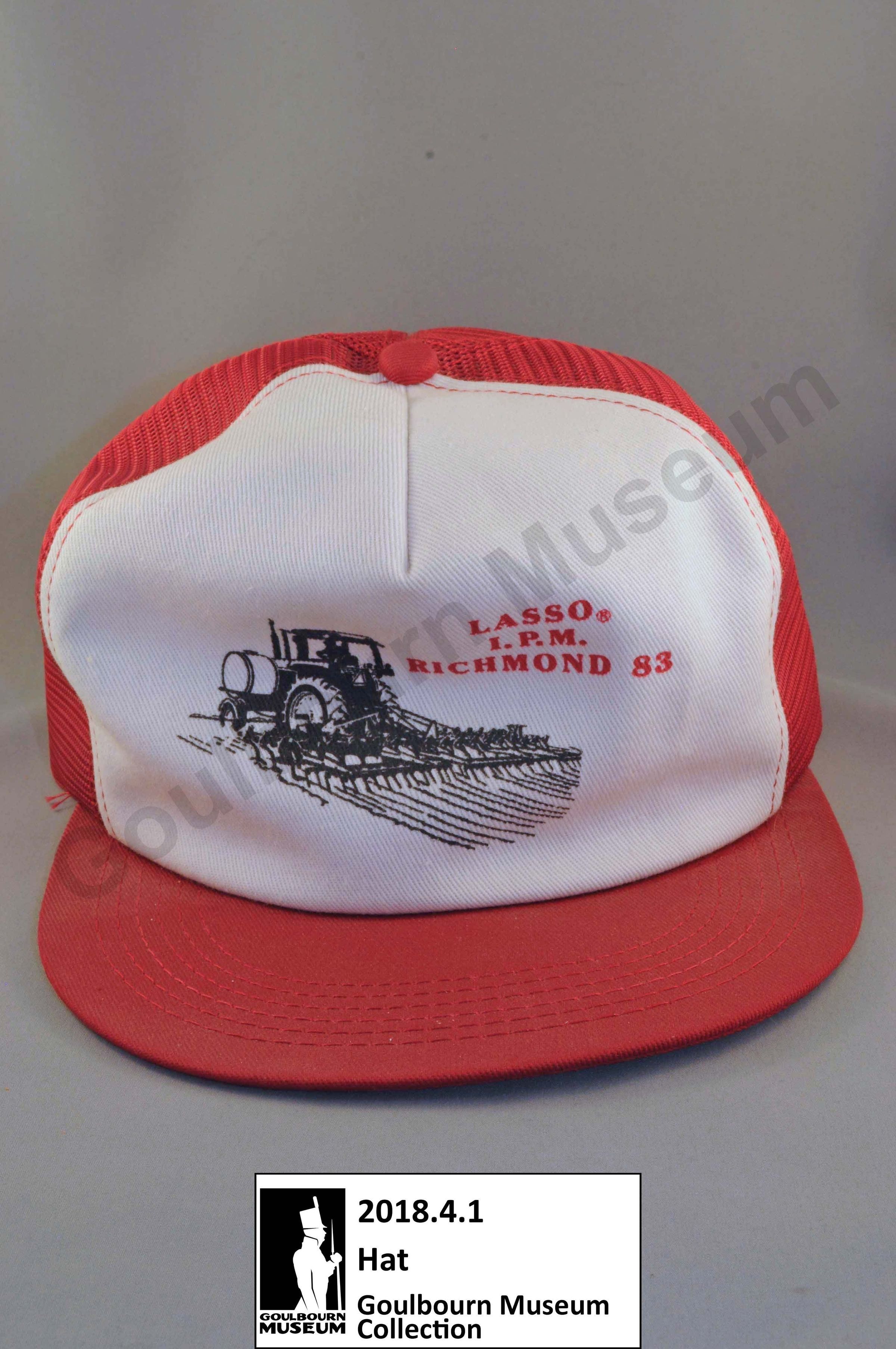 The object is a fabric and mesh cap with a plastic head strap. The mesh is red making up the back portion of the hat. There is white fabric for the front of the hat which features red text reading "LASSO, I.P.M RICHMOND 83". There is also an illustration of a tractor ploughing a field. On the inside of the hat is a manufacturer tag which provides information of the ratio of cotton, polyester, mesh, and nylon material. There is also the name of K-Brand LTD and their company symbol.Context