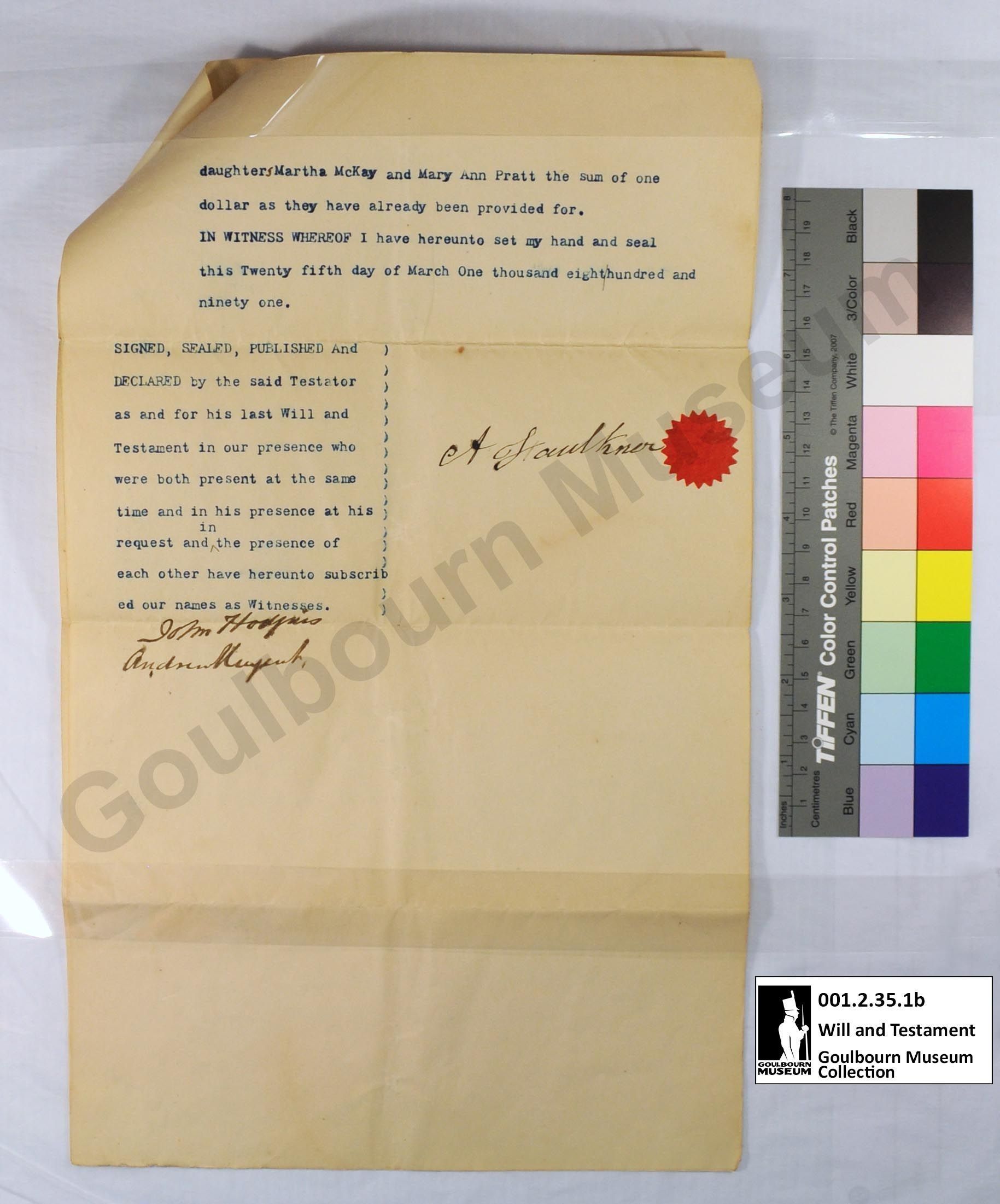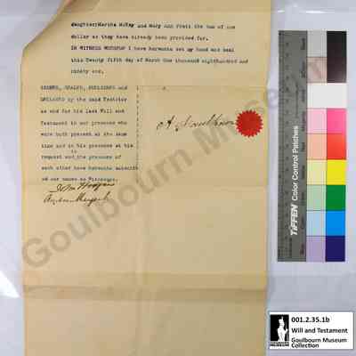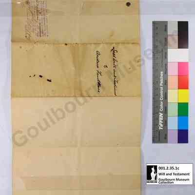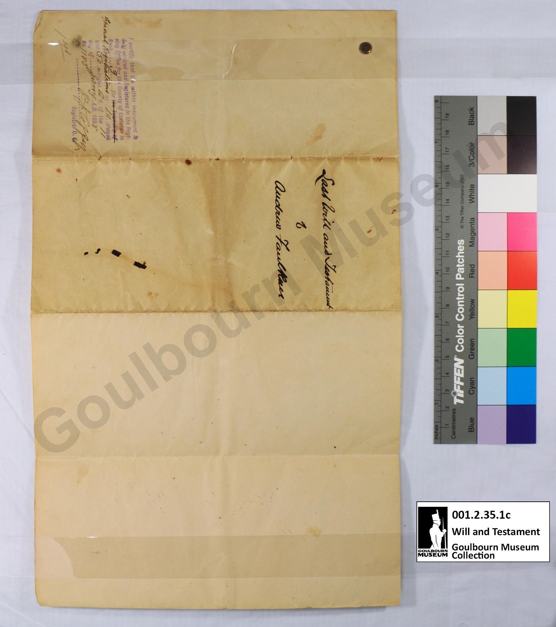 This object is the last will and testament of Andrew Faulkner. It is dated to 1891. It is a three page document held together with a yellow brass pin located at the top proper right corner; the pin enters through the back page and spreads on the front. The support is a cream colored paper, the same paper is used for all pages. The medium is blue printed ink. Signatures are rendered in a black handwritten ink. There is a blue rubber stamp imprint, rendered in blue ink, located at the proper top right corner of the back; this consists of seven lines of script and the fields have been filled in by hand with a black handwritten ink.