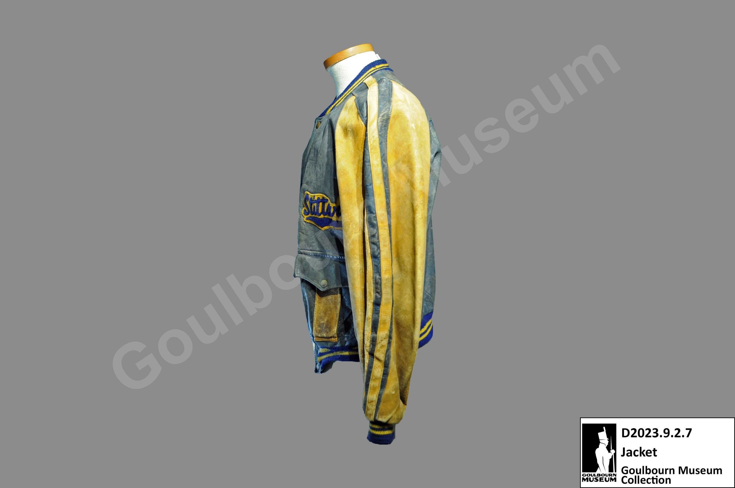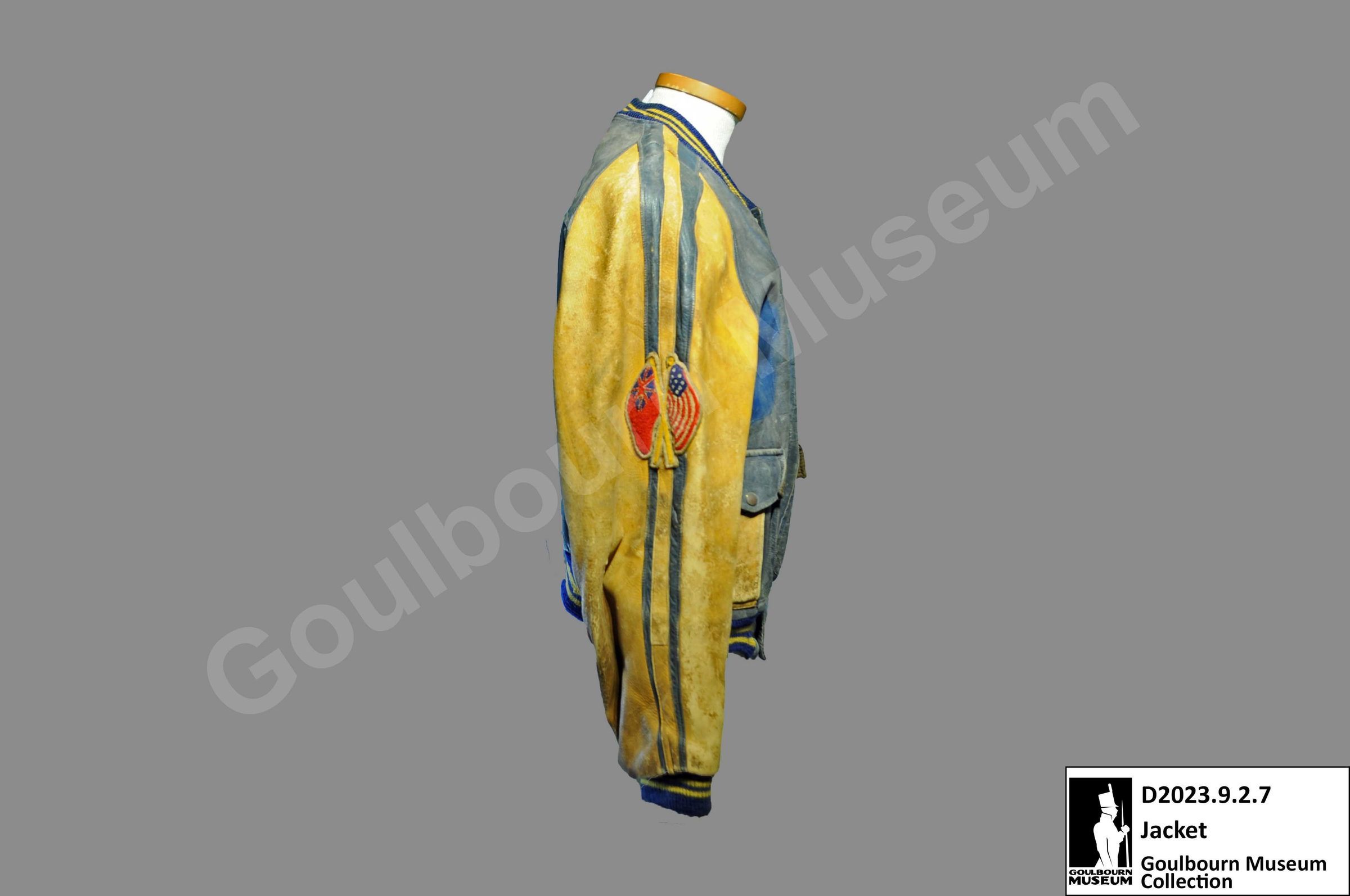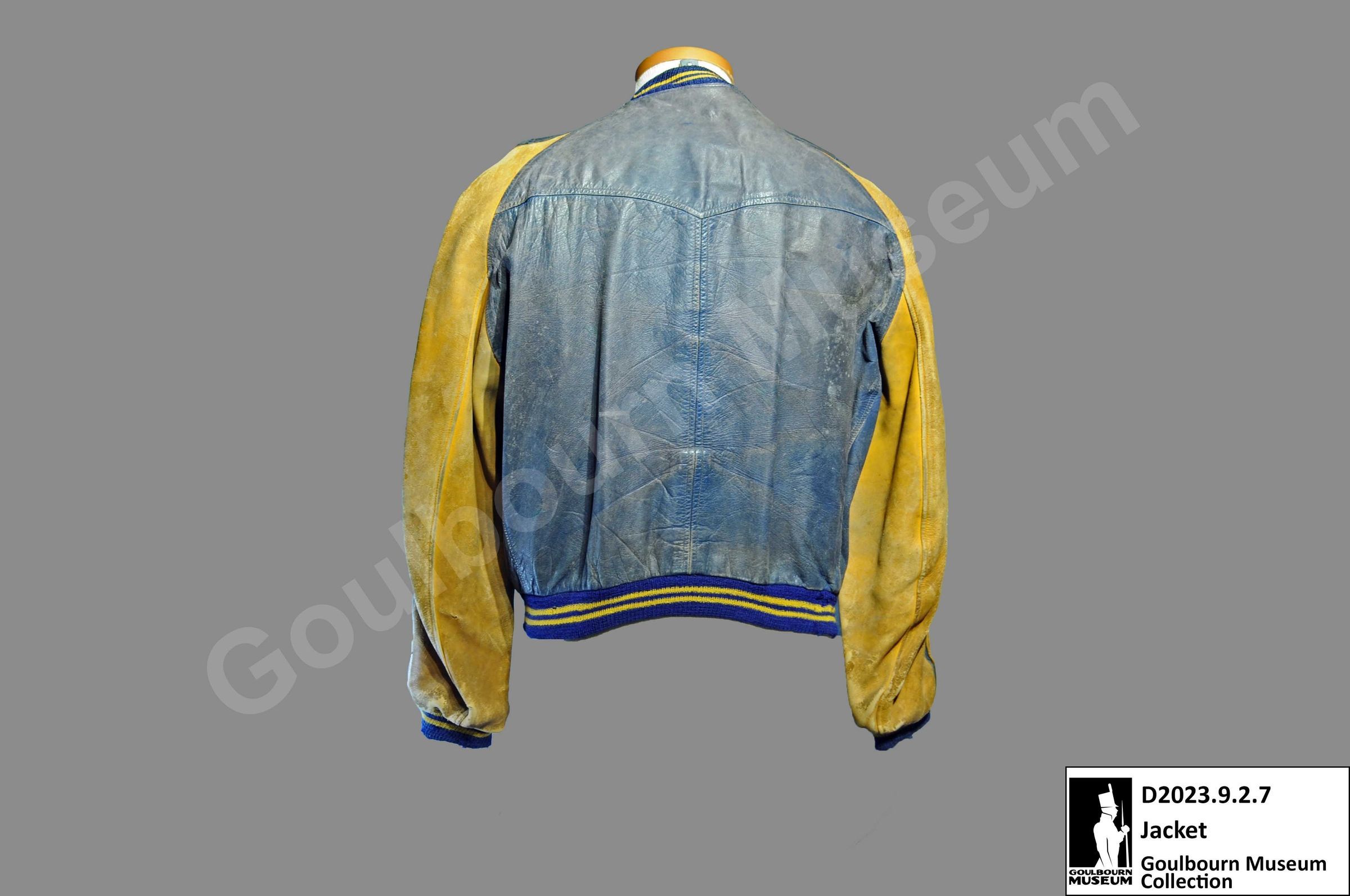 One letterman's jacket. The main body of the jacket is blue leather with vertical yellow leather stripes down the pockets. The jacket sleeves are yellow leather with blue stripes from the collar to the wrists. The sleeve cuffs, collar, and bottom edge of the jacket are blue and yellow stripes. The front has seven metal buttons plus two buttons for each pocket. There is a patch on the left breast area and the right sleeve. There is a spot on the right breast area that appears less worn than the rest of the jacket, this is because a patch was removed.Context