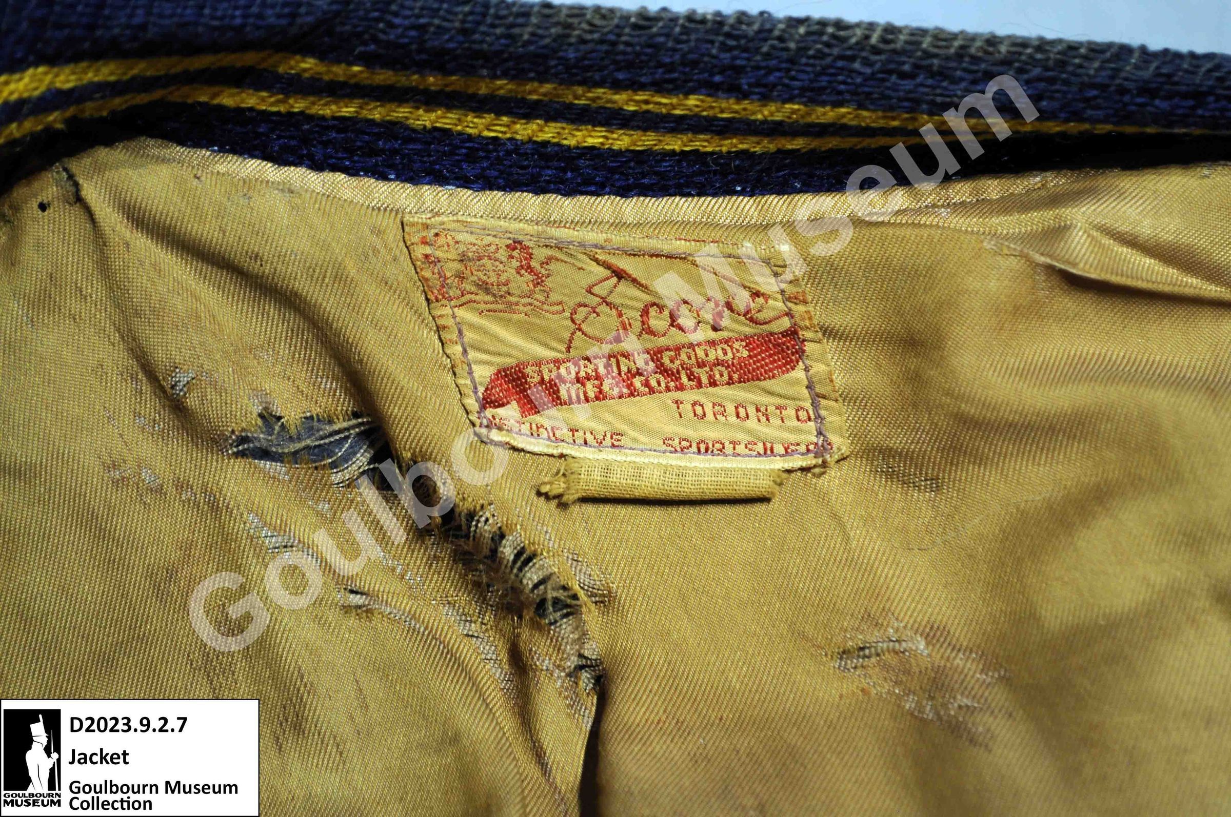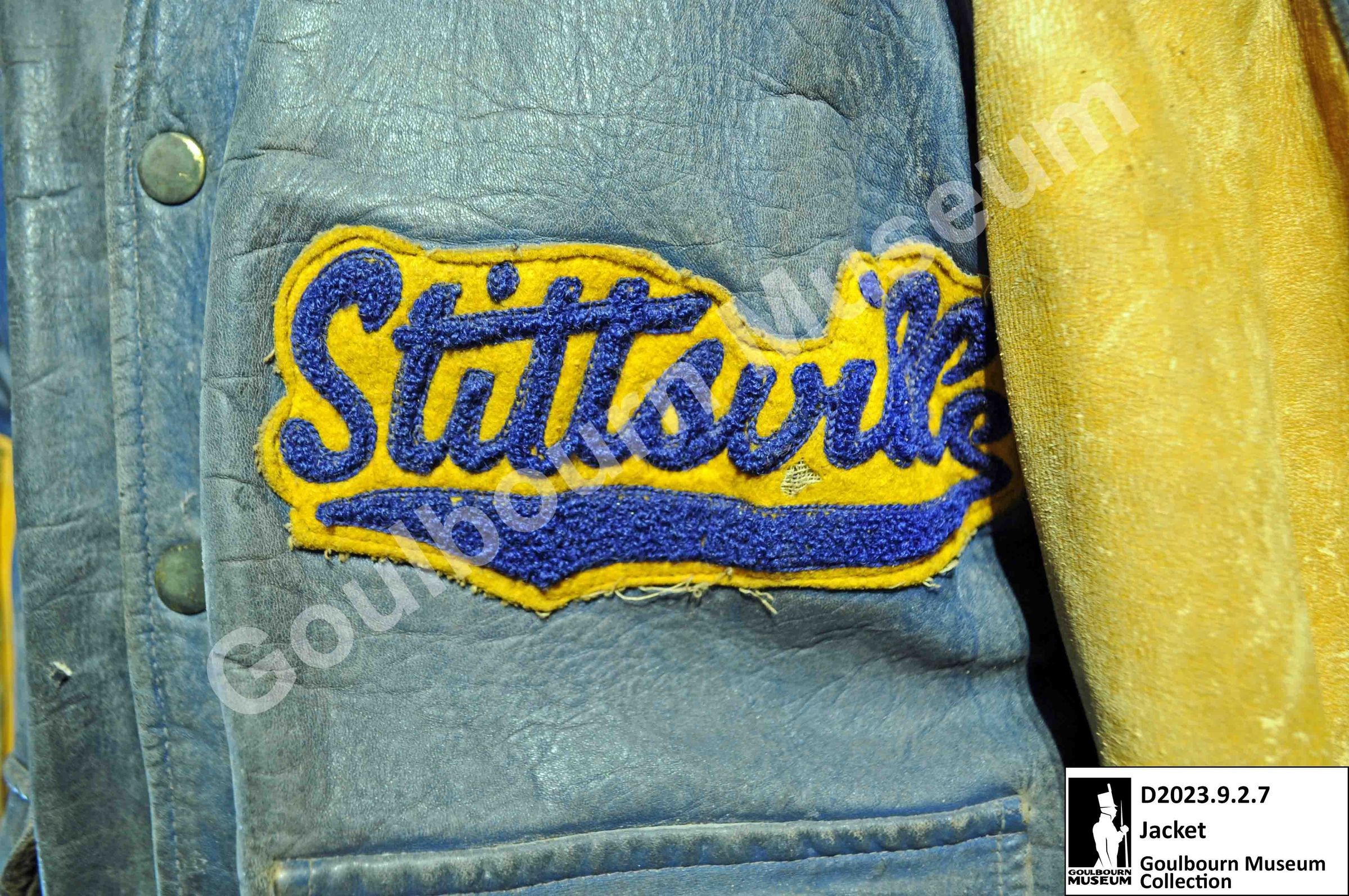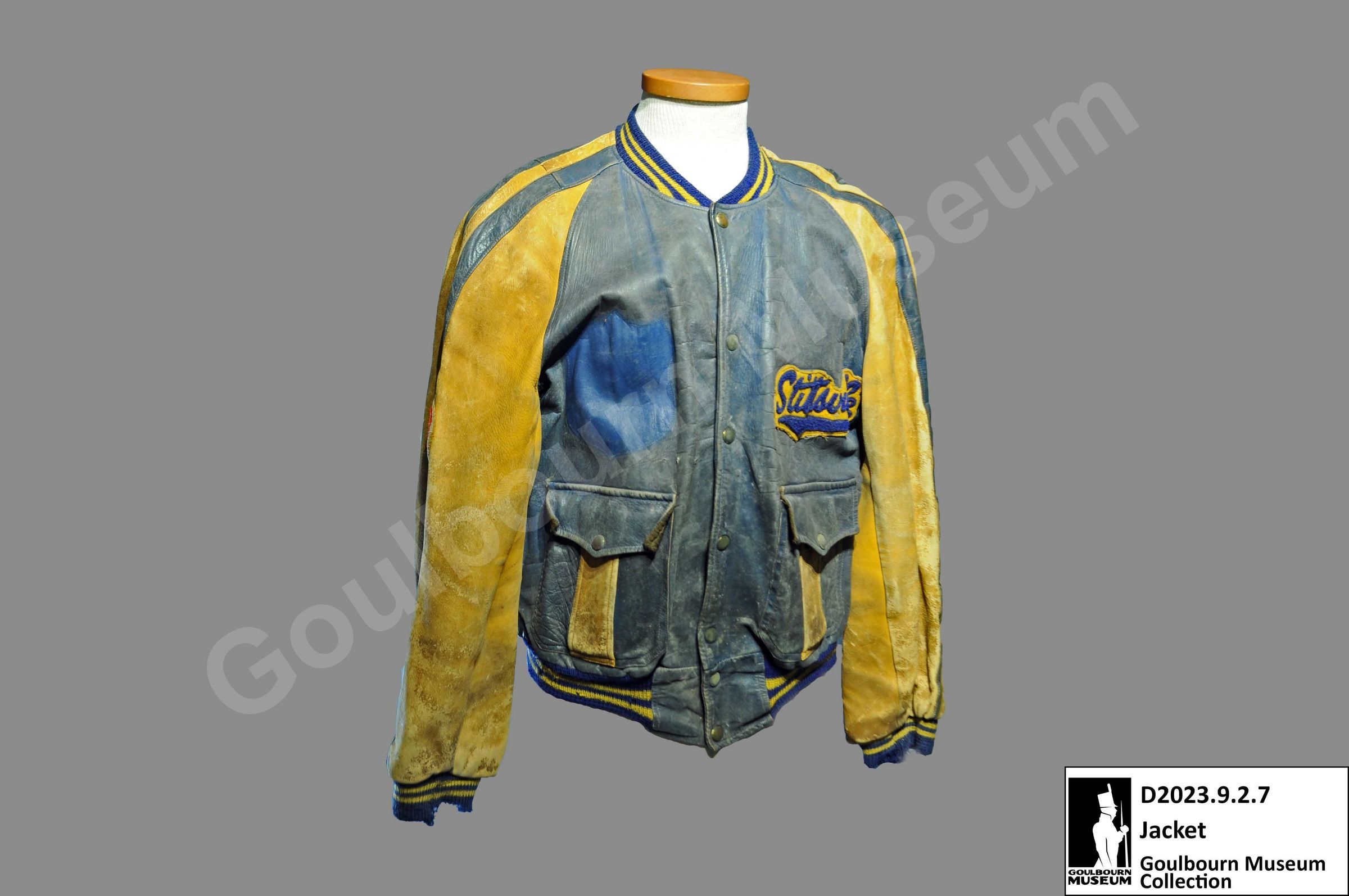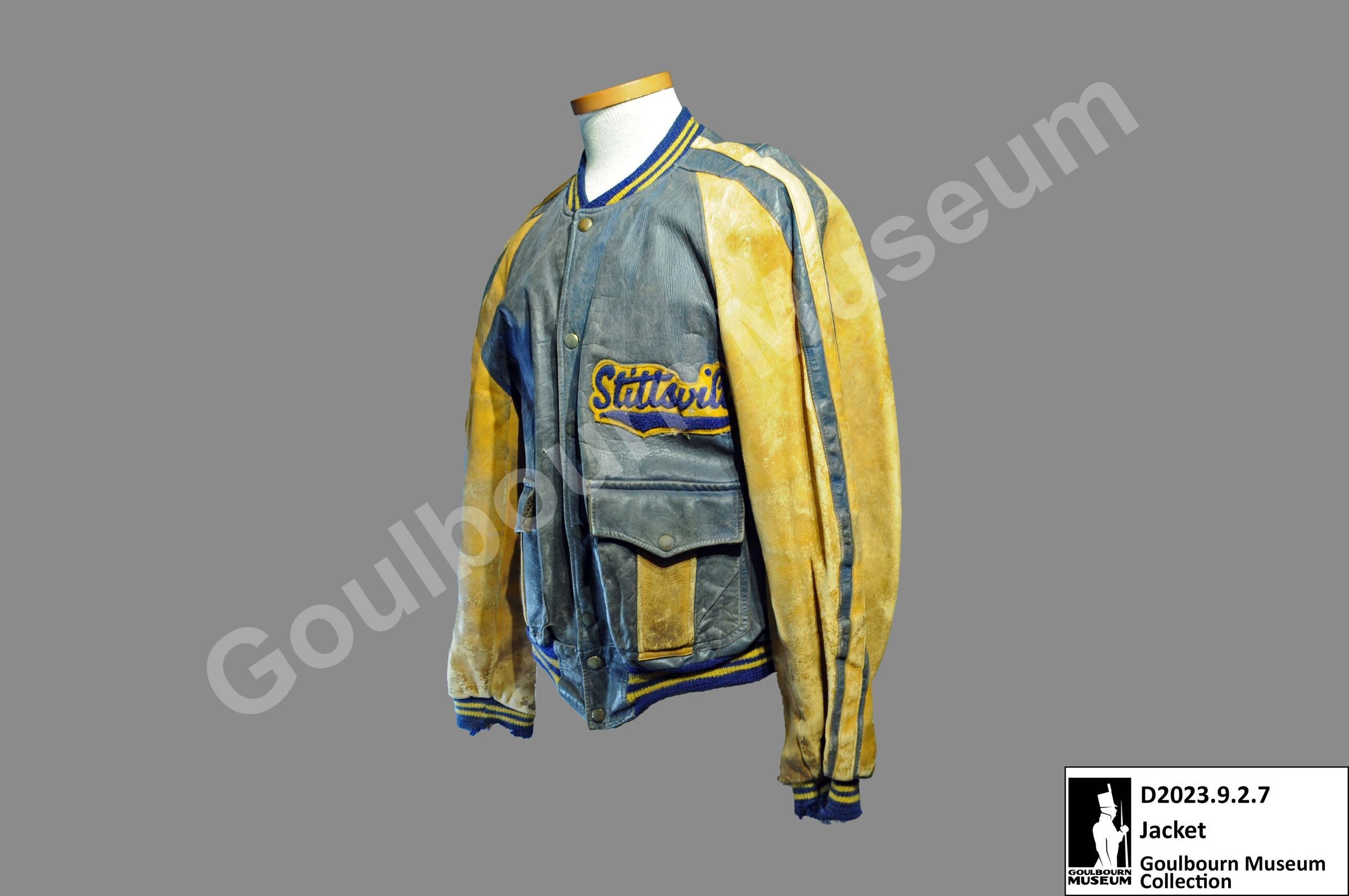 One letterman's jacket. The main body of the jacket is blue leather with vertical yellow leather stripes down the pockets. The jacket sleeves are yellow leather with blue stripes from the collar to the wrists. The sleeve cuffs, collar, and bottom edge of the jacket are blue and yellow stripes. The front has seven metal buttons plus two buttons for each pocket. There is a patch on the left breast area and the right sleeve. There is a spot on the right breast area that appears less worn than the rest of the jacket, this is because a patch was removed.Context