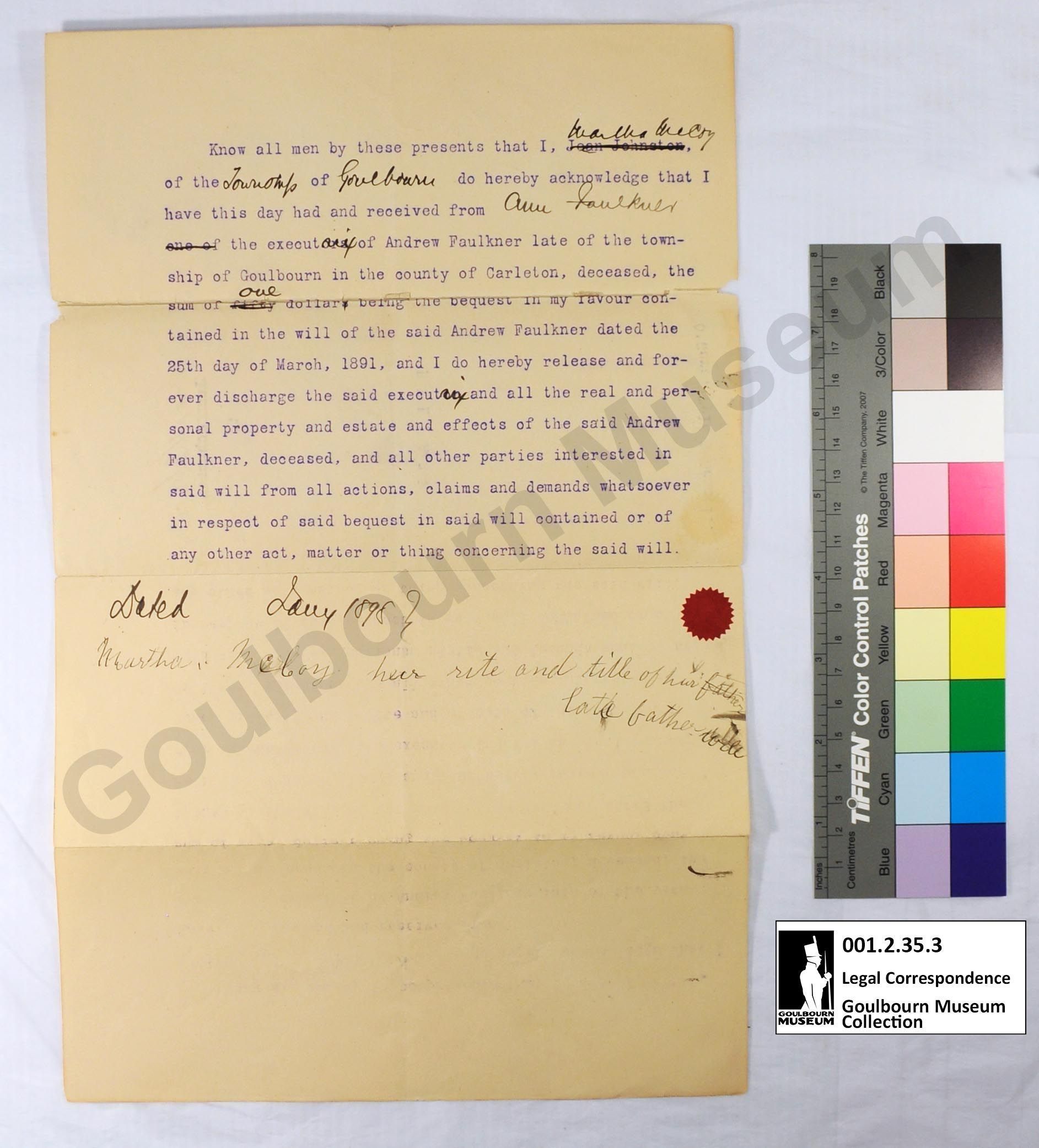 This object is the release of the last will and testament of Andrew Faulkner. This document was witnessed by Martha McCoy. The name Jean Johnston has been crossed out with a black handwritten ink; this occurs in the body of text on the front as well as on the title page located on the back. The name Martha McCoy is written by hand above these crossed out areas. The document is dated 1898. This release refers to the will and testament held within the museum collection (001.2.35.1a-c). The support is a cream colored piece of paper. The medium is a blue printed ink. A blank ink has been used to fill in and mark the page by hand. There is a circular red seal in the shape of a cog with pointed teeth located on the proper left side of the front slightly below the vertical mid point.