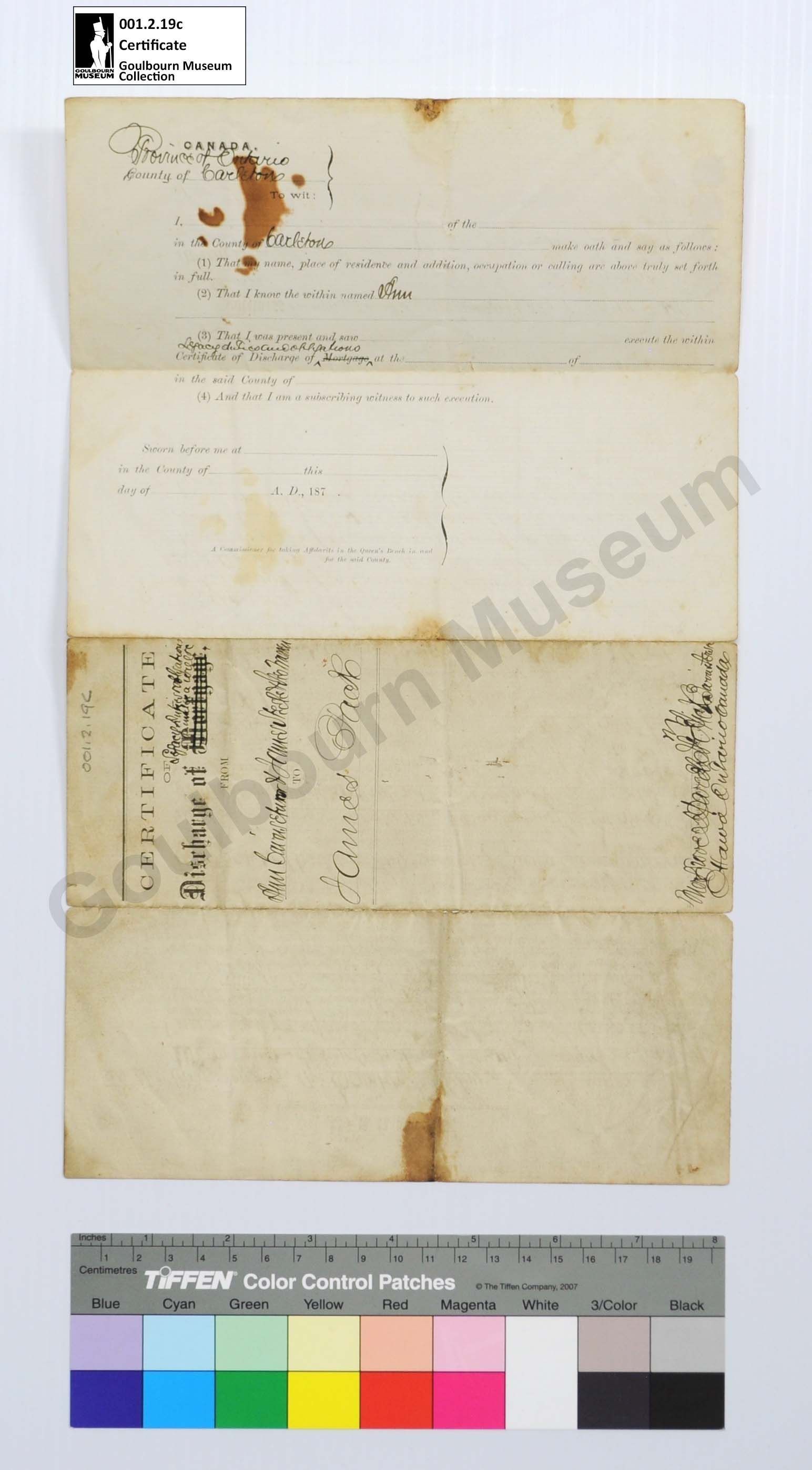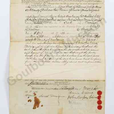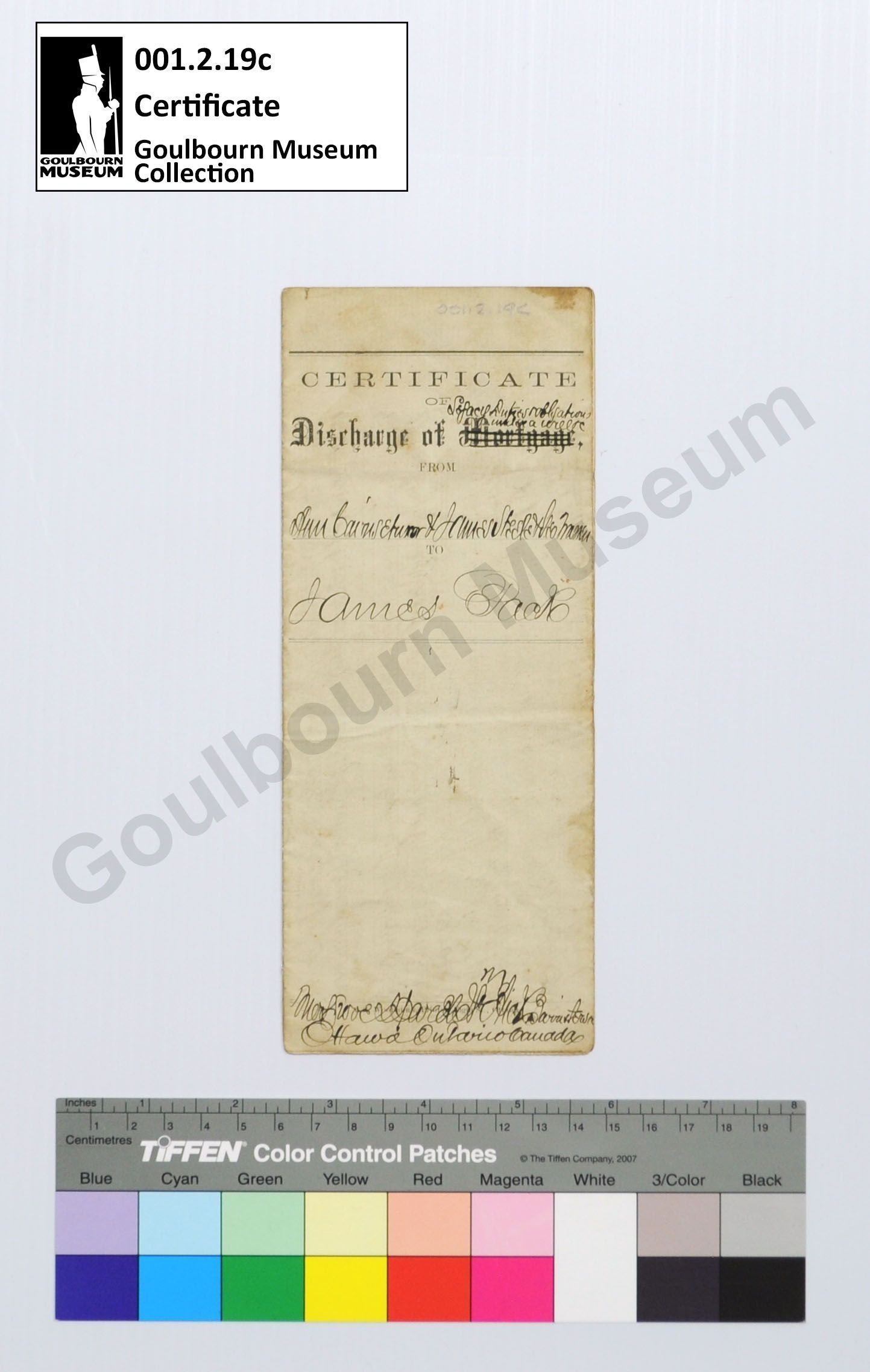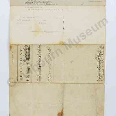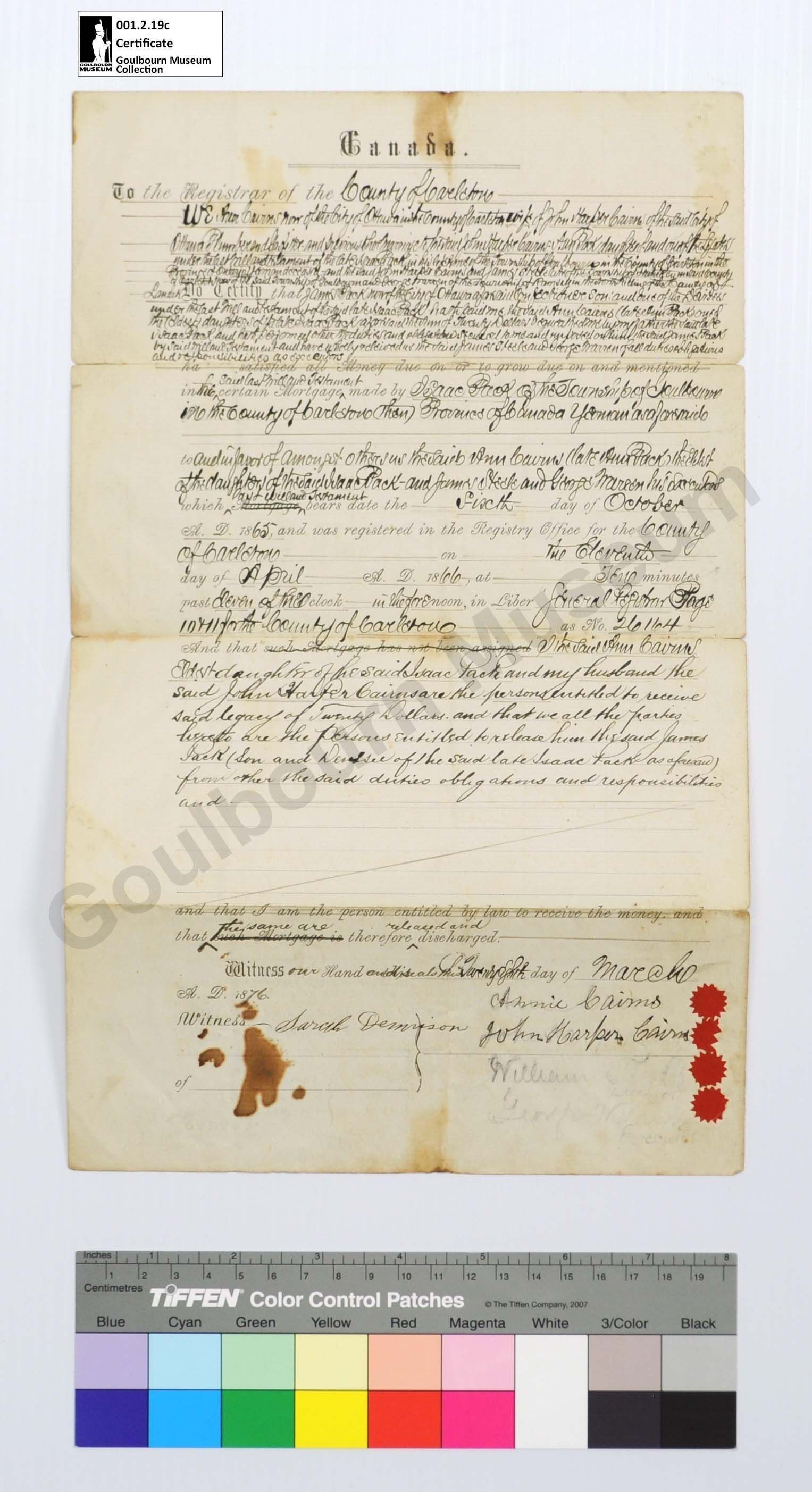 Legal Document: Certificate of Discharge of Legacy Duties & obligations, Ann Cairns, James Steele, Geo Warren, James Pack, 1866Entry/Object ID