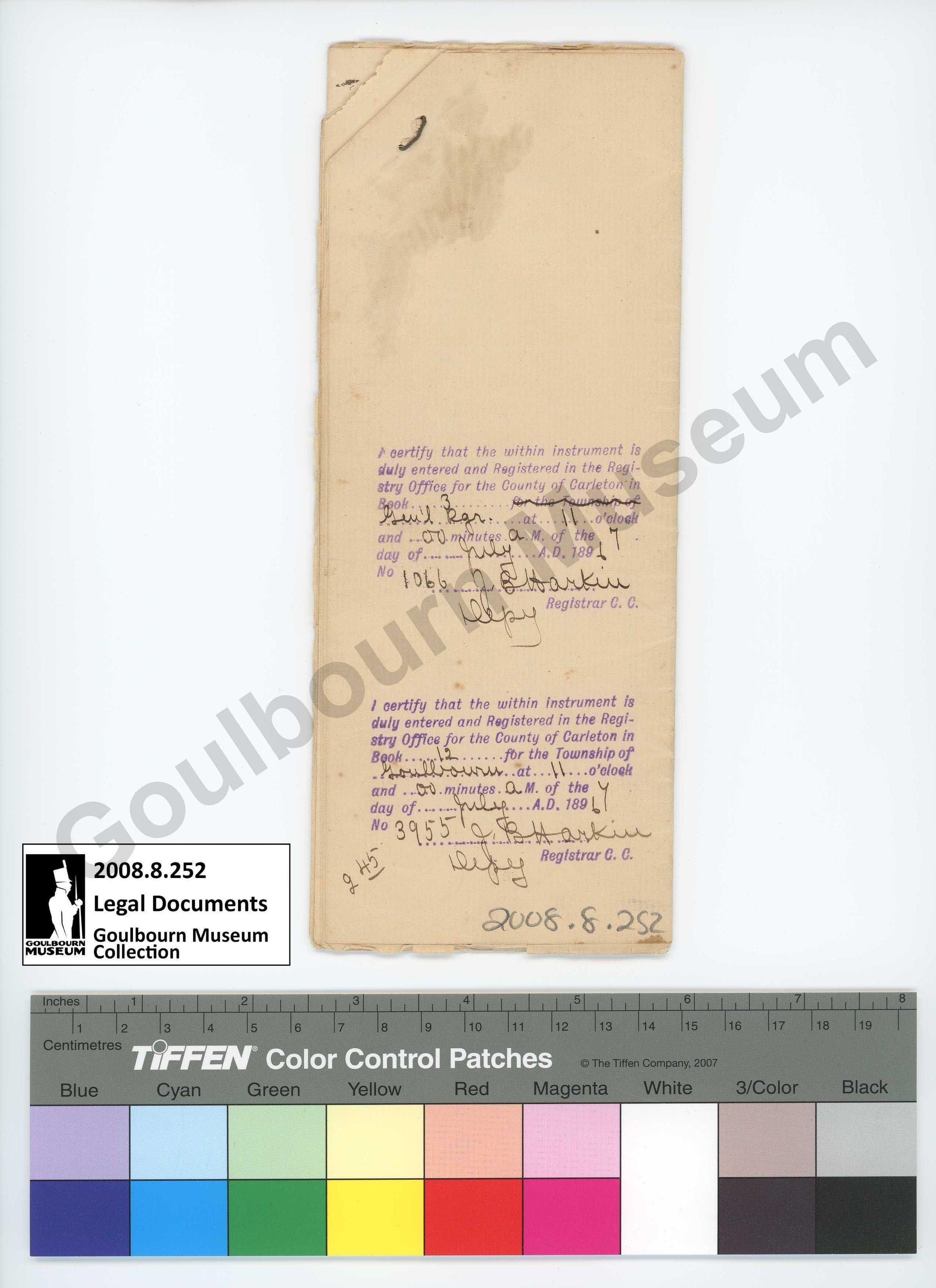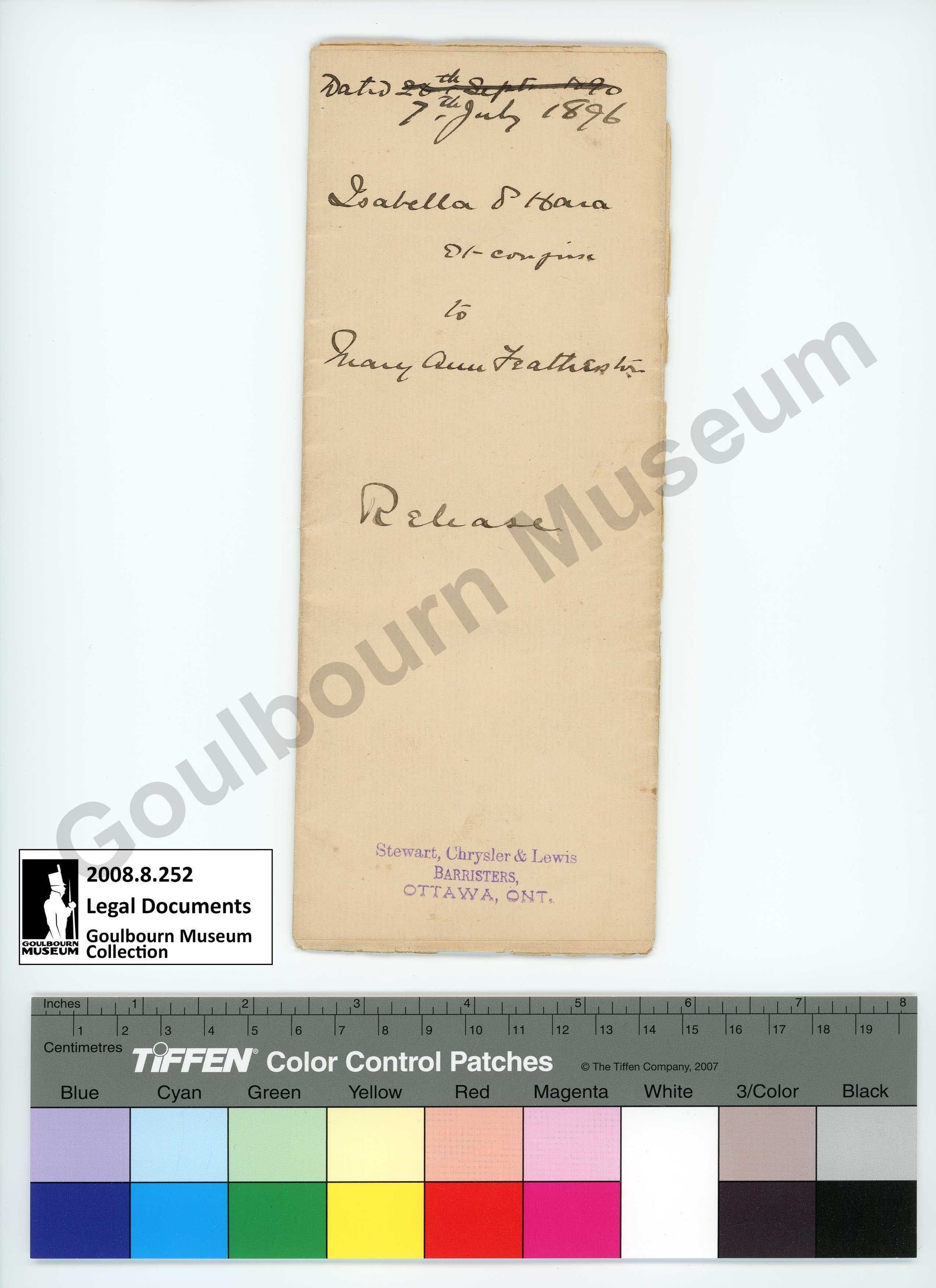 Folded paper copy of a will contest between Isabella O'Hara and Mary Ann Featherston. Text on the front reads, "7th July, 1896 Isabella O'Hara to Mary Ann Featherston Release Stewart, Chrysler, & Lewis BARRISTERS OTTAWA, ONT,". Text on the reverse reads, "I certify that the within instrument is duly entered and registered in the registry office for the count of Carleton in Book 3 Gen'l Rgr at 11 o'clock and 00 minutes A.M. of the 7 day of July A.D. 1896 No 1066 J.B. Harkin, Deputy Registrar C.C." followed by "I certify that the within instrument is duly entered and registered in the registry office for the count of Carleton in Book 12 for the Township of Goulbourn at 11 o'clock and 00 minutes A.M. of the 7 day of July A.D. 1896 No 3955 J.B. Harkin, Deputy Registrar C.C.".Collection