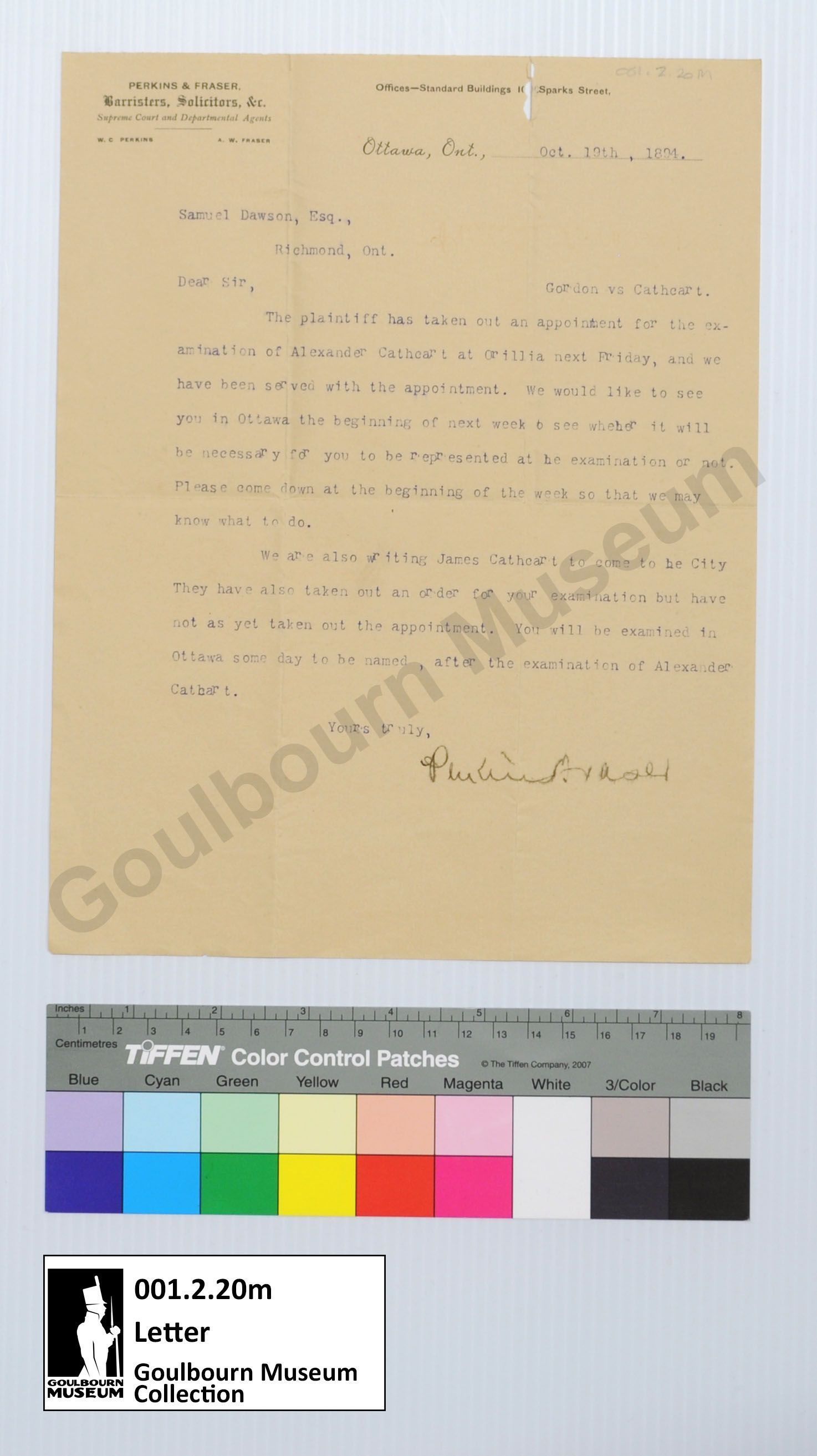 Typed letter with letterhead from Perkins & Fraser Barristers, Solicitors, &c. Supreme Court and Departmental Agents, Sparks Street Ottawa. Addressed to Samuel Dawson, Esq., Richmond, Ontario. Letter is regarding legal representation. The letter is dated October, 19th, 1894.Collection