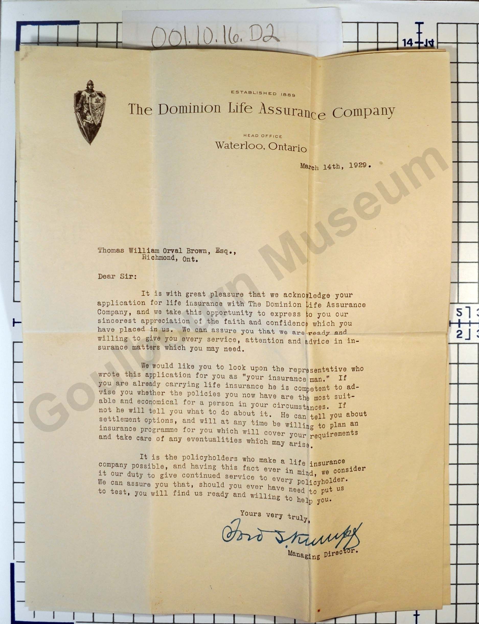 It is with great pleasure that we acknowledge your application for life insurance with The Dominion Life Assurance Company, and we take this opportunity to express to you our sincerest appreciation of the faith and confidence which you have placed in us. We can assure you that we are ready and willing to give you every service, attention and advice in insurance matters which you may need.