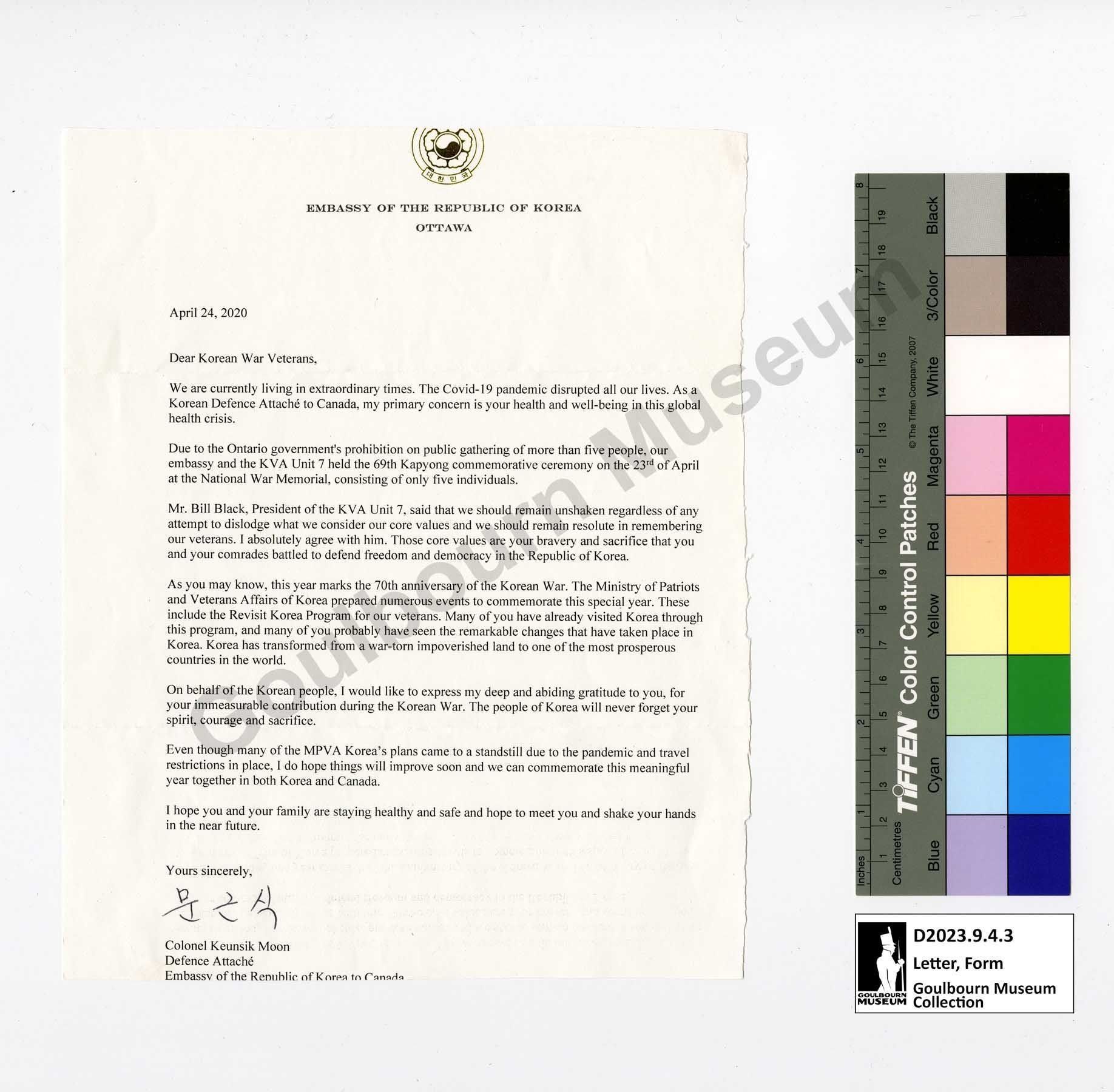 Form letter addressed to "Dear Korean War Veterans" printed on white 8.5" x 11" paper letterhead from the Embassy of the Republic of Korea, Ottawa. The letter is signed Yours Sincerely Colonel Keunsik Moon, Defence Attache, Embassy of the Republic of Korea to Canada.Subject Person/Organization
