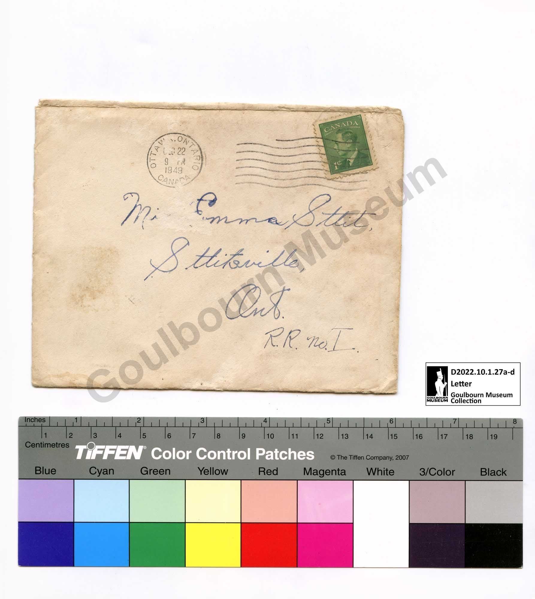 [Envelope, Front] [Postmark] OTTAWA ONTARIO DEC [abbreviated: DECEMBER] 22 9 PM [abbreviated: Post Meridiem, Latin meaning After Noon] 1949 CANADA [Postal Cancellation Mark: wavy lines] [Postage Stamp] CANADA POSTES POSTAGE [Picture of King George VI] 1 c [abbreviated: cent] [Miss] Emma Stitt, Stittsville, Ont. [abbreviated: Ontario] R.R. no. I. [abbreviated: Rural Route number 1.]