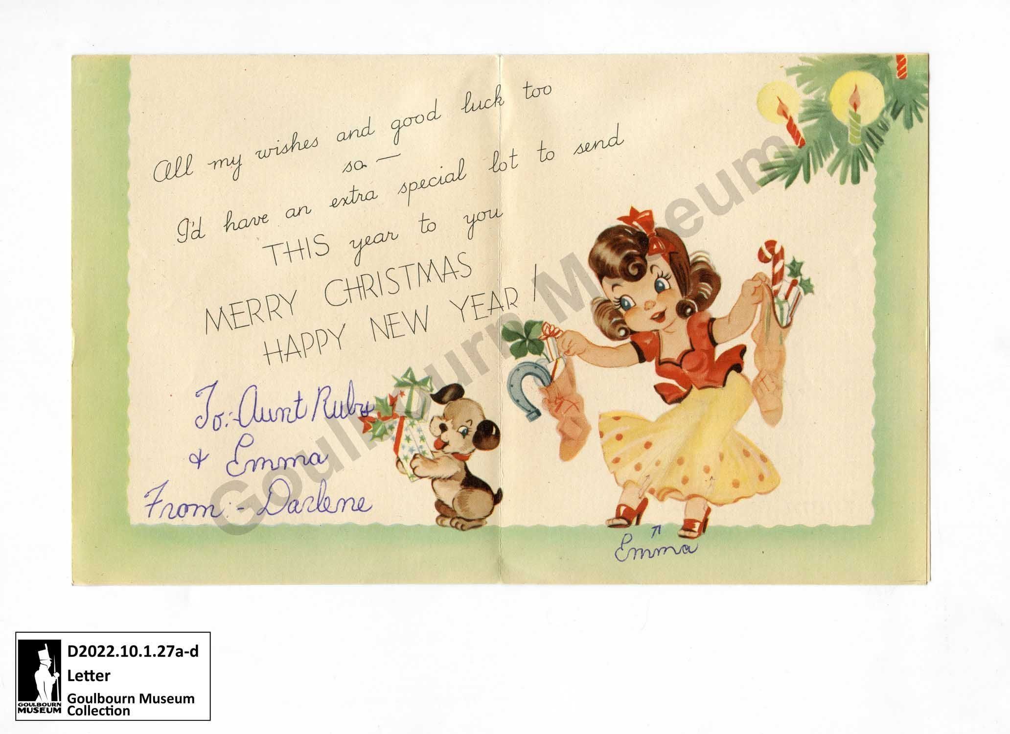 All my wishes and good luck too so -- I'd [abbreviated: I would] have an extra special lot of to send THIS year to you MERRY CHRISTMAS HAPPY NEW YEAR/ To: Aunt Ruby & [abbreviated: and] Emma From: - DarleneTranscriber