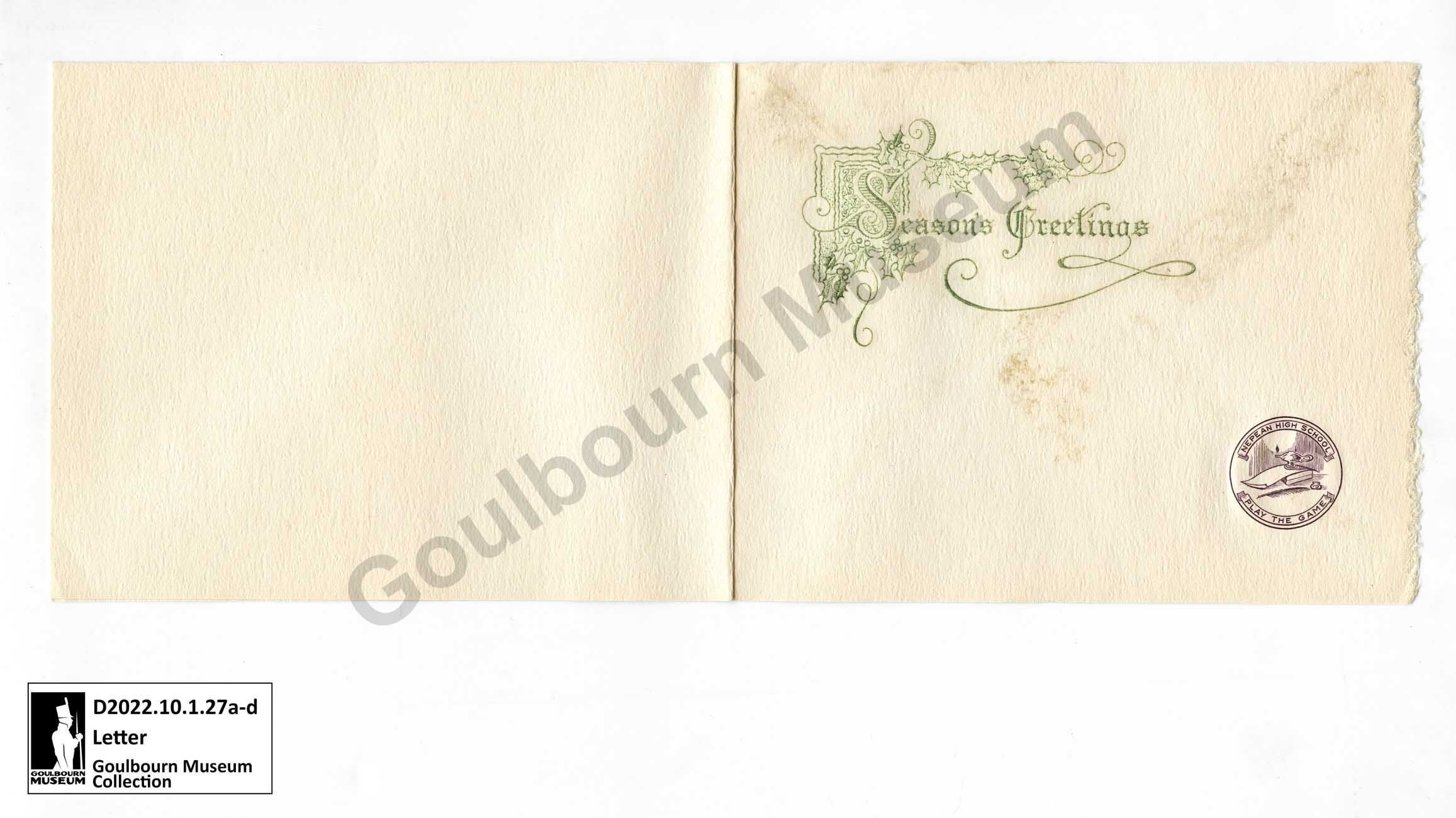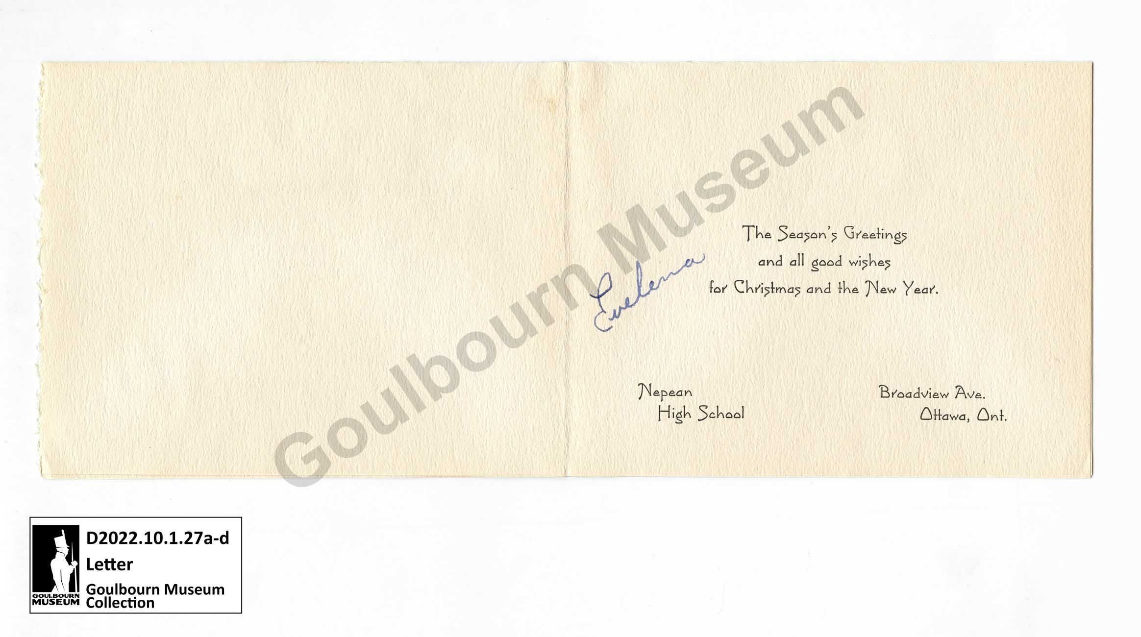 The Season's Greetings and all good wishes for Christmas and the New Year. Evelena Nepean High School Broadview Ave. Ottawa, Ont. [abbreviated: Ontario]Transcriber