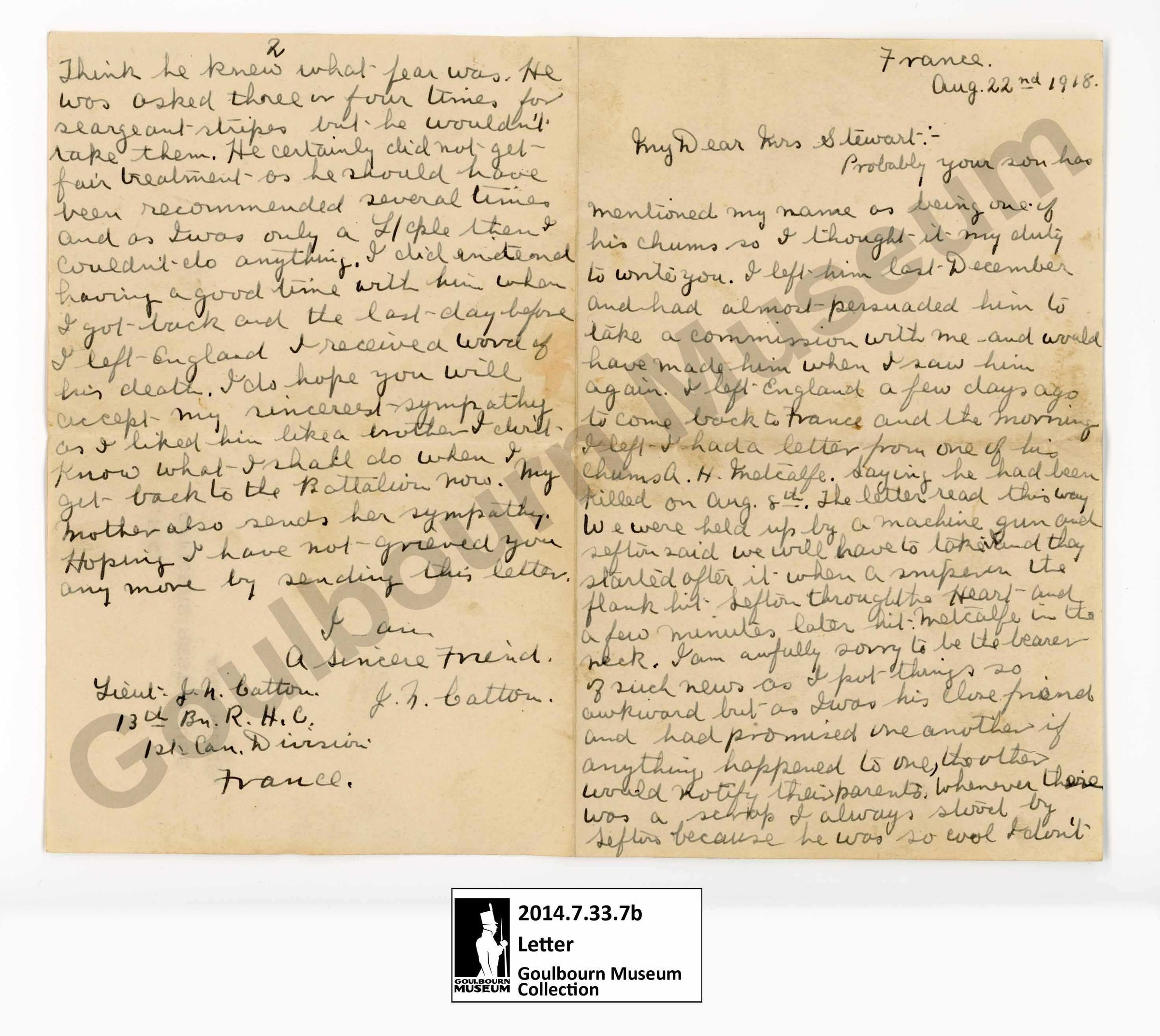 France. Aug. 22nd 1918 [abbreviated: August 22, 1918] My Dear Mrs Stewart-:- Probably your son has mentioned my name as being one of his chums so I thought it my duty to write you. I left him last December and had almost persuaded him to take a commission with me and would have made him when I saw him again. I left England a few days ago to come back to France and the morning I left I had a letter from one of his chums A. H. Metcalfe. Saying he had been killed on Aug. 8th [abbreviated: August 8]. The letter read this way We were held up by a machine gun and Sefton said we will have to take it and they started after it when a sniper in the flank hit Sefton through the Heart and a few minutes later hit Metcalfe in the neck. I am awfully sorry to be the bearer of such news as I put things so awkward but as I was his close friend and had promised one another if anything happened to one, the other would notify their parents. Whenever there was a scrap I always stood by Sefton because he was so cool I don't 2 Think he knew what fear was. He was asked three or four times for seargeant stripes but he wouldn't take them. He certainly didn't get fair treatment - as he should have been recommended several times and as I was only a L/cple [abbreviated: Lance Corporal] then I couldn't do anything. I did intend having a good time with him when I got back and the last day before I left England I received word of his death. I do hope you will accept my sincerest sympathy as I liked him as a brother I don't Know what I shall do when I get back to the Battalion now. My mother also sends her sympathy. Hoping I have not grieved you any more by sending this letter. I am a Sincere Friend. J. N. Catton Lieut. [abbreviated: Lieutenant] J. N. Catton, 13th Bn. [abbreviated: Thirteenth Battalion] R. H. C. [abbreviated: Royal Highlanders of Canada] 1st. Can. [abbreviated: First Canadian] Division. France.