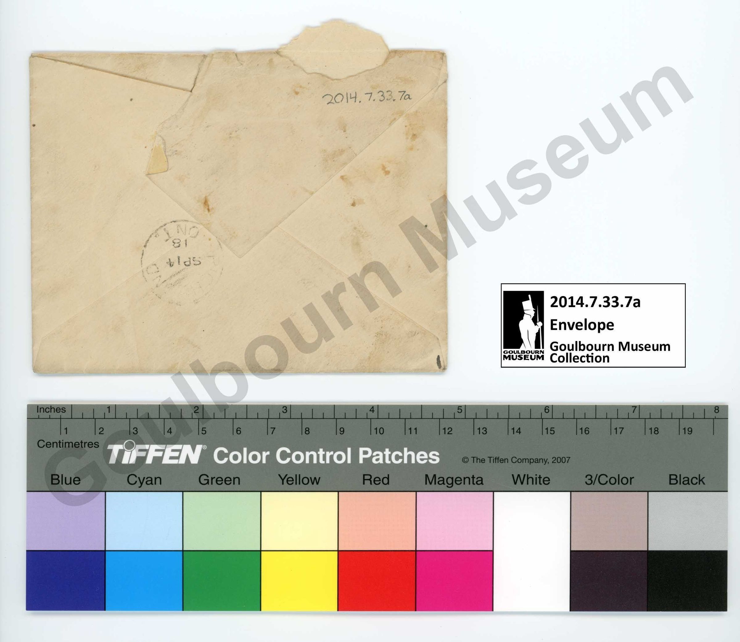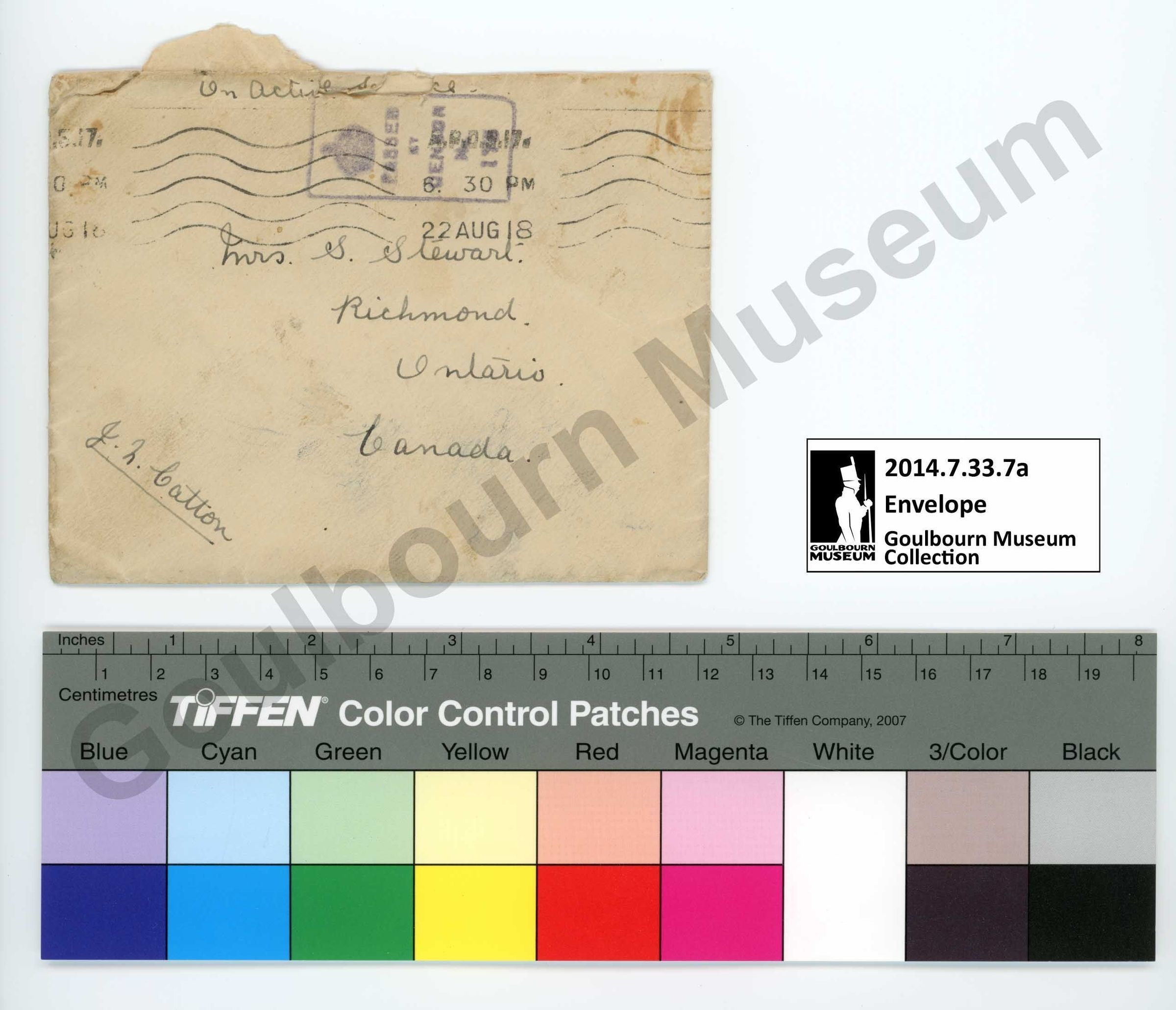 The envelope, 2014.7.33.7a, is made of a single tan piece of paper which has been folded into shape. It is held together with an unknown adhesive. There are three inscriptions on the front in a black, handwritten, medium rendered in cursive. At the center it reads "Mrs. S. Stewart Richmond, Ontario, Canada". At the proper bottom right corner it reads "J.H. Catton". At the top center it reads "On Active Service" with the word 'service' being damaged by the envelope's opening. There are three rubber stamp imprints on the front rendered in black ink. The first is an incomplete stamp at the proper right edge which is mostly cutoff and largely illegible. The second is located at the top center; it is a rectangle featuring a crown at the top and the text "PASSED BY CENSOR" is visible. This stamp is perpendicular to the envelope, with the bottom of the stamp oriented towards the proper left side of the envelope. The third stamp on the front is text flanked by waving lines on either side which reads "6.30PM 22 AUG 18". This third stamp lies overtop the rectangular censor stamp. On the back of the envelope is a single rubber stamp imprint rendered in black ink. It presents as a circle with text inside which reads in part "SP 14 18 ONT"; it is badly faded. The stamp on the back is oriented upside down in relation to the envelope.