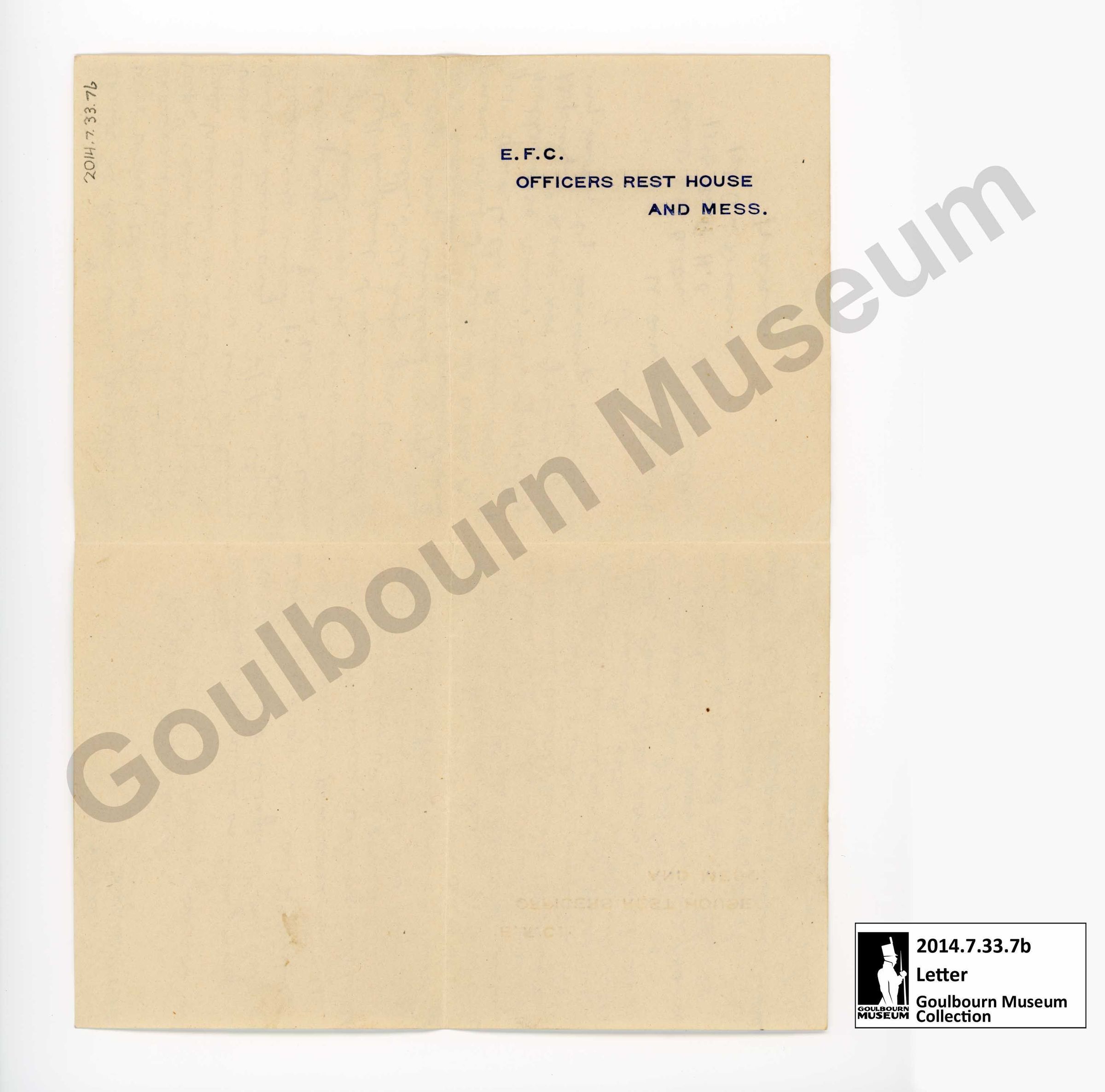 The letter 2014.7.33.7b is executed on a single sheet of cream/tan coloured paper. The primary body of text is executed in a black ink, handwritten, rendered in cursive. It is likely this letter was folded in half along a vertical axis, as the first page occurs on the proper left half of the front, while the second page appears on the front proper right. The first page, at the proper left of the front, begins "France Aug. 22nd 1918" at the top. The second page at the proper right half features a "2" at the top. Both pages of the front are entirely covered in script. The back features three lines of script in a printed blue ink which read "E.F.C OFFICERS REST HOUSE AND MESS." These lines of text are perpendicular to the text body on the front.Subject Person/Organization