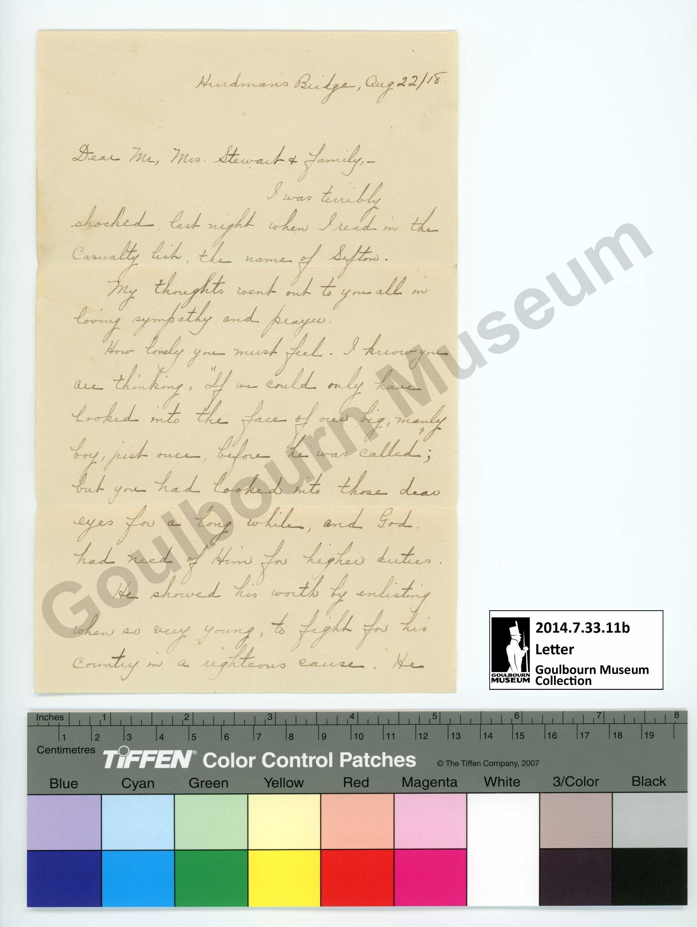 I was terribly shocked last night when I read in the Casualty List the name of Sefton. My thoughts went out to you all in loving sympathy and prayer. How lowly you must feel. I know you are thinking, ""If one could only have looked into the face of our big, manly boy, just once, before he was called; but you had looked into those dear eyes for a long while, and God had need of Him for higher duties. He showed his worth by enlisting when so very young, to fight for his country in a righteous cause. He