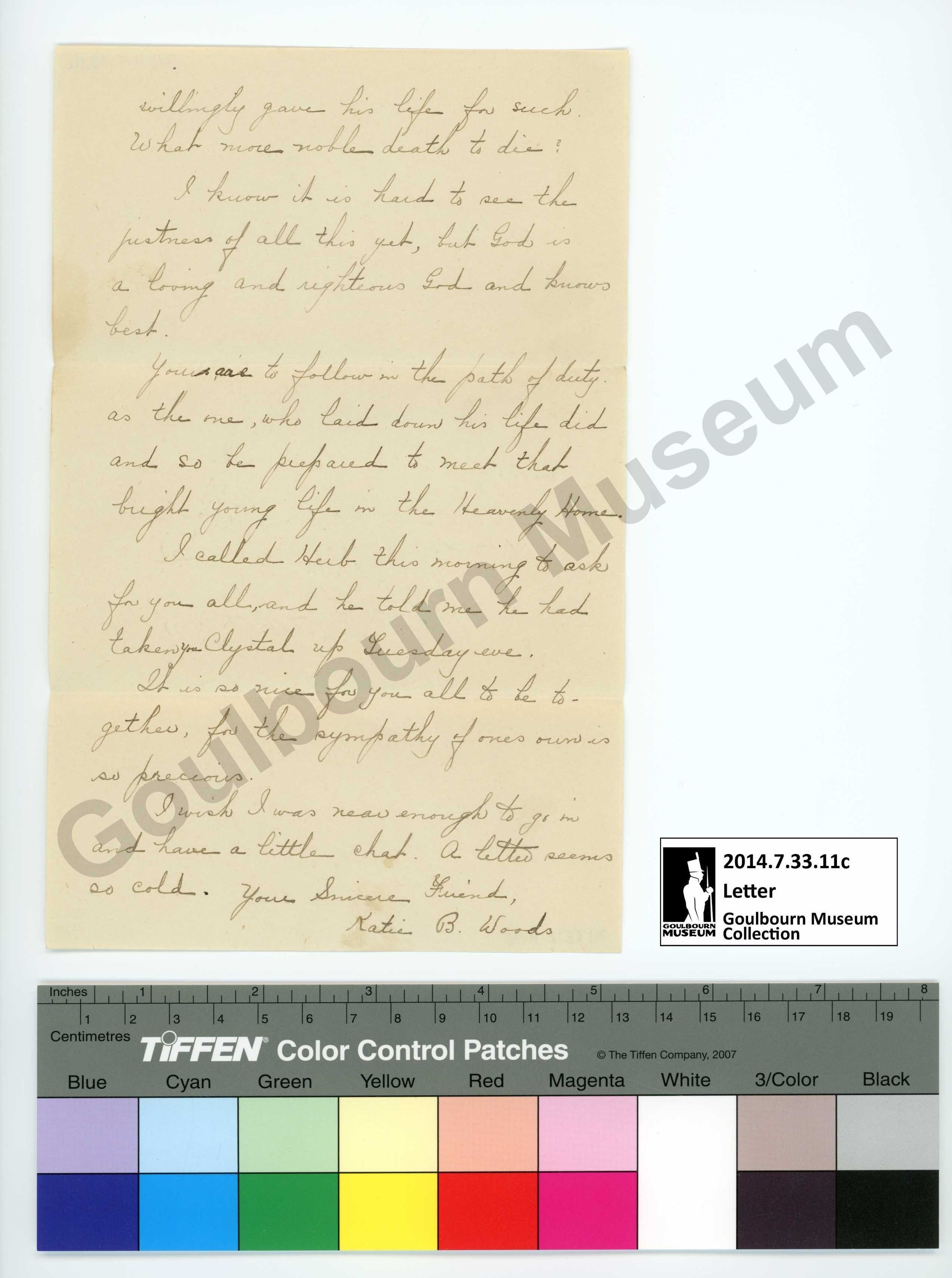 2014.7.33.11c is the second and concluding page of the letter. The support and medium are identical to the first page. The script fills the front of the page while the back is blank. The letter concludes "Your Sincere Friend, Katie B. Woods"Subject Person/Organization