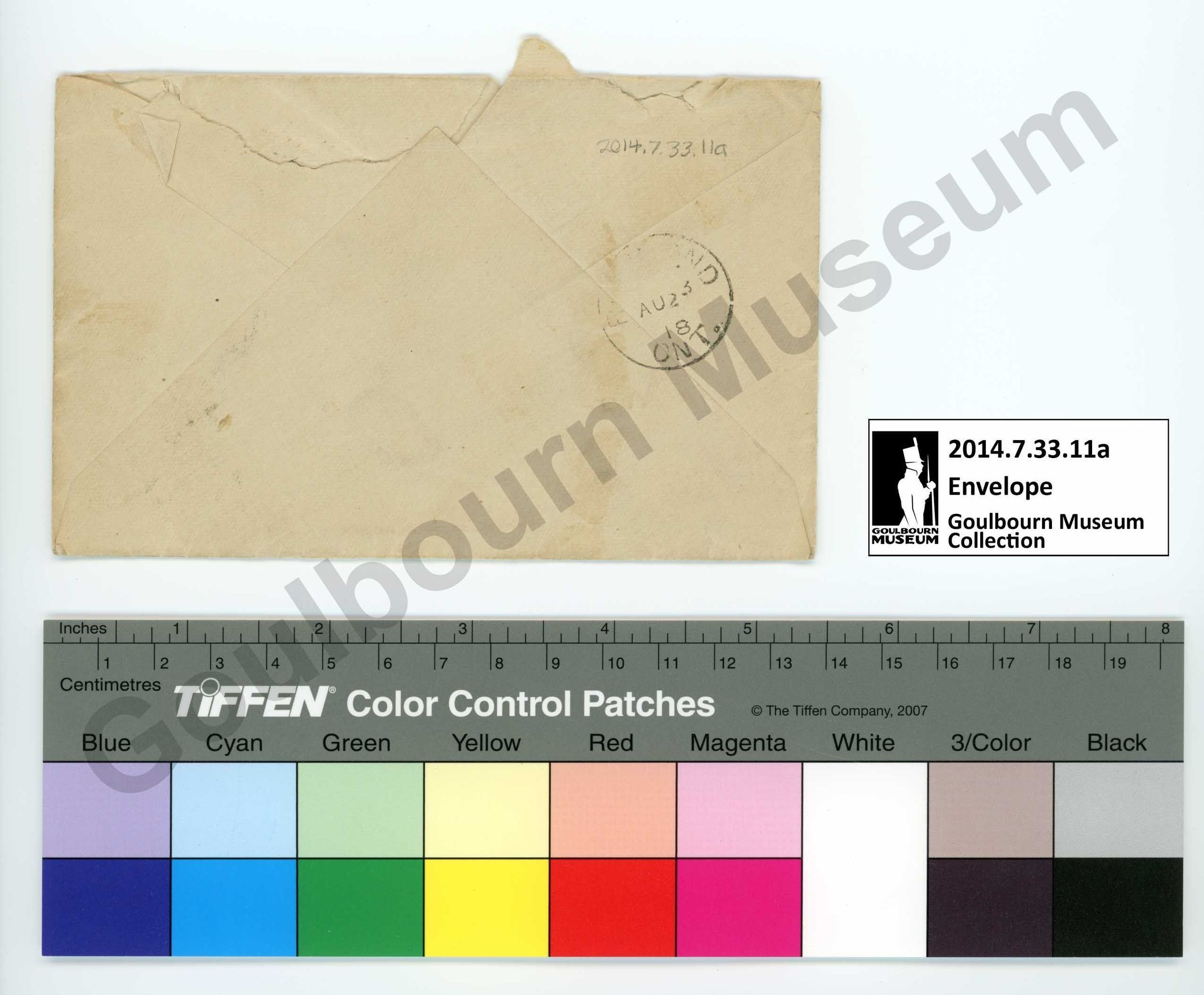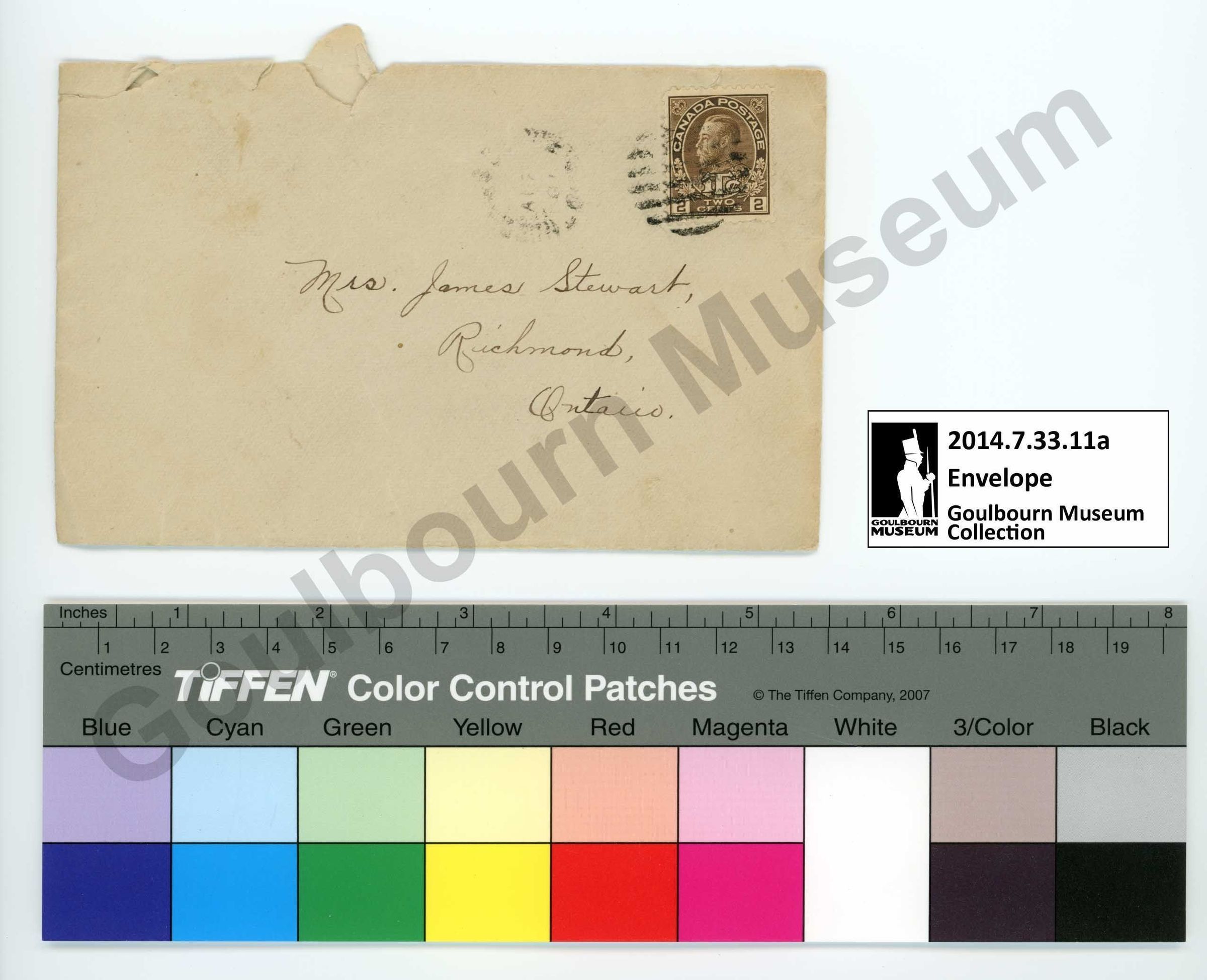 2014.7.33.11a the envelope is made of a tan colored paper which has been folded into shape. It is held together with an unknown adhesive. An inscription on the front handwritten in black ink rendered in cursive reads "Mrs. James Stewart, Richmond, Ontario". There is a brown rectangular two-cent postage stamp on the proper top left corner of the front bearing a male face facing towards the proper right. There are two faint rubber stamp imprints rendered in black ink which are illegible due to their state. The first is located to the proper left of center at the top; it is circular in shape and may contain some writing in the center. The second stamp imprint overlies the postage stamp on the proper top left corner of the front; it is circular in shape and is comprised of parallel black lines with negative space between them. There is one rubber stamp imprint on the back on the proper right side midway up the envelope; this presents as a circle with writing on the interior which reads in part "AU23, 18, ONT" however the word at the top is significantly faded.