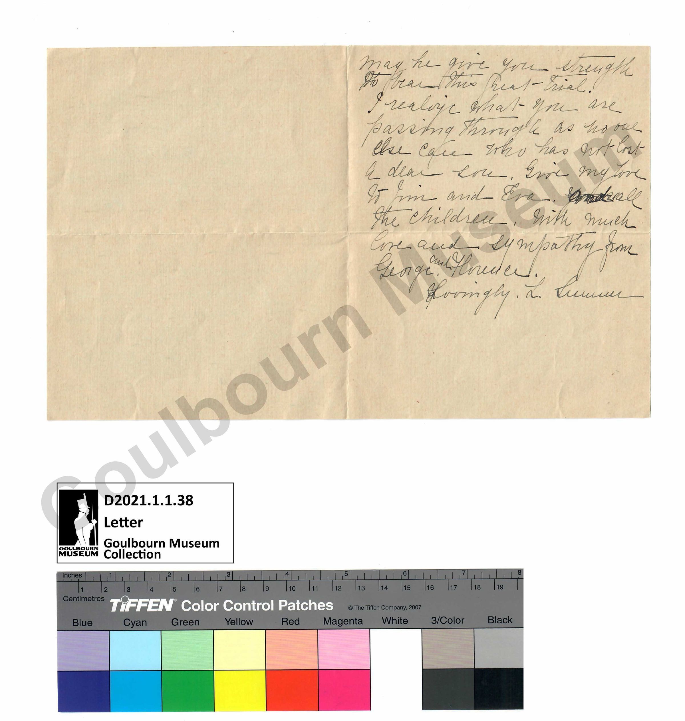 May he give you strength to bear this great trial. I realize what you are passing through as no one else can who has not lost a dear son. Give my love to Jim and Eva and all the children. With much love and sympathy from George and Florence. Lovingly. L. [Lavina] SumnerLanguage