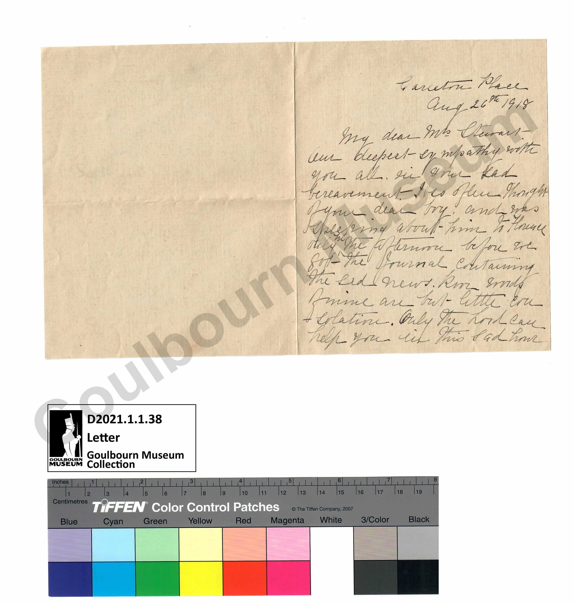 Digital Artifact: One 1 page letter, not in envelope, written on paper with black ink. Addressed to My dear Mrs Stewart, from Carleton Place and dated Aug 26th 1918.Subject Person/Organization