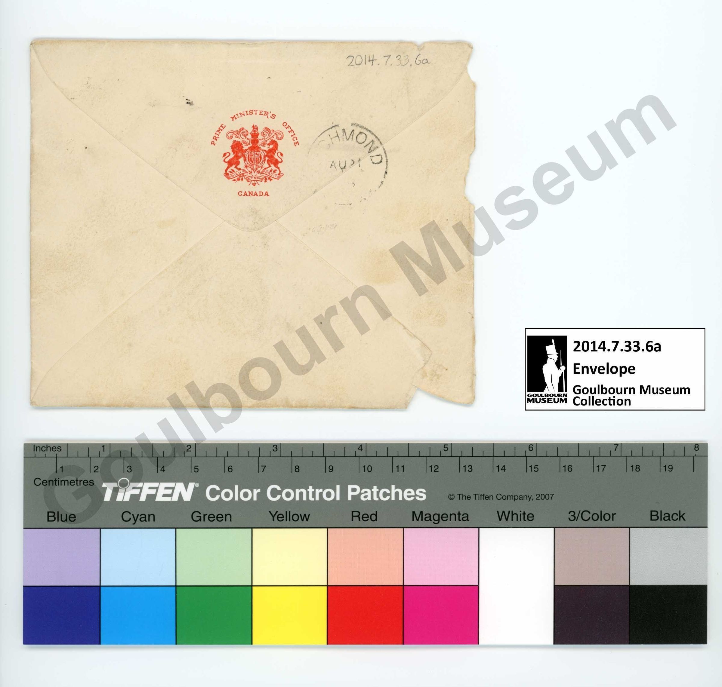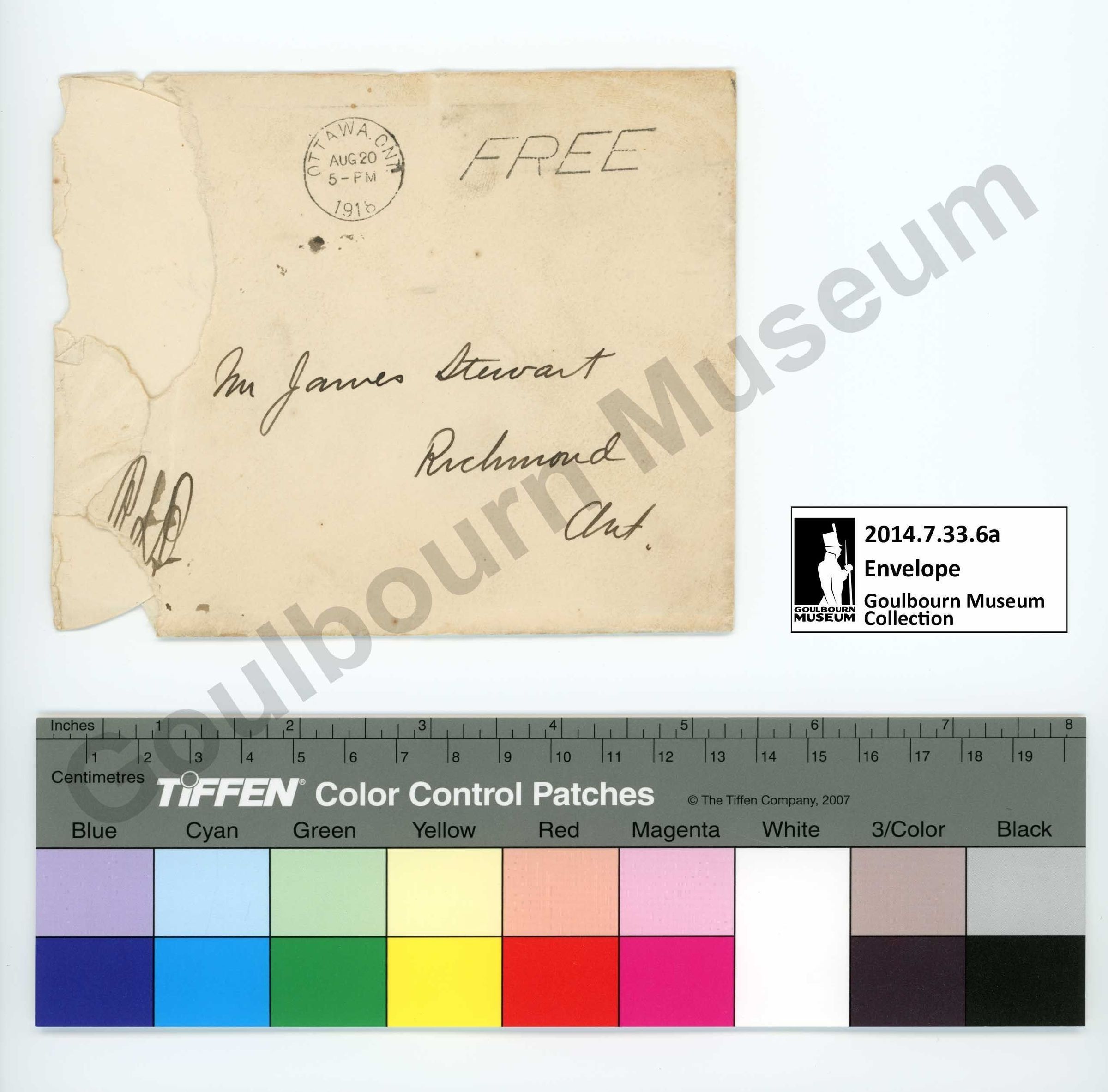 2014.7.33.6a, the envelope, is made of a tan piece of paper that has been folded into shape. It is held together with an unknown adhesive. There are two inscriptions on the front rendered in a handwritten black medium. The first appears at the center and reads "Mr. James Stewart Richmond Ont." in cursive. The second inscription is at the bottom proper right corner of the front and is illegible; this inscription has been affected by the tear on the proper right edge. There are two stamps rendered in black ink on the front. The first at the top center is a circle with text within that reads "OTTAWA AUG 20 5-PM 1918". The second stamp is located at the proper top left corner and reads "FREE". On the back of the envelope at the center there is an old form of the Canadian Coat of Arms rendered in red. The coat of arms is surrounded by the text "PRIME MINISTER'S OFFICE CANADA". There is a rubber stamp imprint rendered in black ink on the proper right of the back which presents as a circle with text within it; this stamp is significantly faded and only the letters "CHMOND" are fully legible.