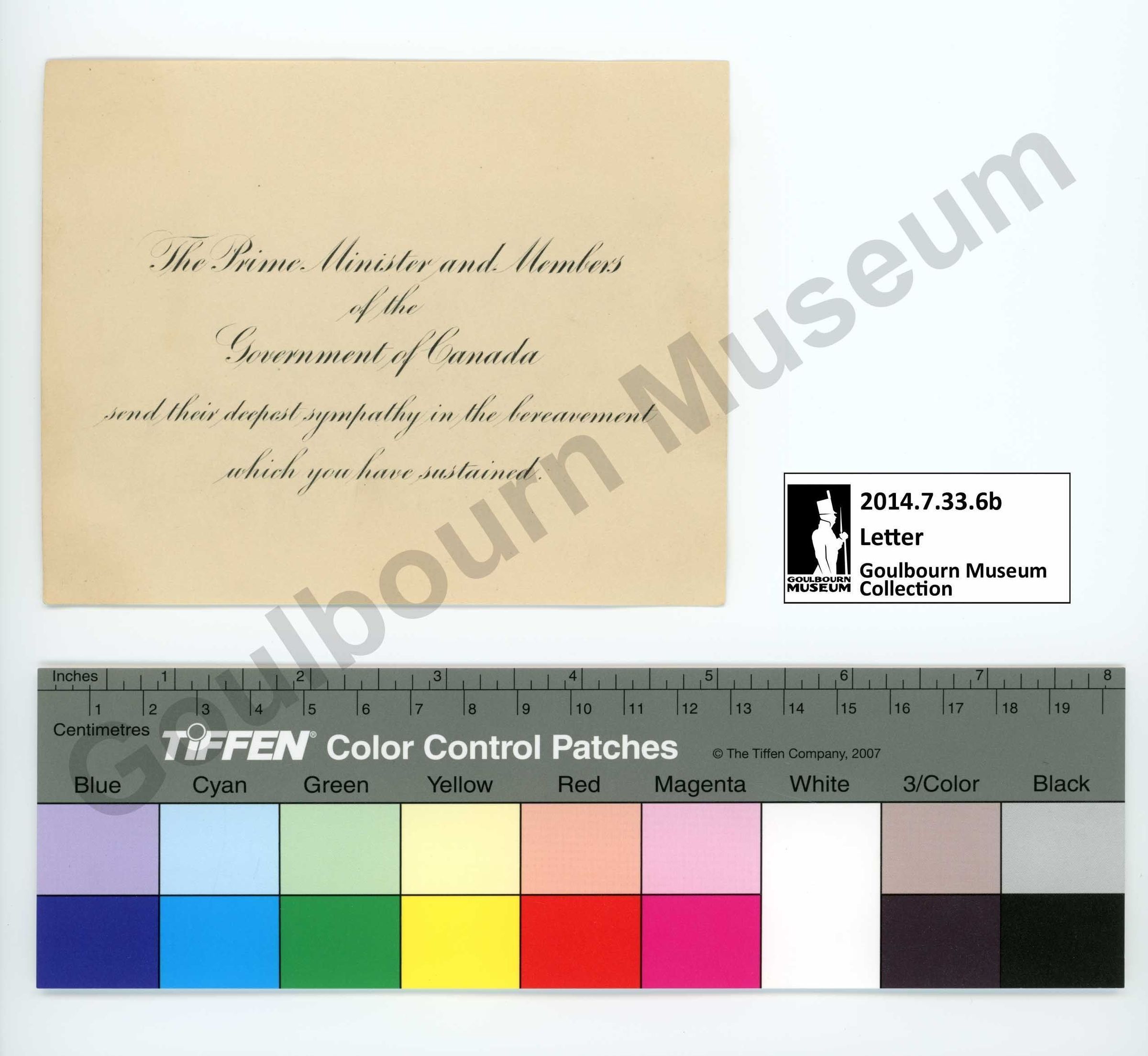 2014.7.33.6b, the letter of condolence, is rendered on a stiff piece of cream/tan colored paper. The medium is a printed black ink. On the front there are 5 lines of script rendered in cursive. This reads "The Prime Minister and Members of the Government of Canada send their deepest sympathy in the bereavement which you have sustained." The back is blank.Subject Person/Organization