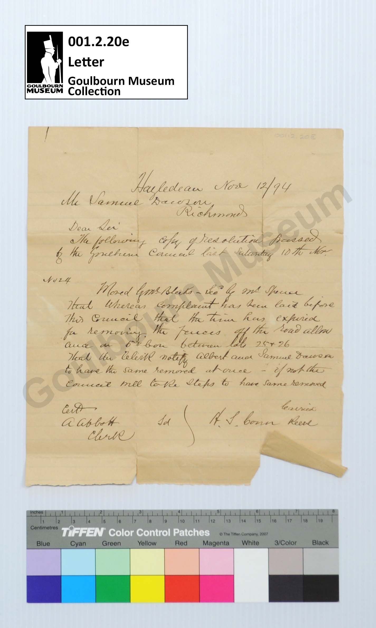 Letter: Resolution passed by Goulbourn Council, to Samuel Dawson, 1894Entry/Object ID