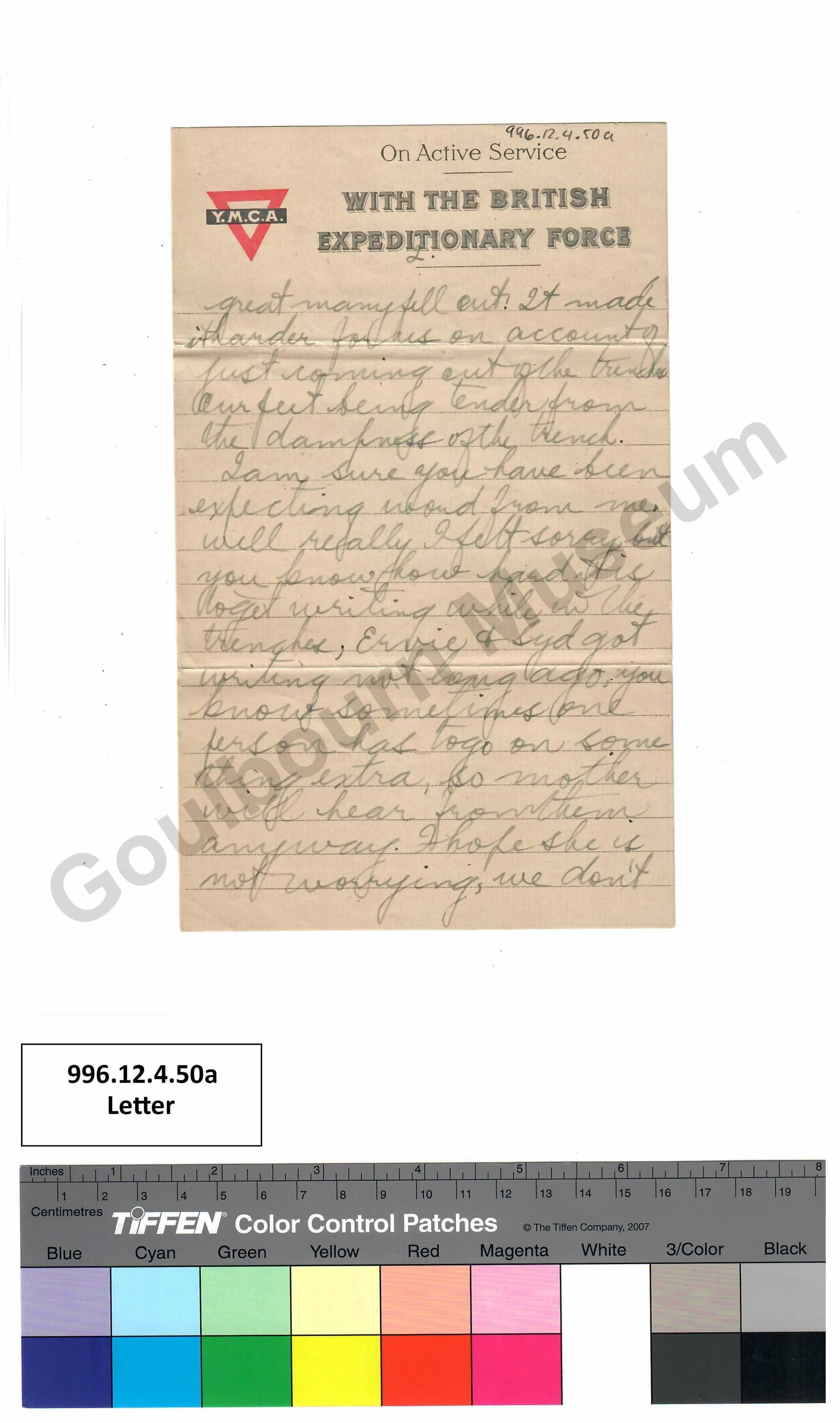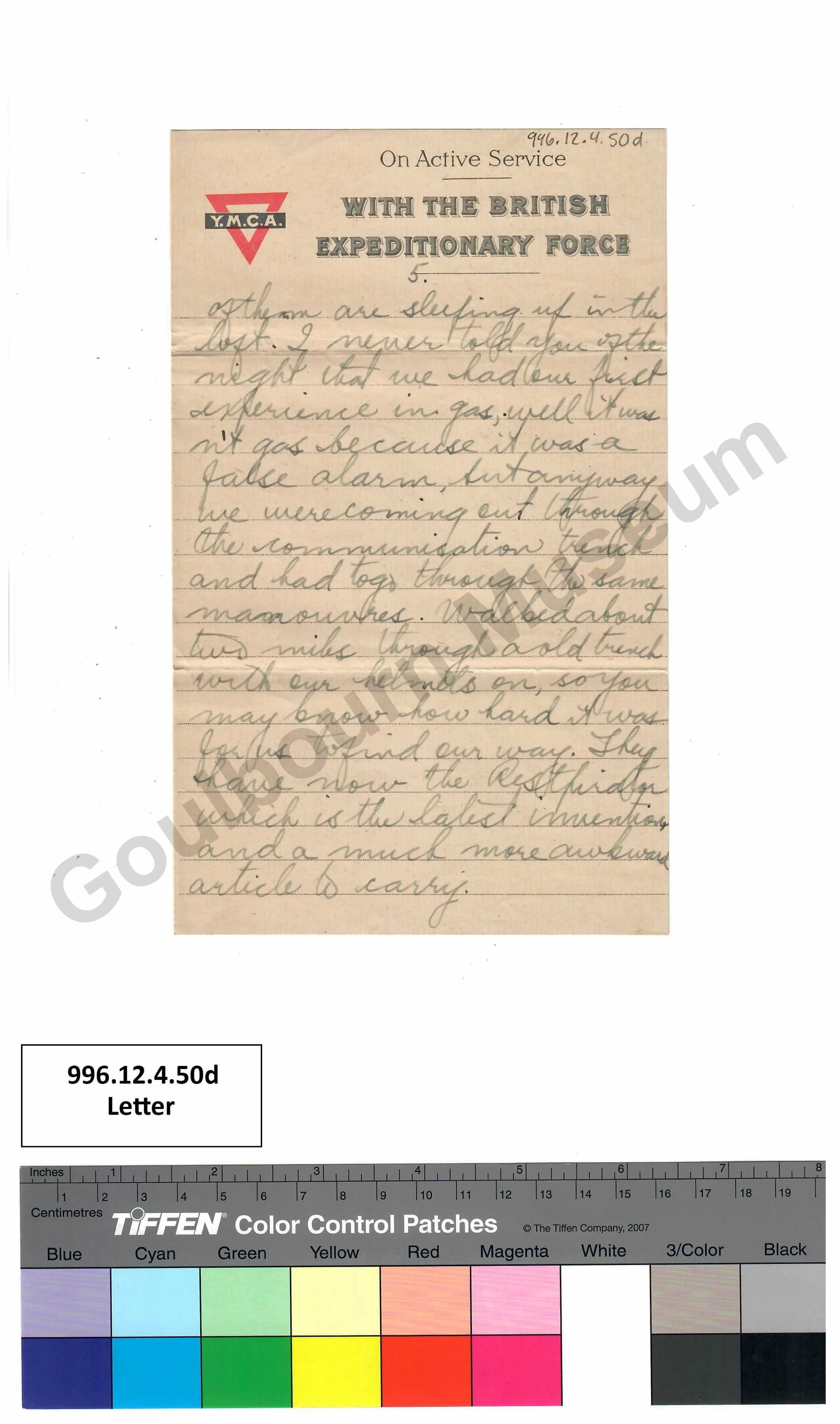 of them are sleeping up in the loft. I never told you of the night that we had our first experience in gas, well it wasn’t gas because it was a false alarm, but anyway we were coming out through the communication trench and had to go through the same manouvres [spelling error: maneuvers]. Walked about two miles through a old trench with our helmets on, so you may know how hard it was for us to find our way. They have now the Restpirator [spelling error: respirator] which is the latest invention, and a much more awkward article to carry.