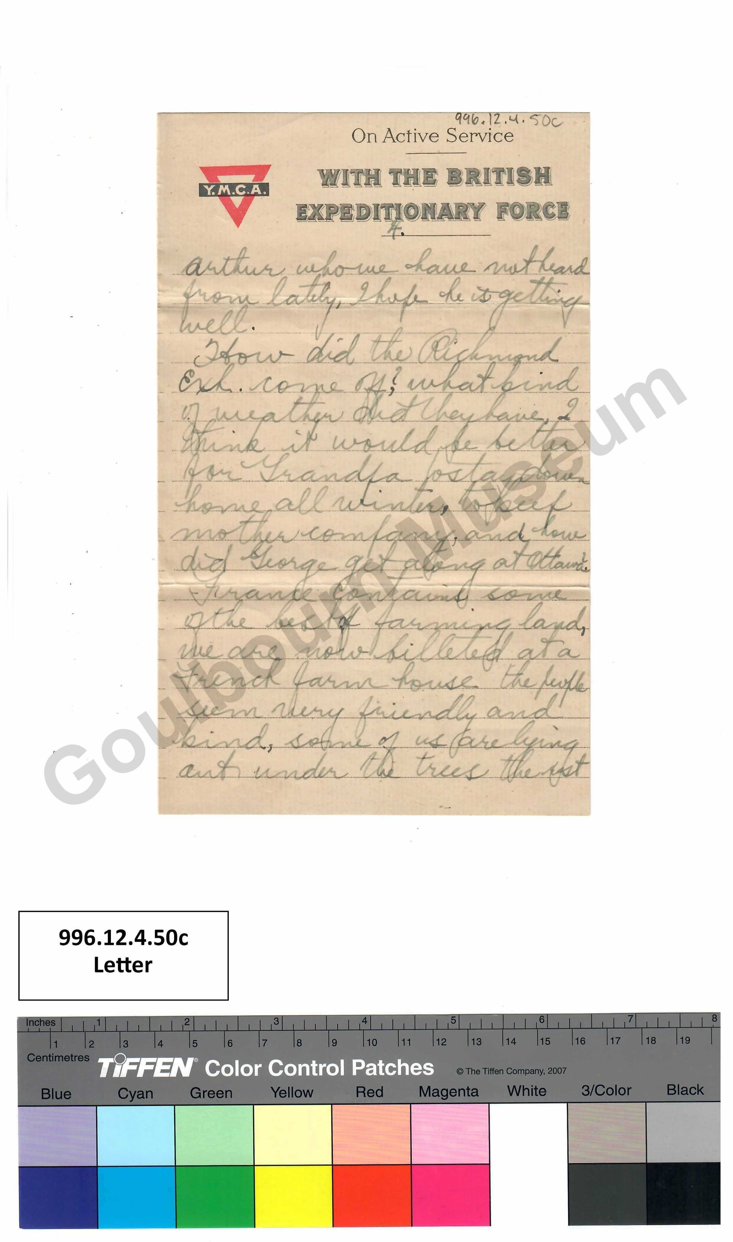 How did the Richmond Exh. come off? What kind of weather did they have, I think it would be better for Grandpa to stay down home all winter, to keep mother company, and how did George get along at Ottawa? France contains some of the best of farming land, we are now billeted at a French farm house the people seem very friendly and kind, some of us are lying out under the trees the rest
