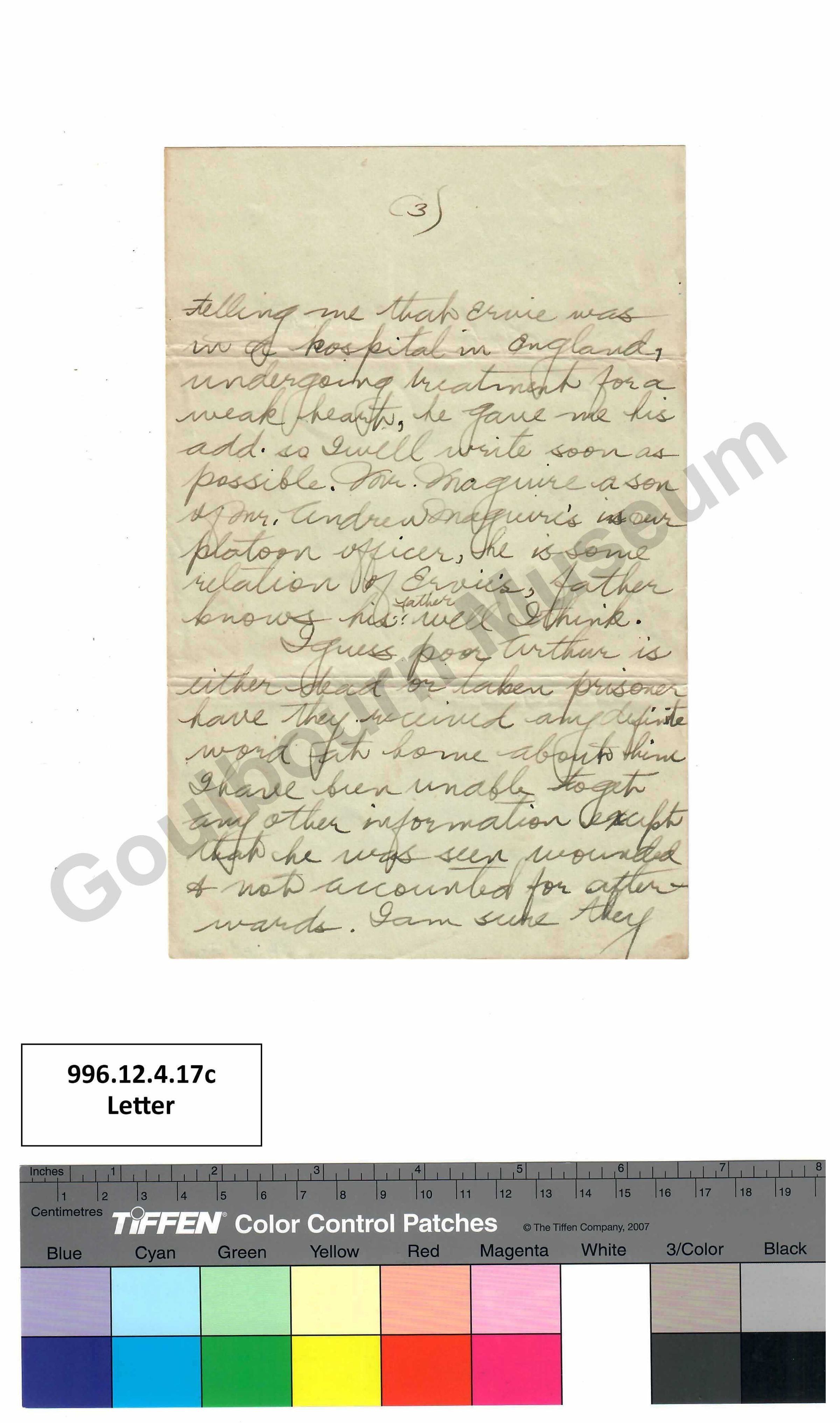 telling me that Ervie was in a hospital in England, undergoing treatment for a weak heart, he gave me his add. [abbreviated: address] so I will write soon as possible. Mr. Maguire a son of Mr. Andrew Maguire’s is our platoon officer, he is some relation of Ervie’s, father knows his father well I think.