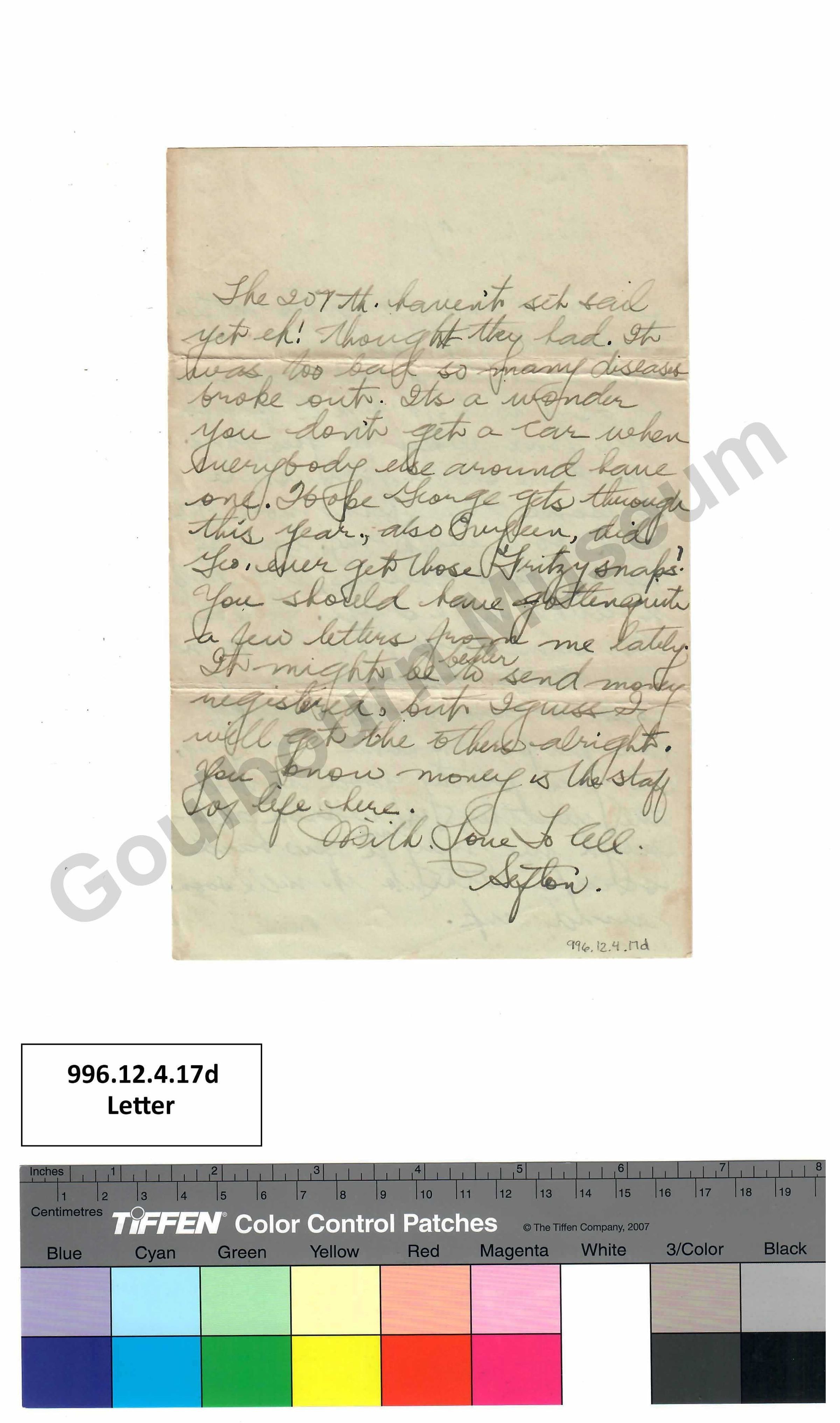 The 207th. haven’t set sail yet eh! Thought they had. It was too bad so many diseases broke out. Its a wonder you don’t get a car when everybody else around have one. Hope George gets through this year, also Evyleen, did Geo. [abbreviated: George] ever get those Fritzy Snaps? You should have gotten quite a few letters from me lately. It might be better to send money registered, but I guess I will get the others alright. You know money is the staff of life here.