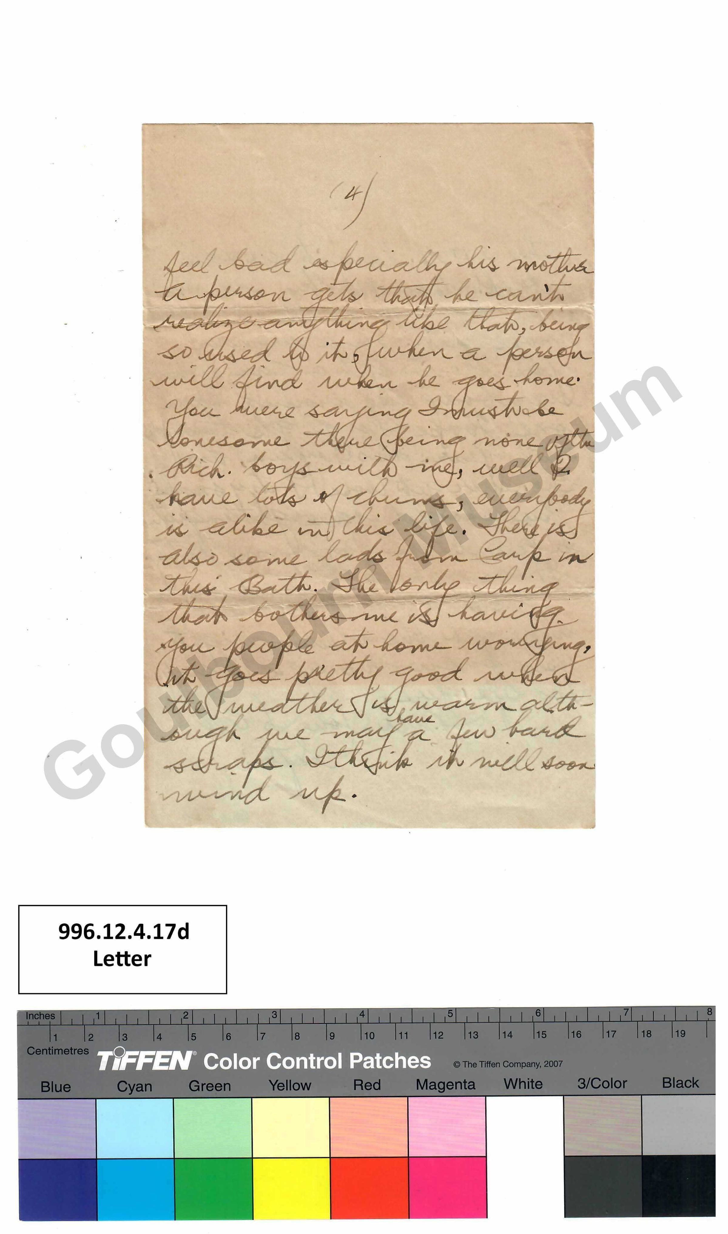 feel bad especially his mother a person gets that he can’t realize anything like that, being so used to it, when a person will find when he goes home. You were saying I must be lonesome there being none of the Rich. [abbreviated: Richmond] boys with me, well I have lots of chums, everybody is alike in this life. There is also some lads from Carp in this Bath. [abbreviated: Battalion]. The only thing that bothers me is having you people at home worrying, it goes pretty good when the weather is warm although we may have a few hard scraps. I think it will soon wind up.