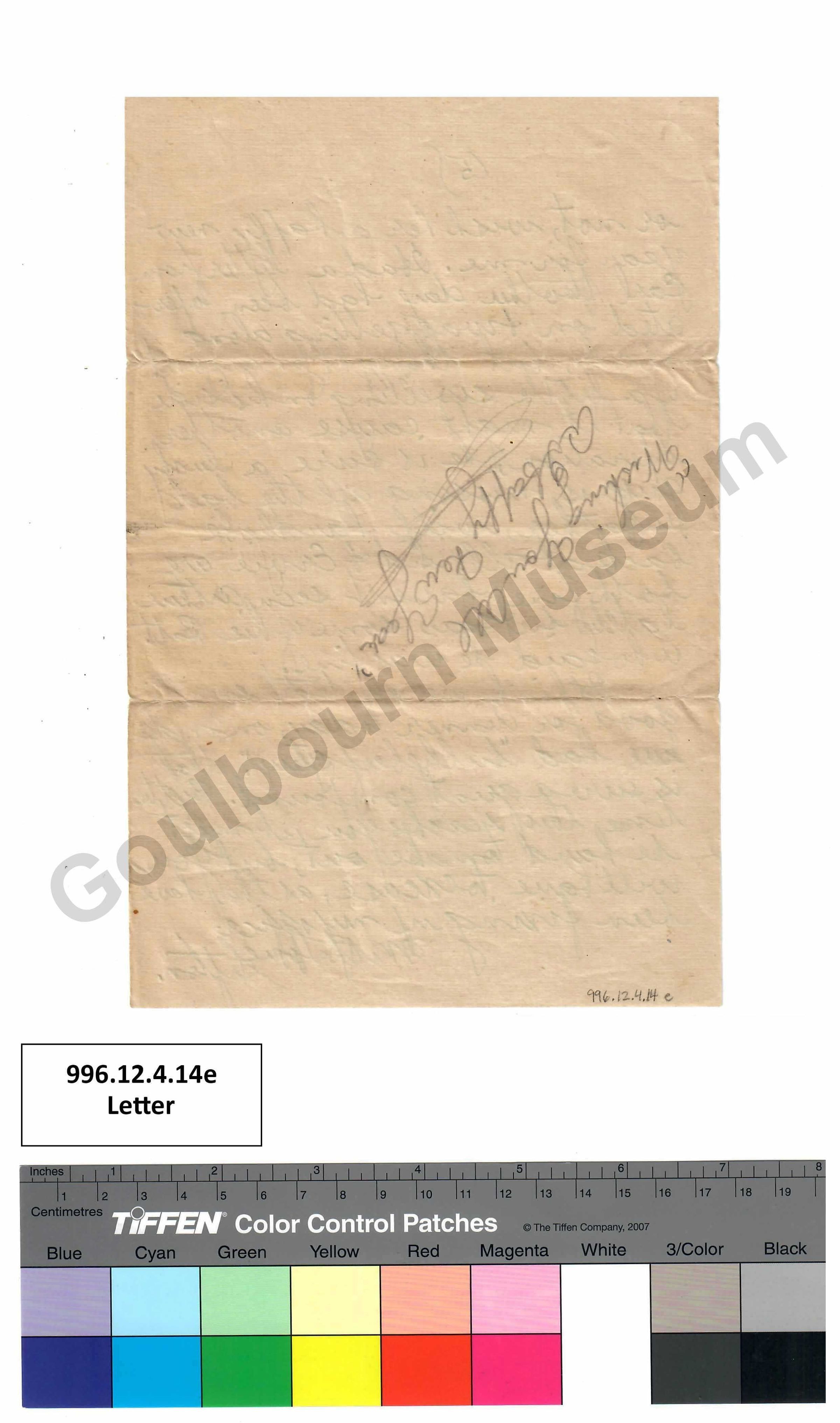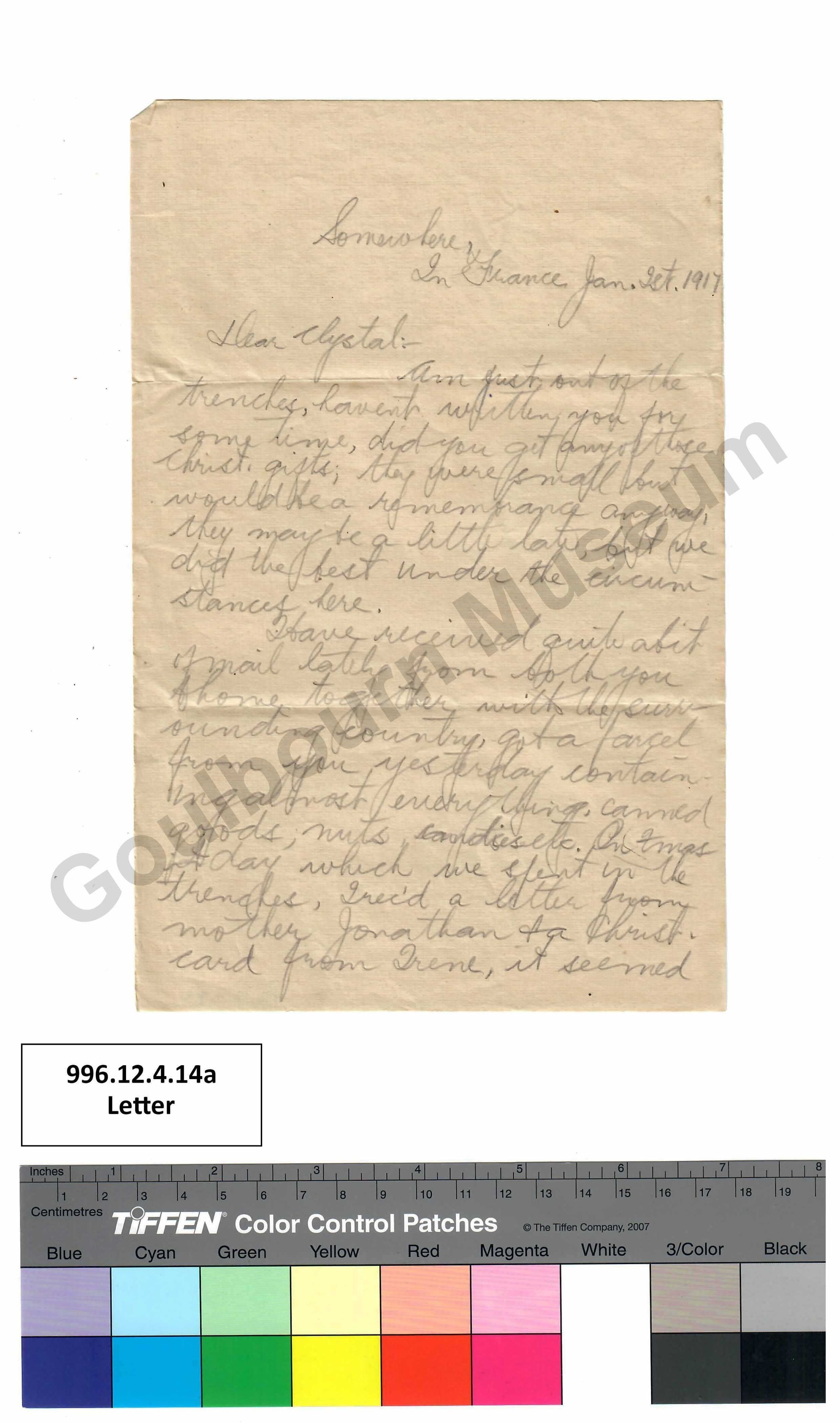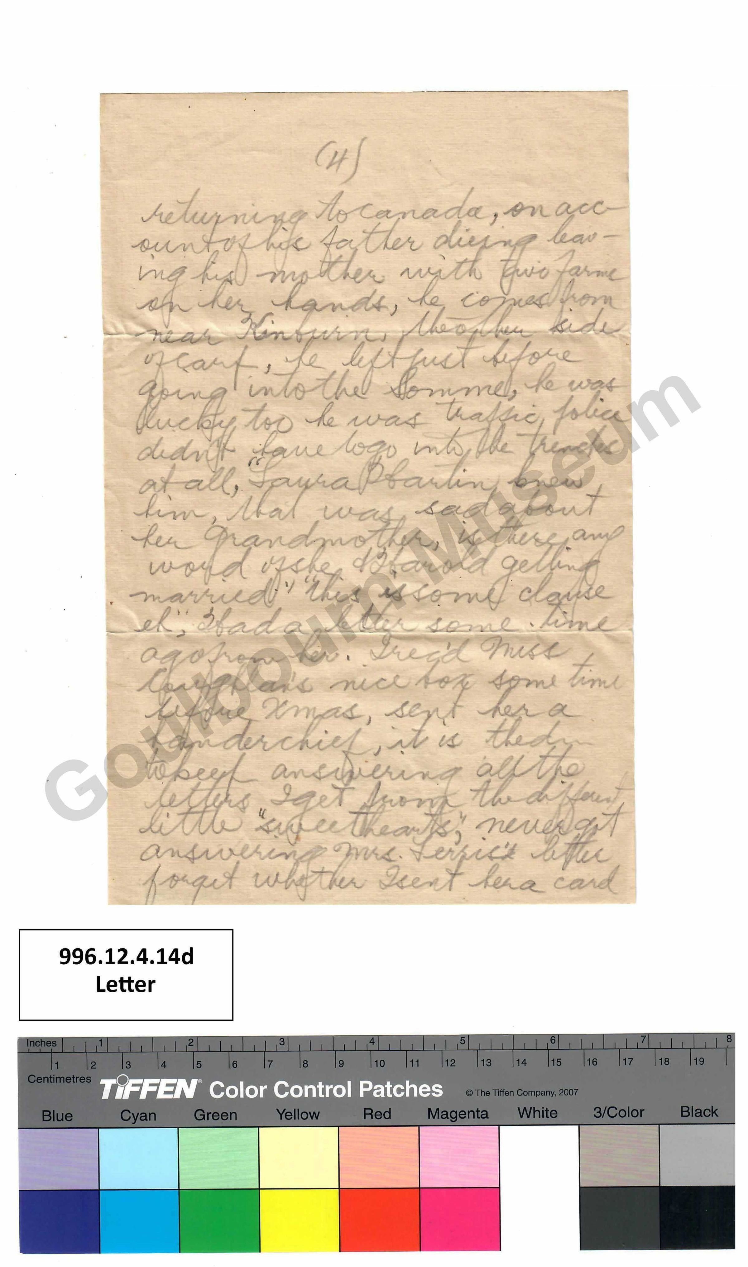 returning to Canada, on account of his father dieing [spelling error: dying] leaving his mother with two farms on her hands, he comes from near Kinburn, the other side of Carp, he left just before going into the Somme, he was lucky too he was traffic, police didn't have to go into the trenches at all, ""Laura Pfartin knew him, that was sad about her Grandmother, is there any word of she + Harold getting married"" ""this is some clause eh,"" I had a letter some time ago from her. I rec'd [abbreviation: received] Miss Coughlan's nice box some time before Xmas [abbreviation: Christmas], sent her a handerchief [spelling error: handkerchief], it is the [indistinguishable]