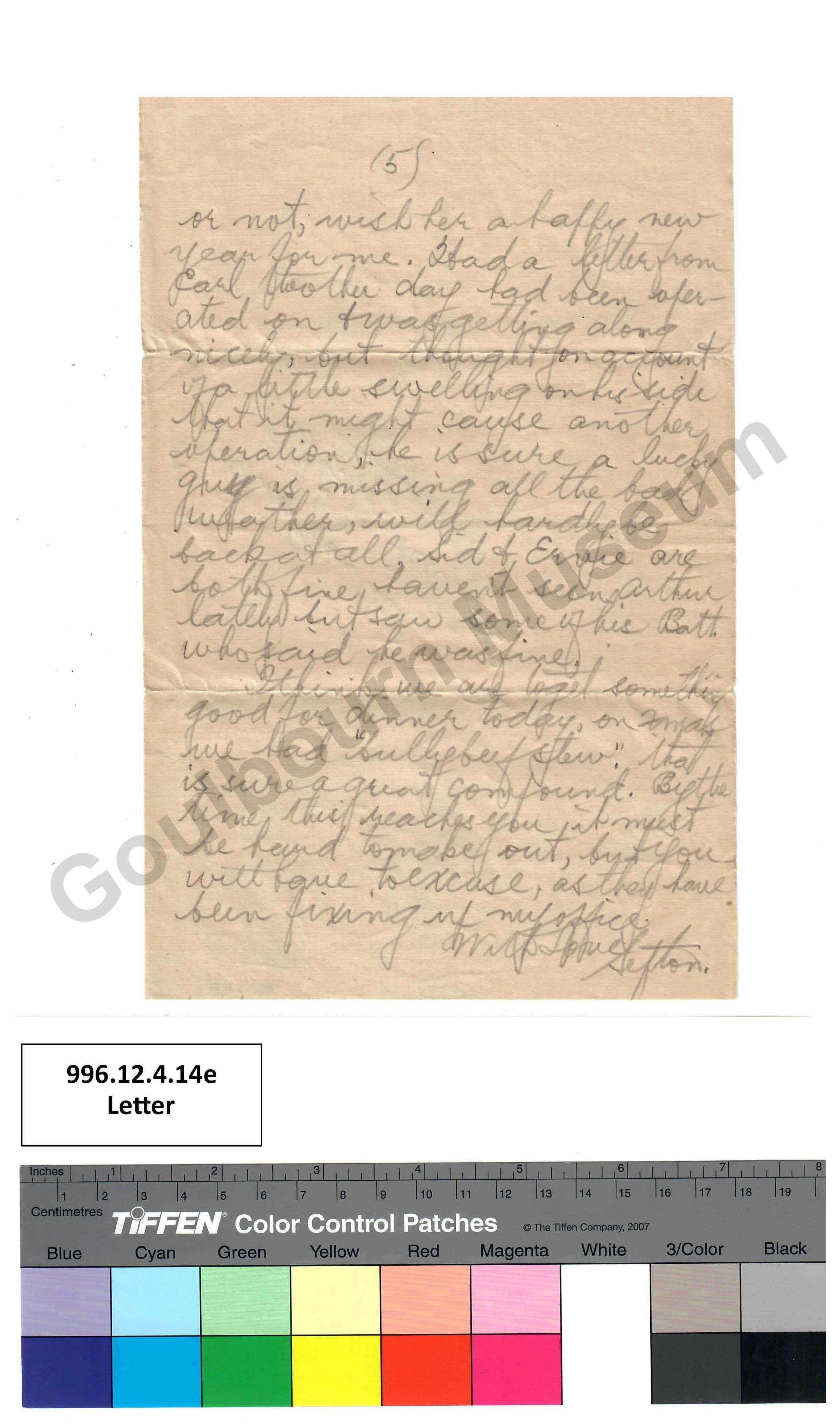 or not wish her a happy new year for me. I had a letter from Earl the other day had been operated on + was getting along nicely, but thought on account of a little swelling on his side that it might cause another operation, he is sure a lucky guy is missing all the bad weather, will hardly be back at all, Sid + Ervie are both fine haven't seen Arthur lately but saw some of his Batt. [abbreviation: Battery] who said he was fine.
