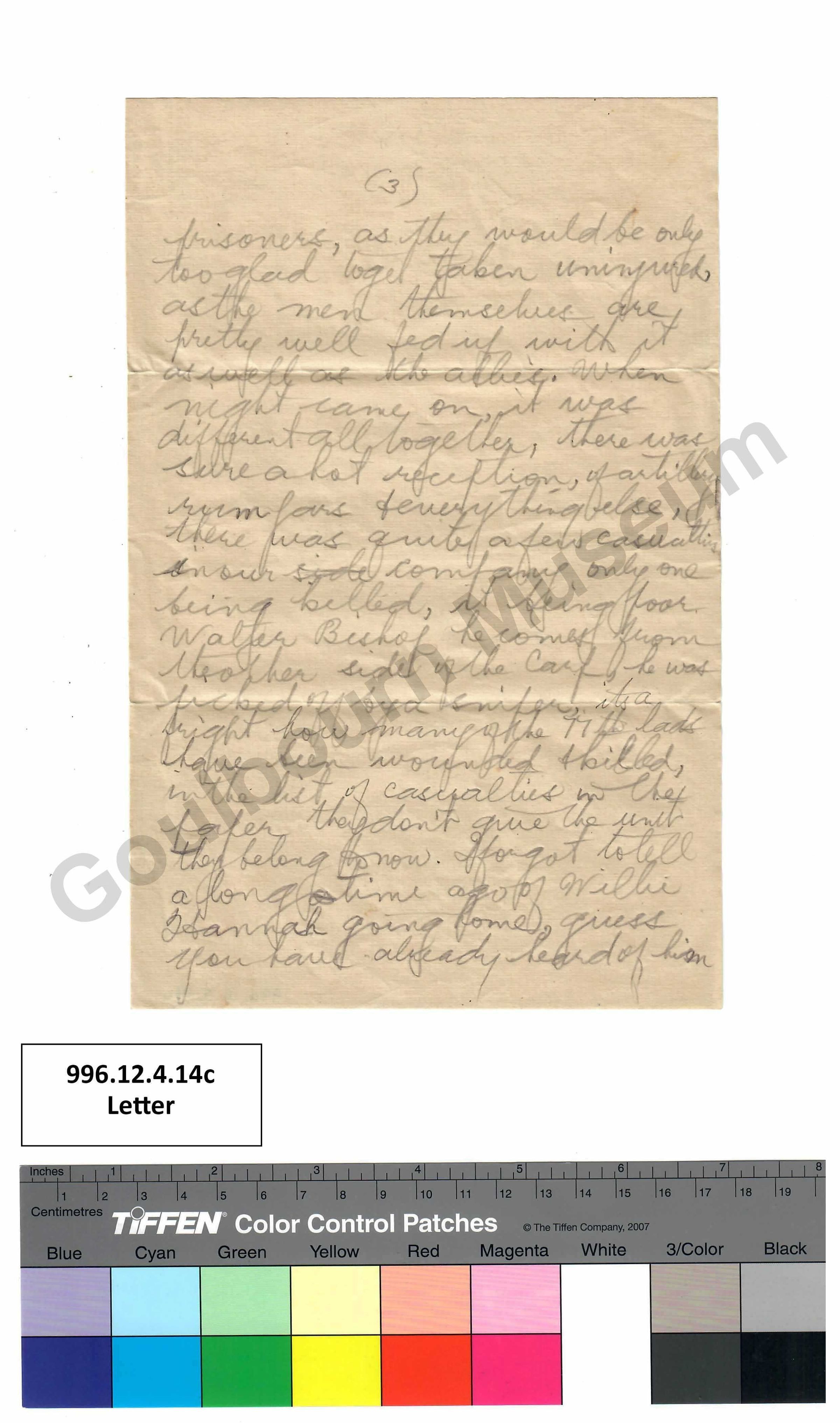 prisoners, as they would be only too glad to get taken uninjured, as the men themselves are pretty well fed up with it as well as the allies. When night came on, it was different all together, there was sure a lot of reception, of artillery rampars [spelling error: ramparts] + everything else, there was quite a few casualties in our [crossed out: side] company, only one being killed, it being poor Walter Bishop he comes from the other side of the Carp, he was picked off by a sniper, its a fright how many of the 77th lads have been wounded + killed, in the list of casulaities in the paper they don't give the unit they belong to now. I forgot to tell a long [crossed out: a] time ago of Willie Hannah going home, guess you have already heard of him