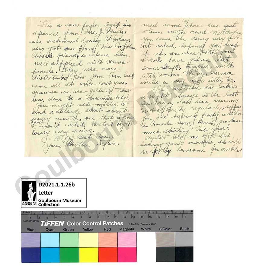 This is some paper I got in a parcel from Mrs. J. Mills. Am acknowledging it today, also got one from Miss Coughlan Clissie’s friend, so I have been well supplied with Xmas [abbreviated: Christmas] parcels. They were more distributed this year than last. came all at once last year, of course we are getting this war done to a business haha!