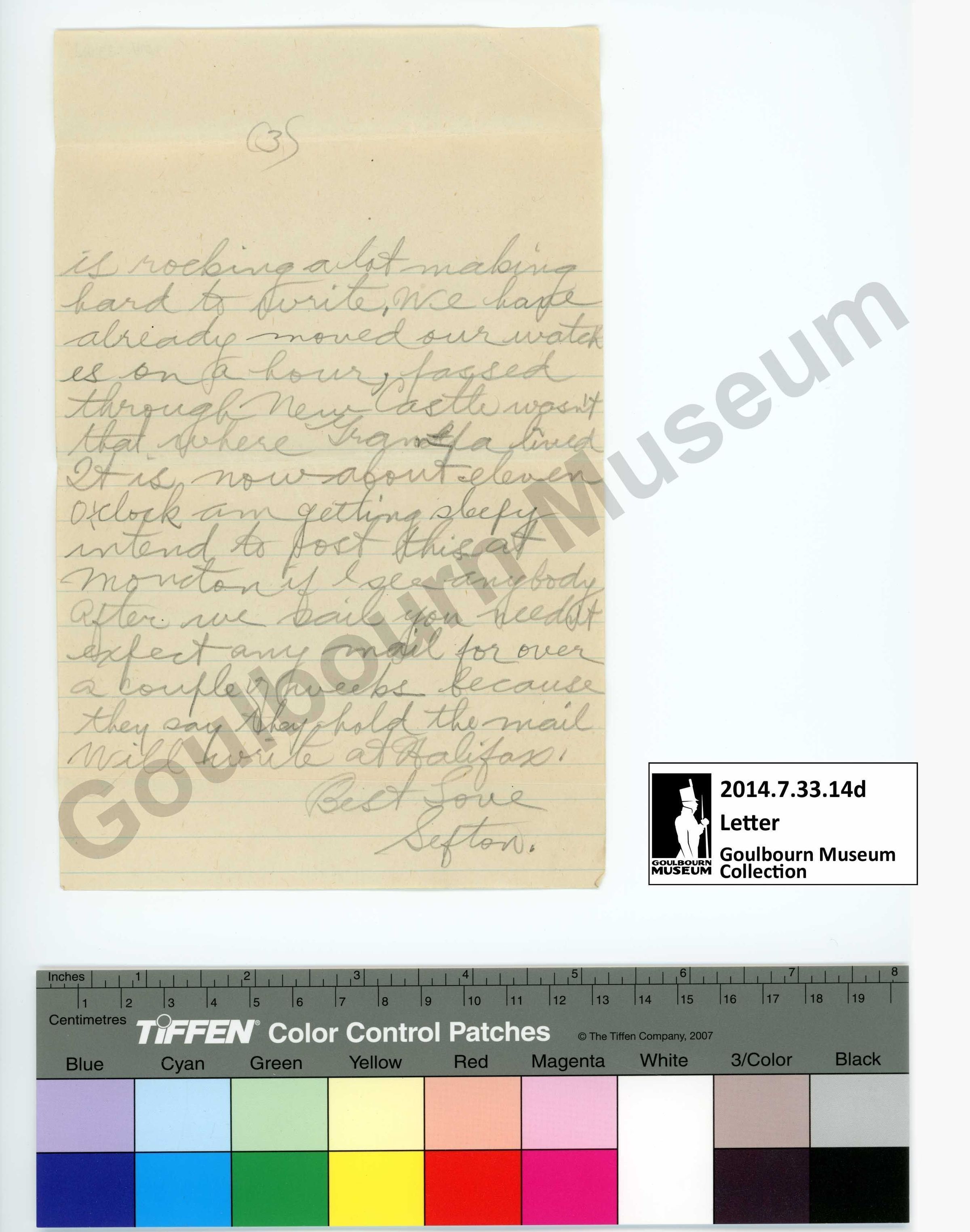 2014.7.33.14d is the third concluding page. The blank space above the lines is empty aside from a "(3)" at the top center. The letter concludes "Will write at Halifax. Best Love Sefton."Subject Person/Organization