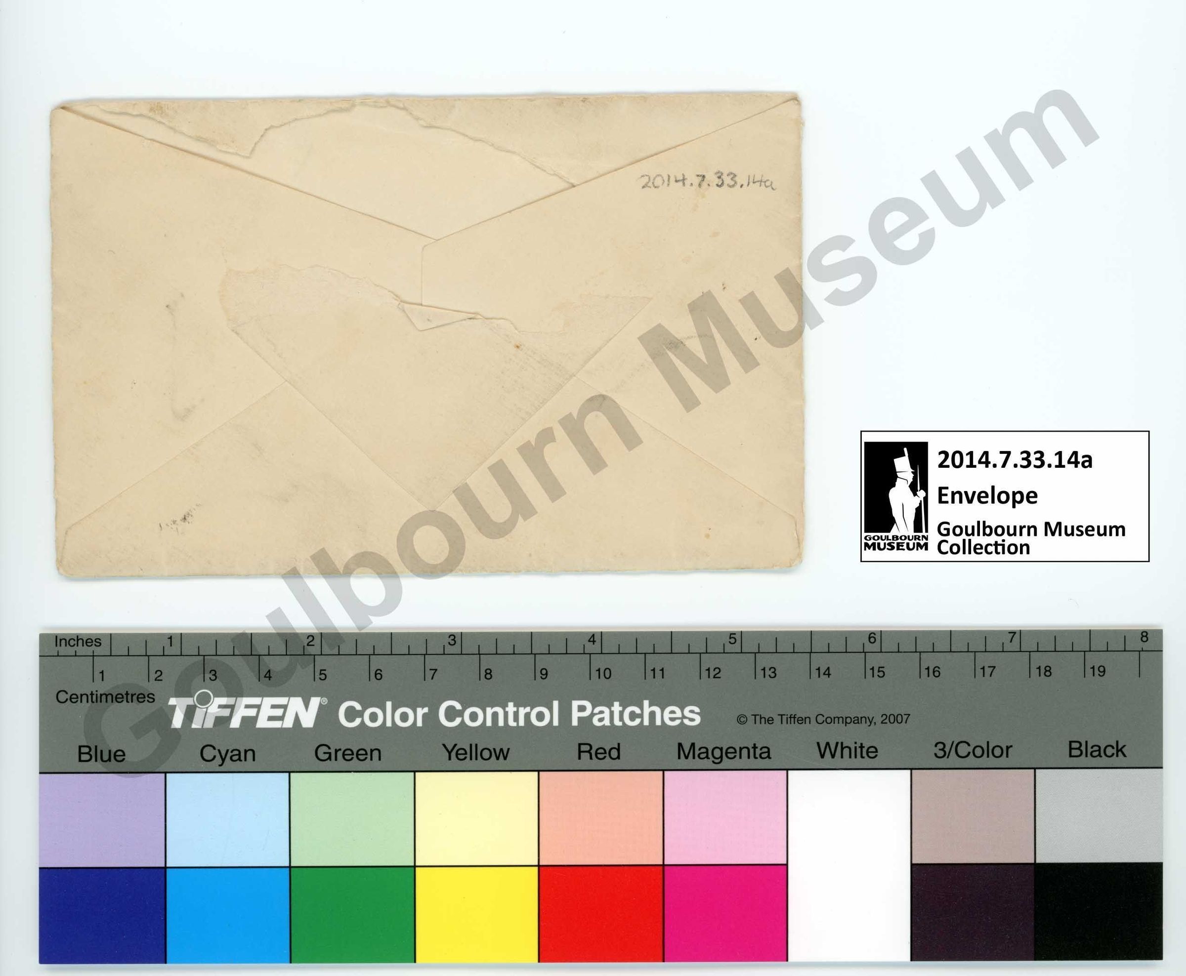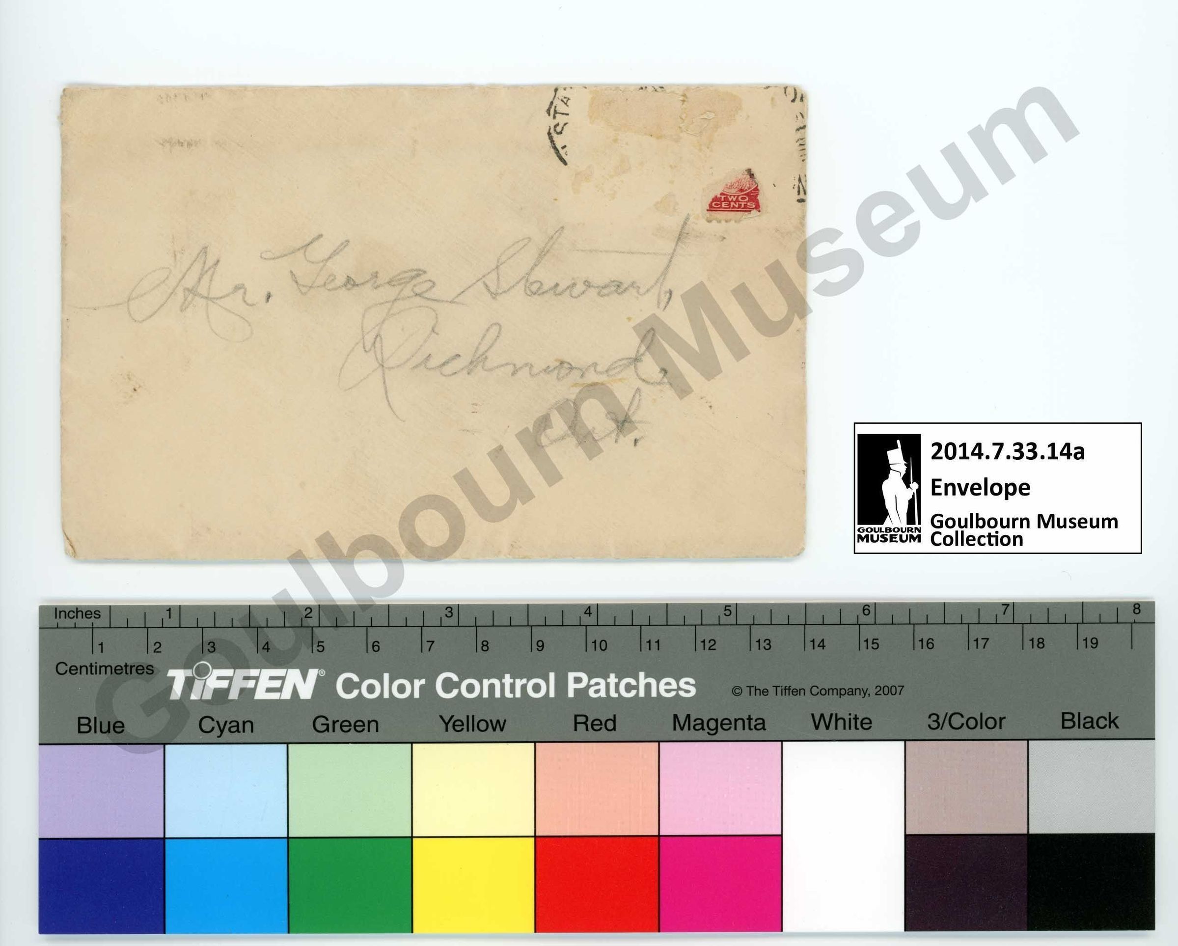 2014.7.33.14a, the envelope, is made of a tan/cream coloured paper which has been folded into shape. It is held together with an unknown adhesive. There is a handwritten inscription in pencil on the front rendered in cursive which reads "Mr. George Stewart, Richmond, Ont." The fragmentary remains of a postage stamp is visible in the proper top left corner of the front; this presents as a small piece of red paper with ragged edges in which the words "two cents" are visible. There are two partial rubber stamp imprints rendered in black ink in the proper top left corner. These overlay the postage stamp and were subsequently severely damaged and lost with the removal of the stamp. The identifiable partial remains of one indicate a partial circle with the letters "STA" visible. The back of the envelope is blank.