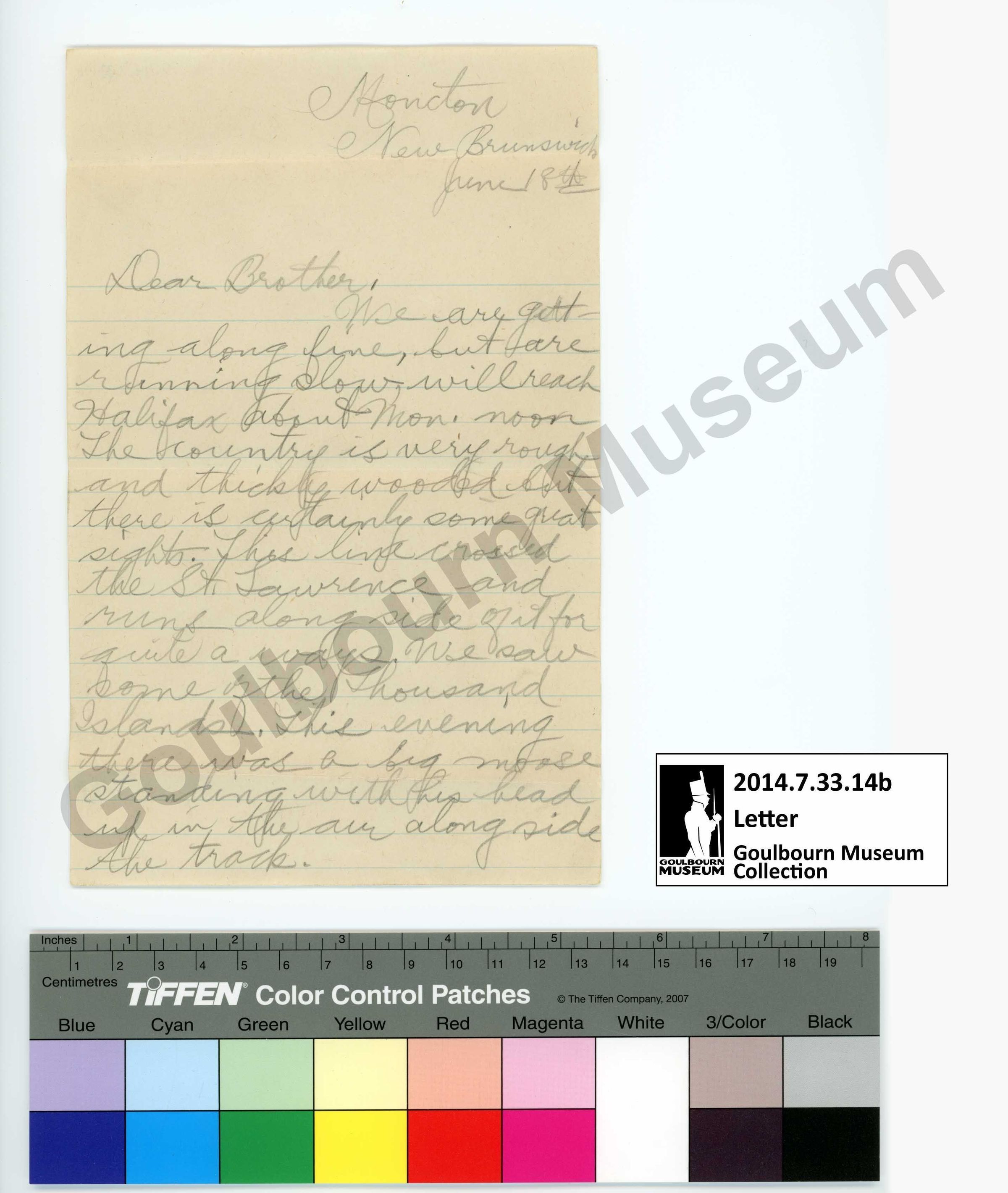 2014.7.33.14b contains the first page. The blank space above the lines contains the phrase "Moncton, Mew Brunswick June 18th".