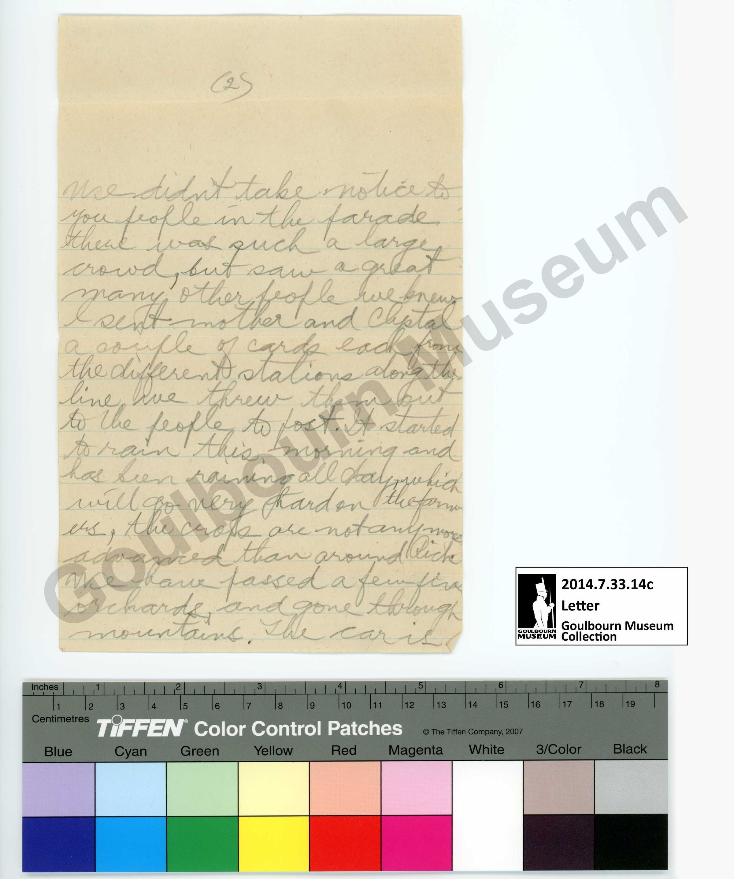 We didn't take notice to you people in the parade there was such a large crowd, but saw a great many other people we knew. I sent mother and Clystal a couple of cards each from the different stations along the line, we threw them out to the people to post. It started to rain this morning and has been raining all day, which will go very hard on the farmers, the crops are not any more advanced than around Rich [abbreviated: Richmond] We have passed a few fru [fruit] orchards, and gone through mountains. The car is