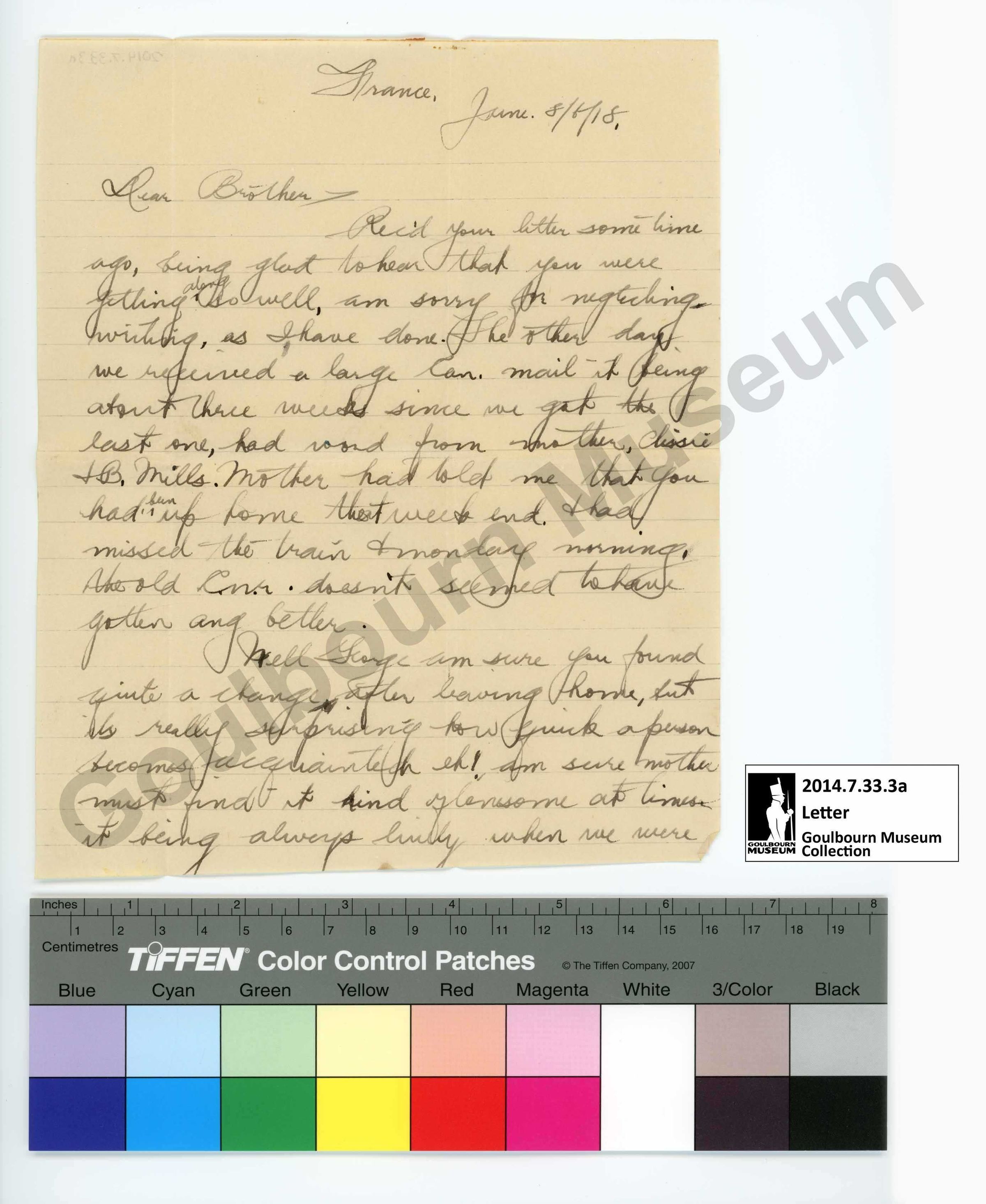This object is a letter which spans a single face of two separate sheets of lined paper. Both supports are an identical tan colored paper with thin black horizontal lines. The medium is a handwritten black ink rendered in cursive. 2014.7.33.3a is the first page and bears "France, June 8/1918," at top. 2014.7.33.3b is the second page, the front of which is entirely covered in script; there is a "(2)" at the top center. Both pages are blank on the back.Subject Person/Organization