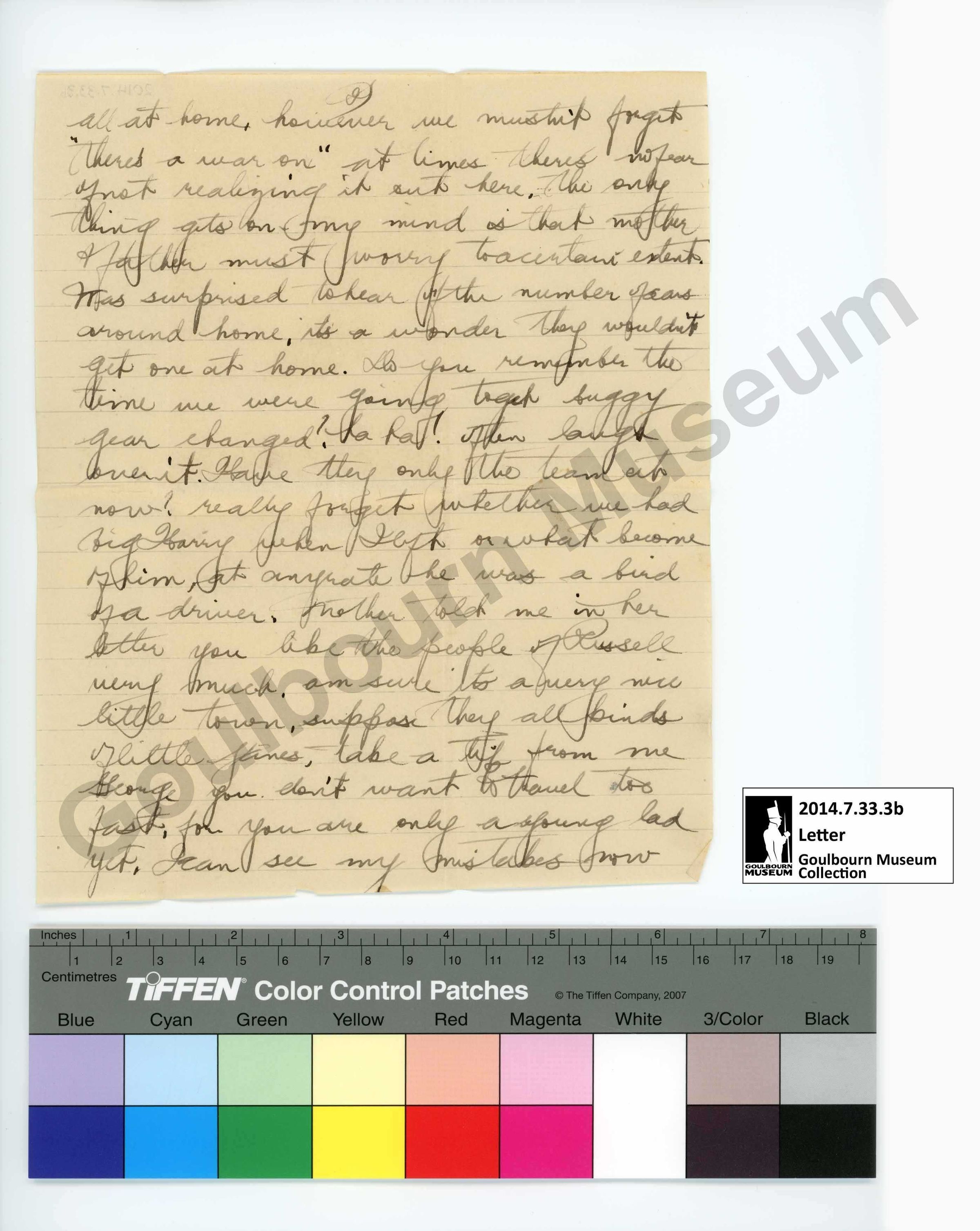 all at home, however we mustn't forget ""there's a war on"" at times there's no fear of not realizing it out here, the only thing gets on my mind is that mother + father must worry to a certain extent. Was surprised to hear of the number of cars around home, it's a wonder they wouldn't get one at home. Do you remember the time we were going to get buggy gear changed? ha ha! often laugh over it. Have they only the team [out] now? really forget whether we had big Harry when I left or what become of him, at any rate he was a bird of a driver. Mother told me in her letter you like the people of Russell very much. am sure its a very nice little town, suppose they all kinds of little [Janes], take a tip from me George you don't want to travel too fast, for you are only a young lad yet. I can see my mistakes nowTranscriber